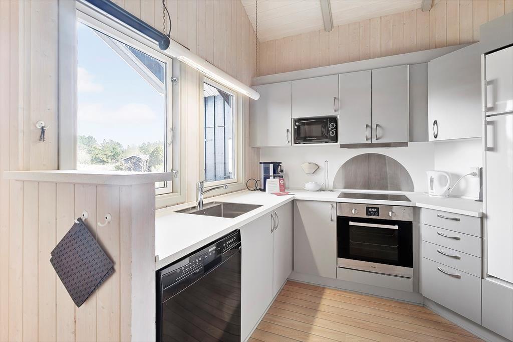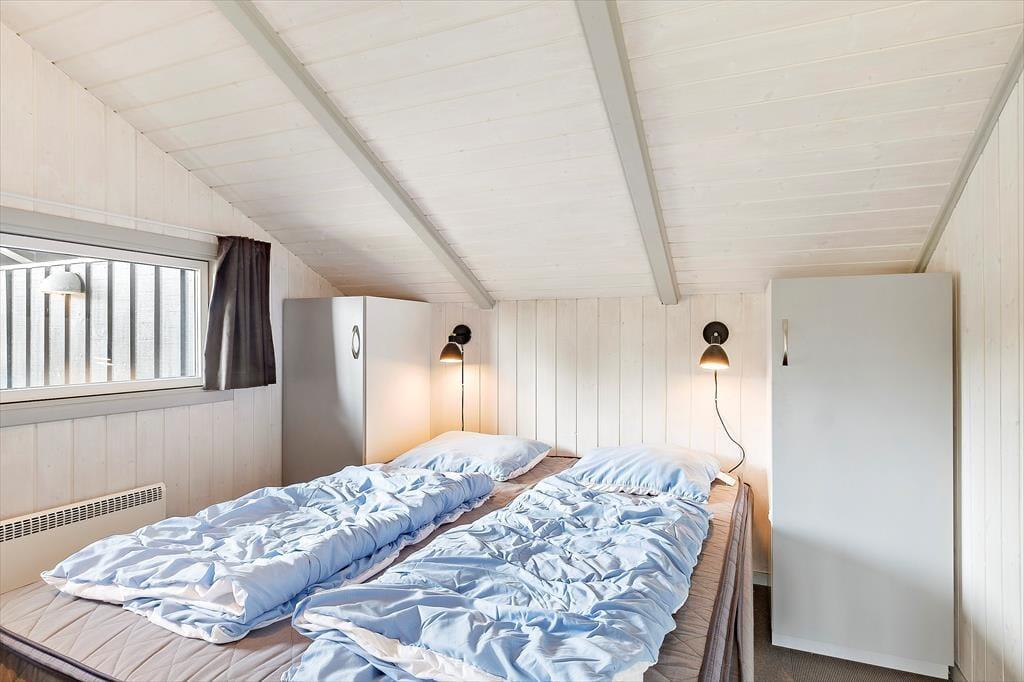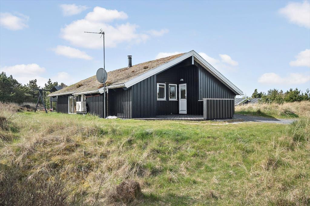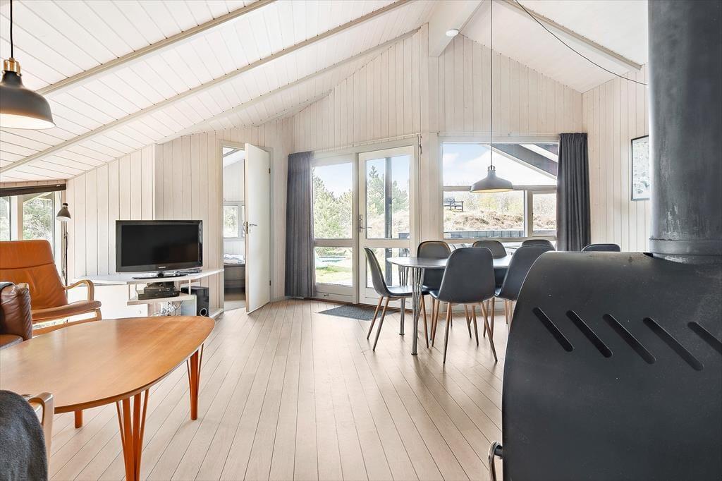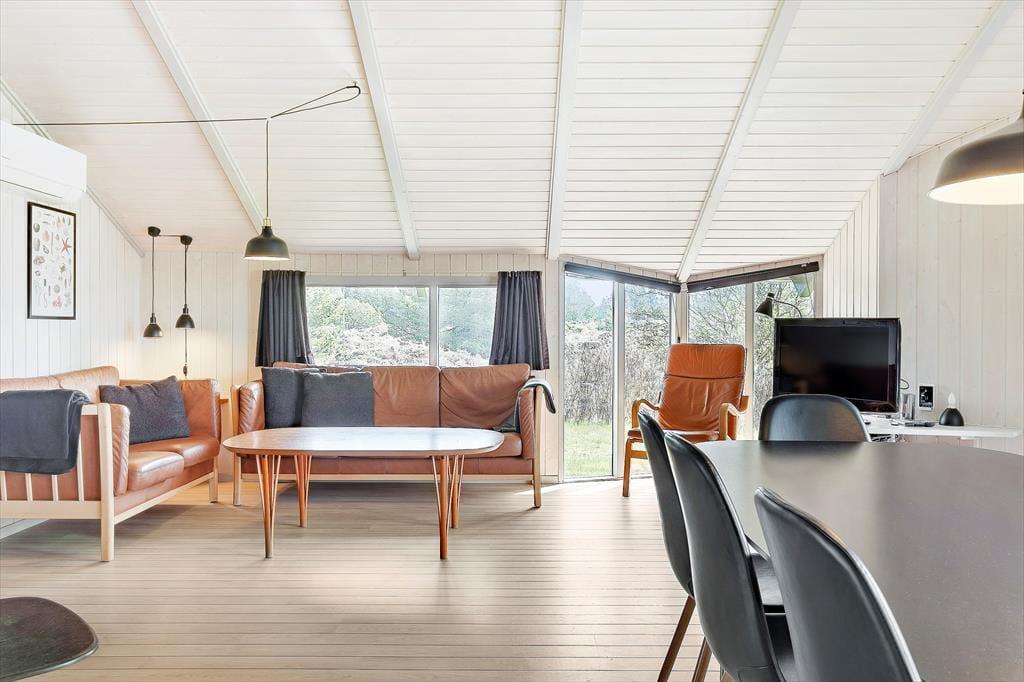 Inden døre er kvadratmeterne fornuftigt udnyttet, og planløsningen er gennemtænkt. 3 soveværelse er placeret i hver sin ende af huset, og i alt kan de rumme 6 personer. Når I er mange samlet, er det for øvrigt rart, at et gæstetoilet supplerer badeværelset, som er udstyret med vaskemaskine og tørretumbler såvel som spabad og sauna. Samlingspunktet i sommerhuset er en dejlig stue med loft til kip, brændeovn og åben forbindelse til et veludstyret køkken. Uanset om I står og forbereder aftensmaden i køkkenafdelingen eller slapper af i sofaerne, har I udsigt gennem vinduerne til det smukke hede landskab, der omgiver sommerhuset – og sådan et bagtæppe er bestemt med til at understrege den gode feriestemning.