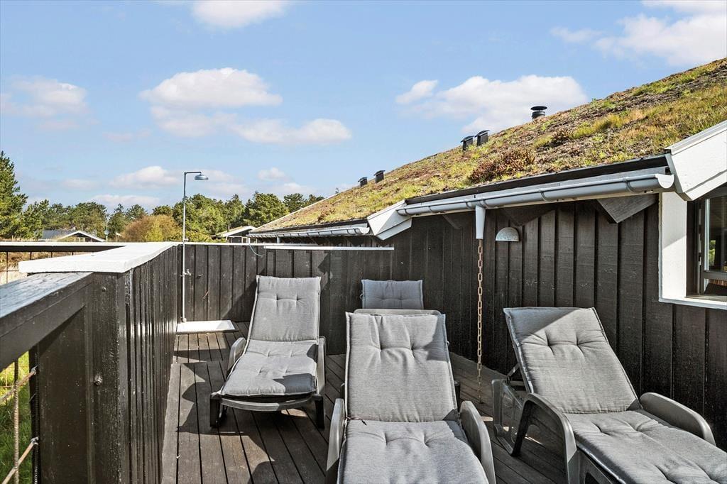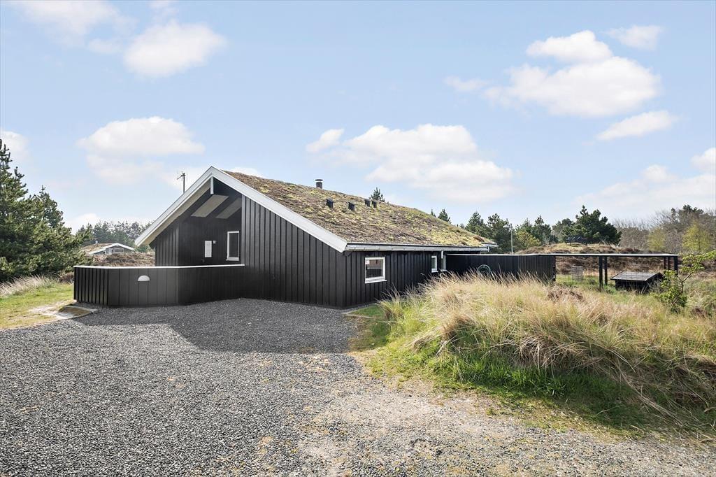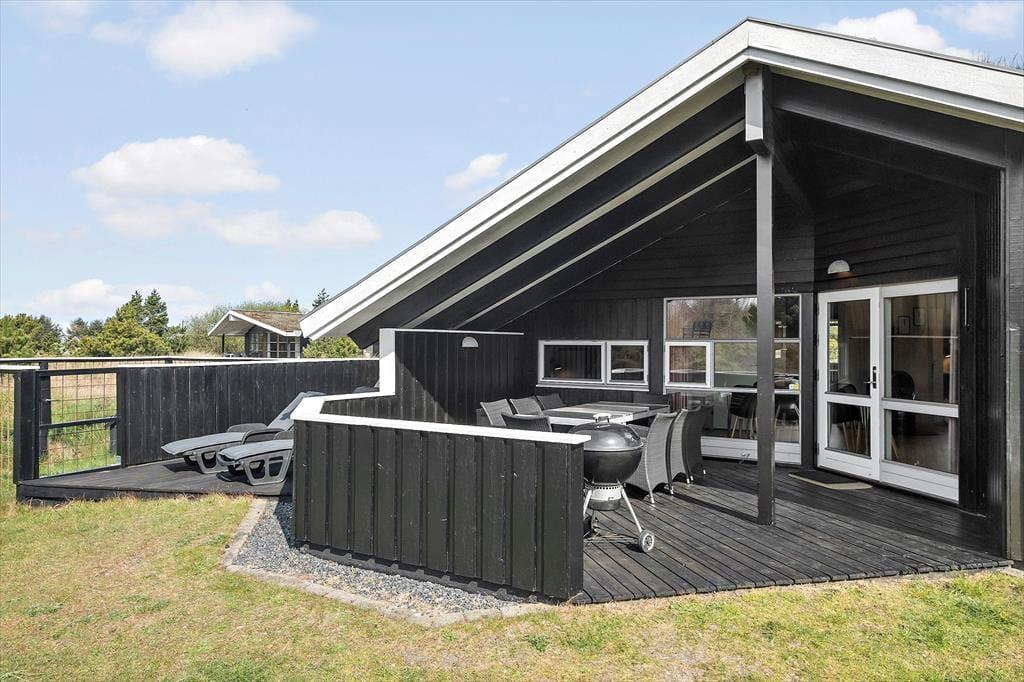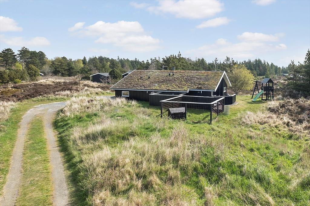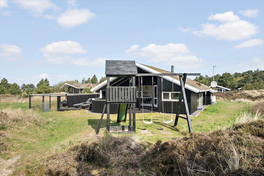 Husets hundevenlige faciliteter kan især ses ude i det fri, hvor en hundegård er placeret midt på den 2500 m2 store, kuperede naturgrund, og hvis I vil holde vovsen med selskab, kan I slå jer ned på den tilstødende vestvendte terrasse. Omkring sommerhuset er der desuden flere dejlige og delvist overdækkede terrasser at vælge imellem, og på toppen af en klit står der en bænk, hvorfra I kan skue ud over Bolilmarks smukke naturomgivelser. Til børnene er der sandkasse, trampolin og et legetårn med gynger, og de vandglade vil sætte pris på det lille badebassin og den udendørs bruser.