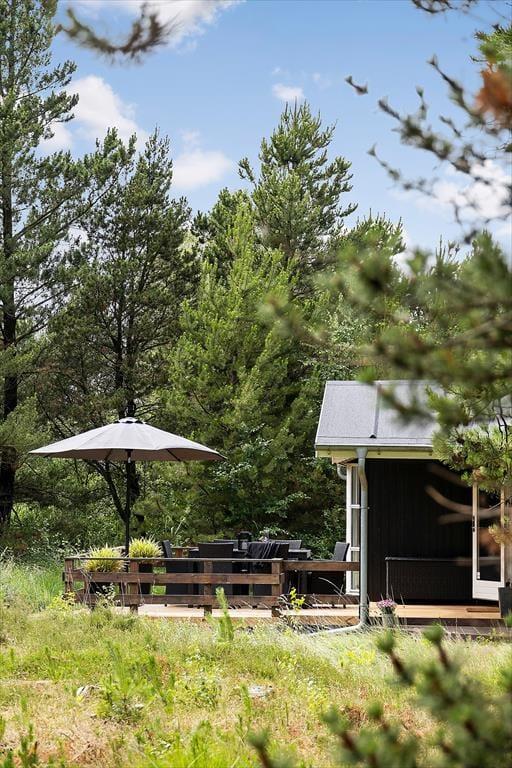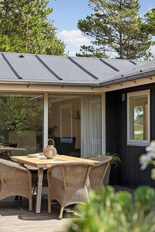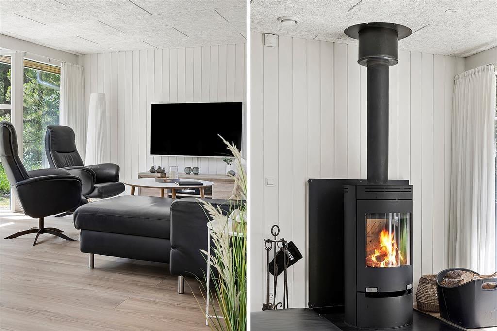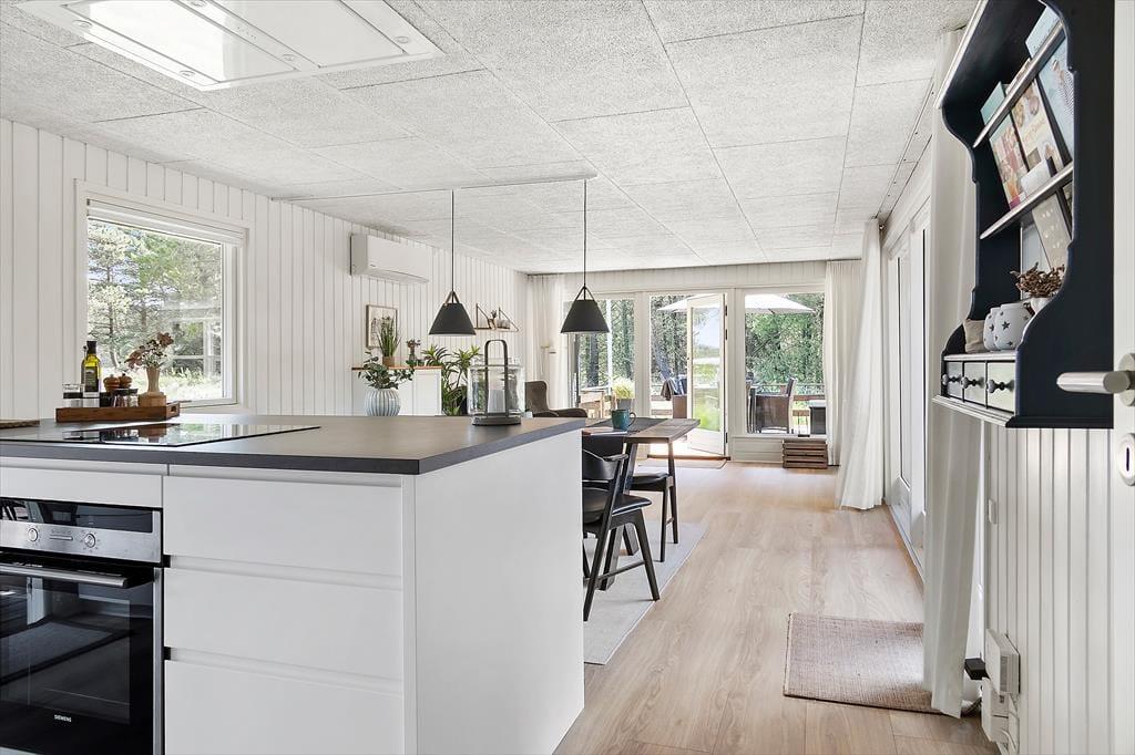 Sommerhuset er opført 1974 med tagpap og mørk træfacade, så det passer smukt ind i de naturskønne omgivelser. Den grønne udsigt får I også mulighed for at nyde, når I hygger jer indenfor nær brændeovnen, for stuens store vinduespartier giver frit udsyn til naturgrundens flotte træer. Ejendommen blev omsorgsfuldt renoveret i 2019 og er udstyret med bekvemmeligheder som varmepumpe, et moderne køkken og stilfuldt inventar. Samtidig kan den originale charme stadig mærkes, så atmosfæren er virkelig i top i sommerhusets lyse rum. Planløsningen byder blandt andet på to gode værelser og et pænt badeværelse, der er indrettet med gulvvarme, vaskemaskine og tørretumbler. Det førnævnte flotte køkken er integreret med stuen, og alt i alt er det et herligt opholdsrum, hvor I har god plads til at hygge jer og nyde ferielivet.