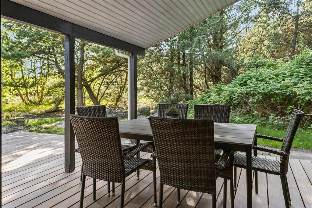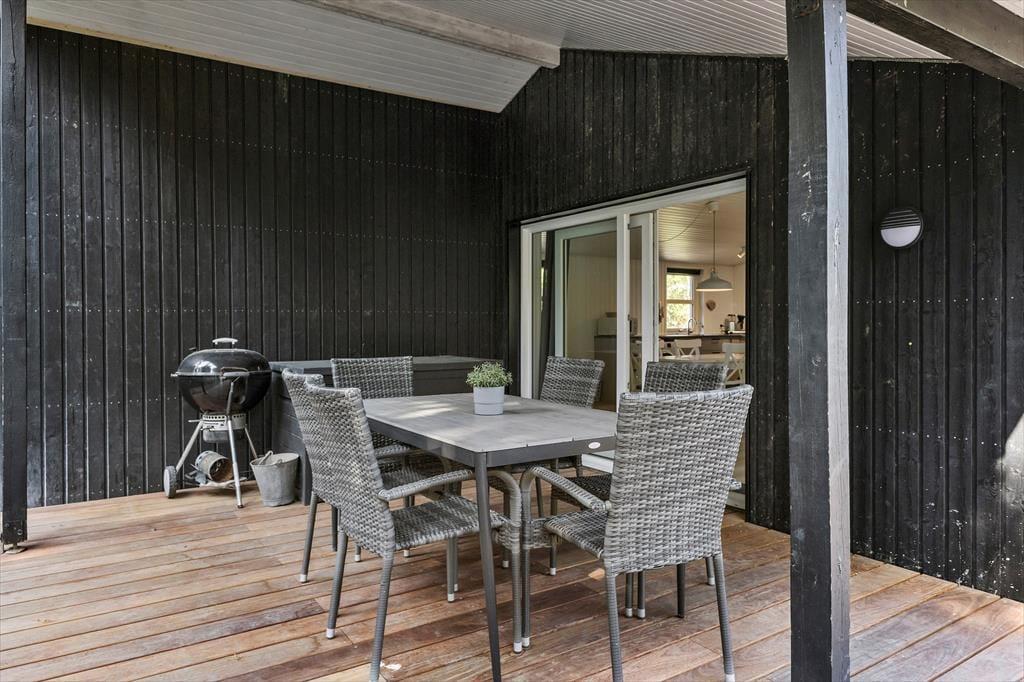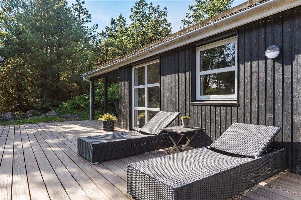 Når driverlivet ikke finder sted i stuens sofaafdeling eller i saunaen, kan det passende foregå ude i det fri på den sydvendte træterrasse. Her er både overdækkede og helt åbne terrasseområder, og der er liggestole, havemøbler og grill til rådighed, så I virkelig kan hygge jer med solbadning, siestaer og udendørs madlavning. Naturgrunden er dejligt ugeneret, takket være de flotte træer og den øvrige frodige beplantning.