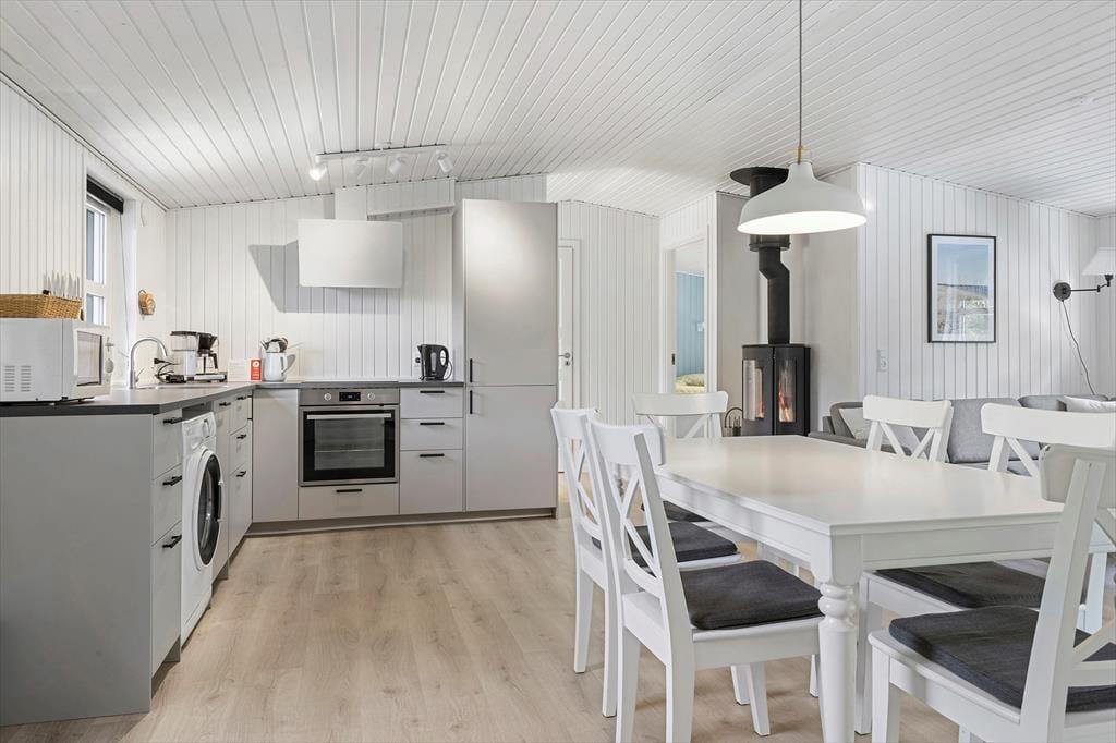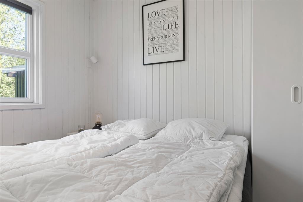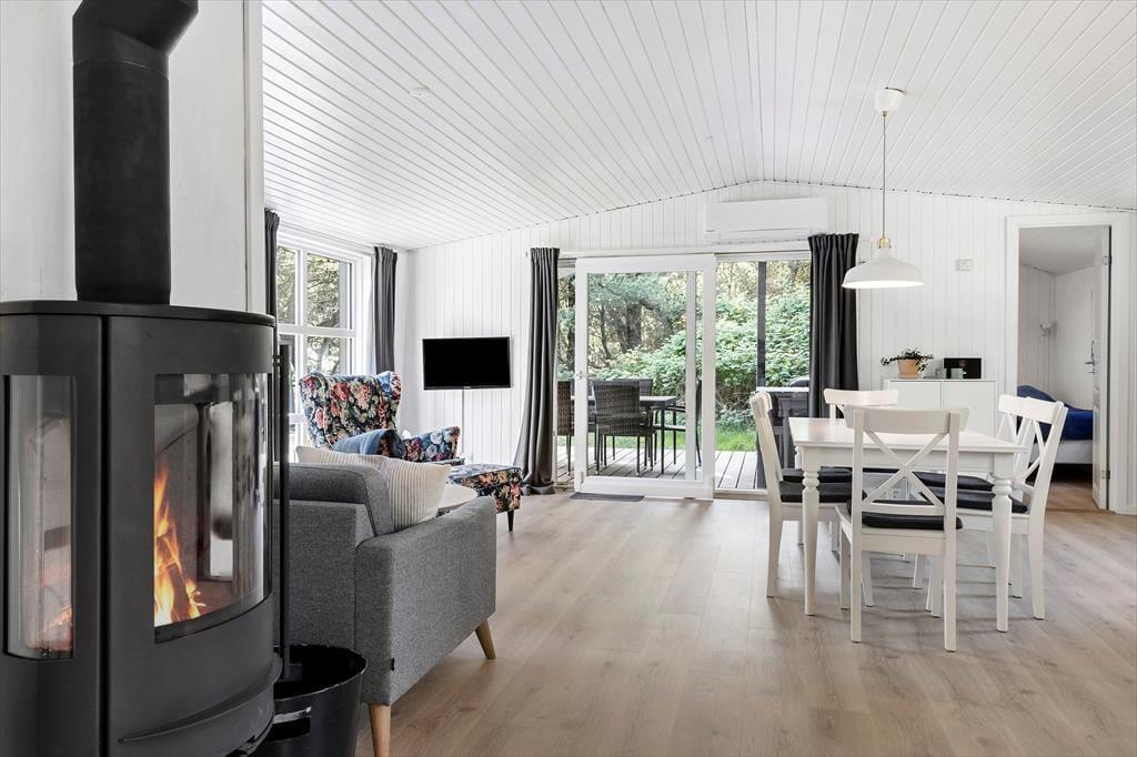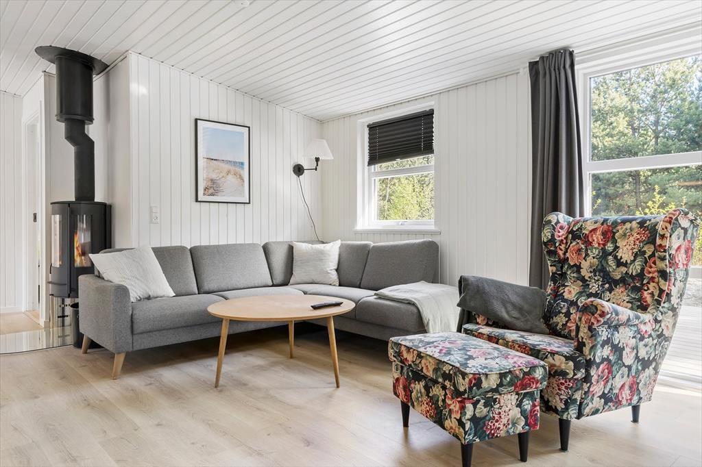 Sommerhuset præsenterer sig på køn og klassisk vis med grønt tag, mørk træfacade og hvide vinduesrammer. Inden døre er sommerhuscharmen også i top, for her er der lyse trælister på væggene og loft til kip, og en brændeovn er med til at skrue op for både varmen og hyggestemningen. I opholdsrummet er stue og køkken forenet, så selvom aftensmaden skal forberedes, kan I sagtens tage del i familiehyggen. Udover et badeværelse byder planløsningen også på en sauna, så efter dagens udflugter kan I se frem til at læne jer tilbage og slappe helt af, mens I bliver varmet igennem. Når det er sengetid, kan I fordele jer på de tre soveværelser, hvoraf et er udstyret med dobbeltseng og to med hver især to enkeltsenge.