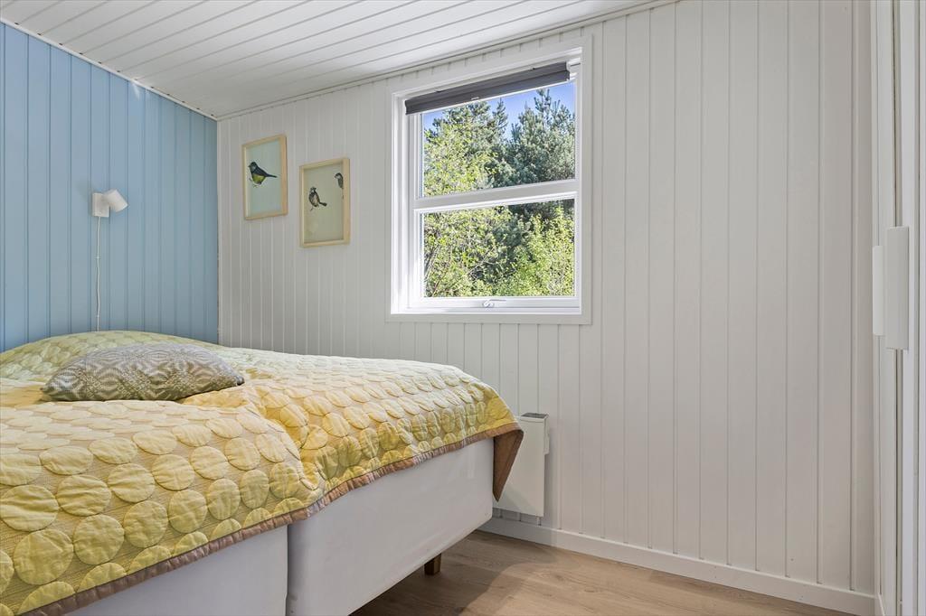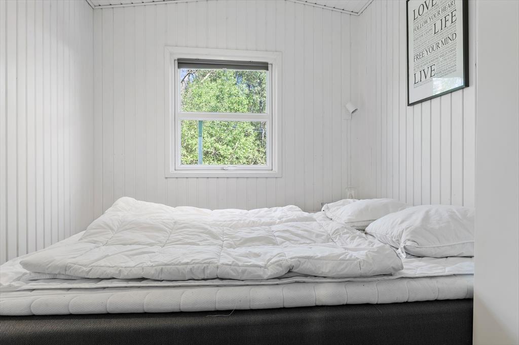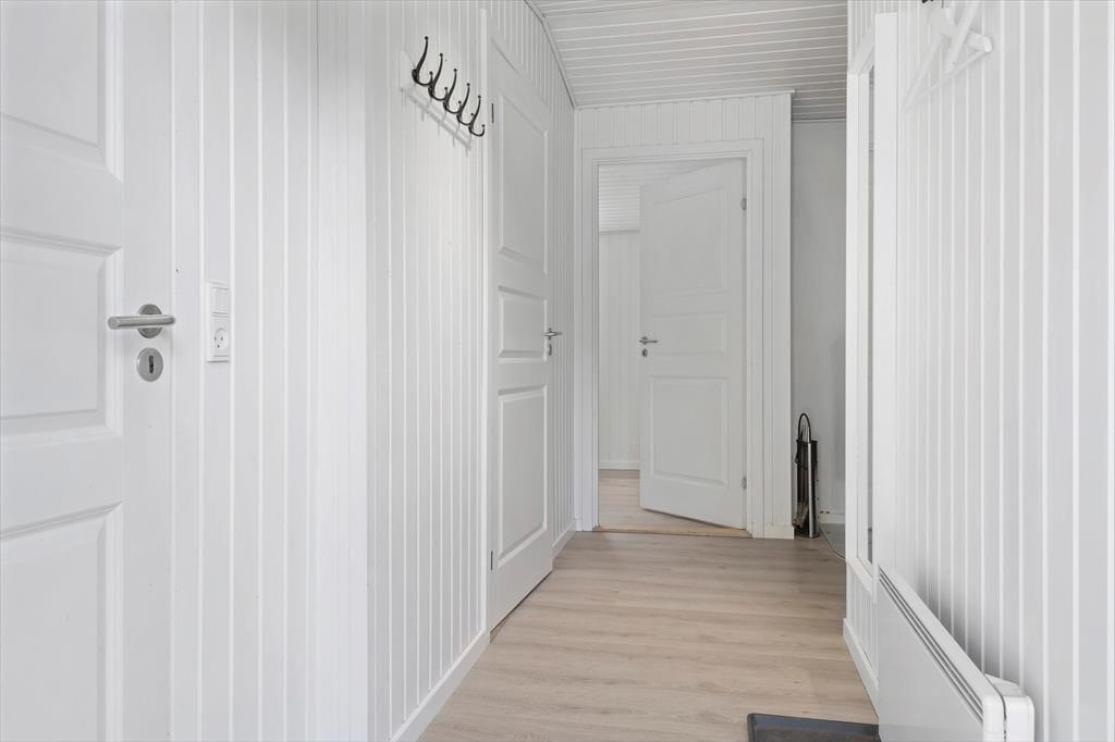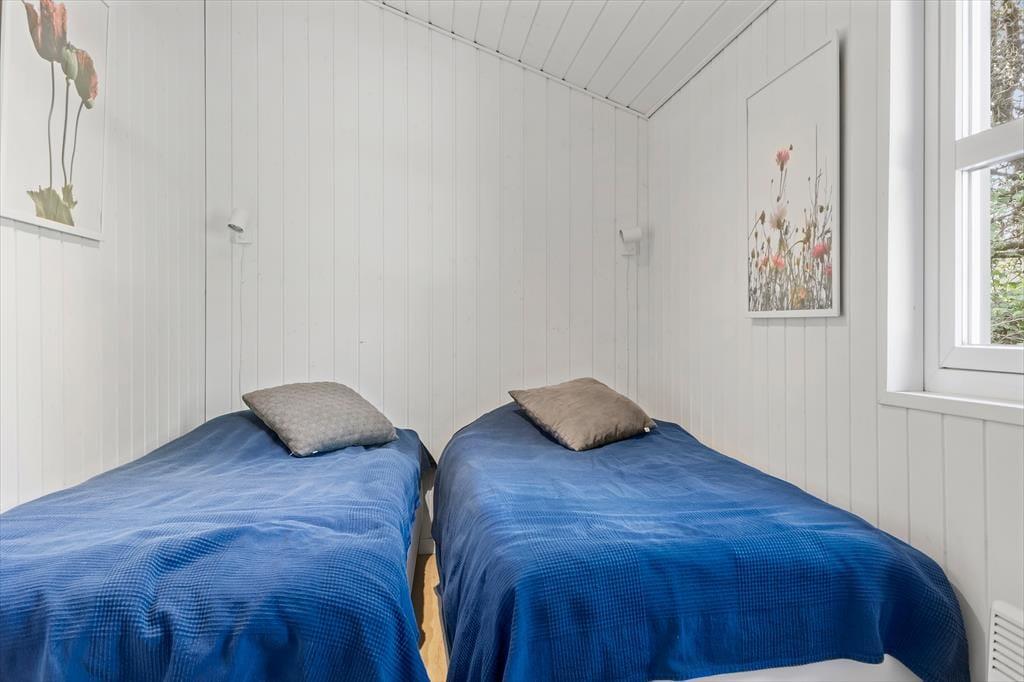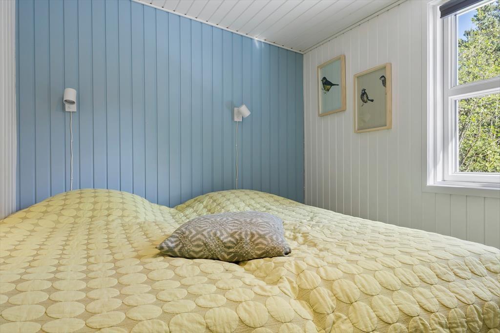 Sommerhuset præsenterer sig på køn og klassisk vis med grønt tag, mørk træfacade og hvide vinduesrammer. Inden døre er sommerhuscharmen også i top, for her er der lyse trælister på væggene og loft til kip, og en brændeovn er med til at skrue op for både varmen og hyggestemningen. I opholdsrummet er stue og køkken forenet, så selvom aftensmaden skal forberedes, kan I sagtens tage del i familiehyggen. Udover et badeværelse byder planløsningen også på en sauna, så efter dagens udflugter kan I se frem til at læne jer tilbage og slappe helt af, mens I bliver varmet igennem. Når det er sengetid, kan I fordele jer på de tre soveværelser, hvoraf et er udstyret med dobbeltseng og to med hver især to enkeltsenge.