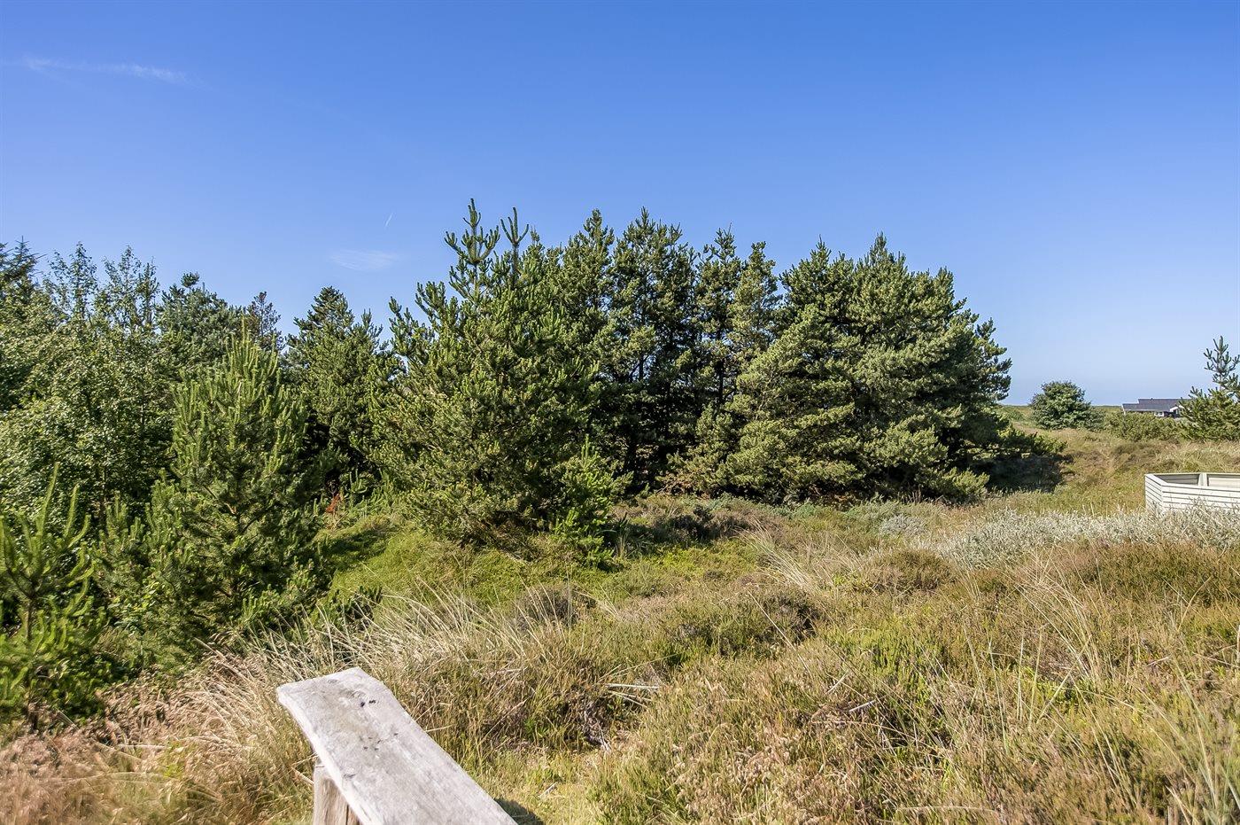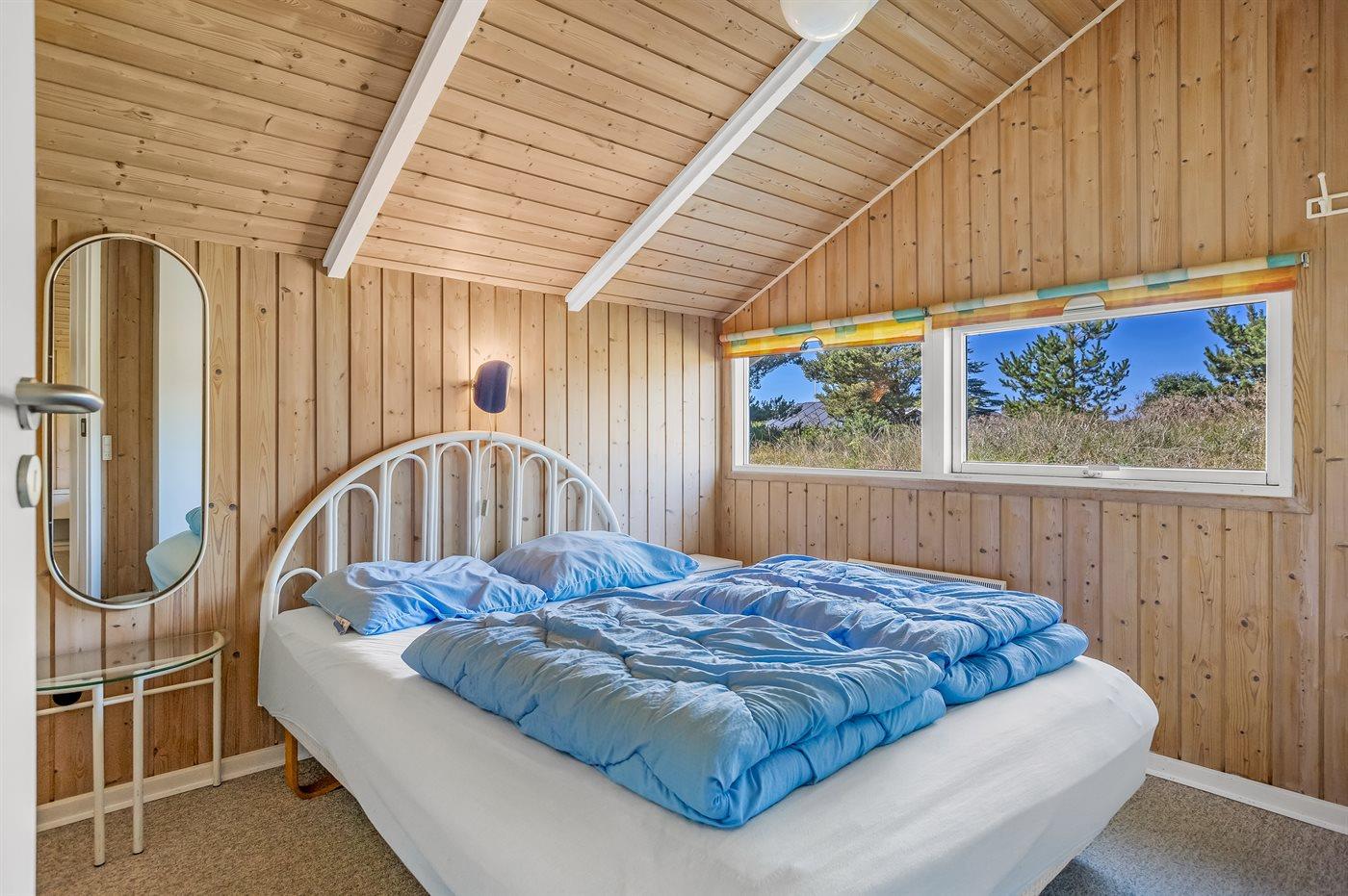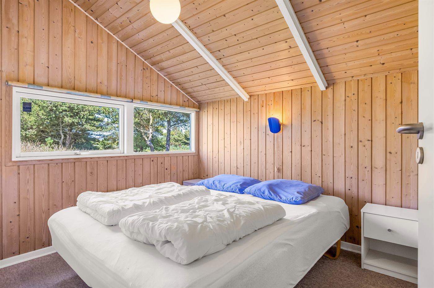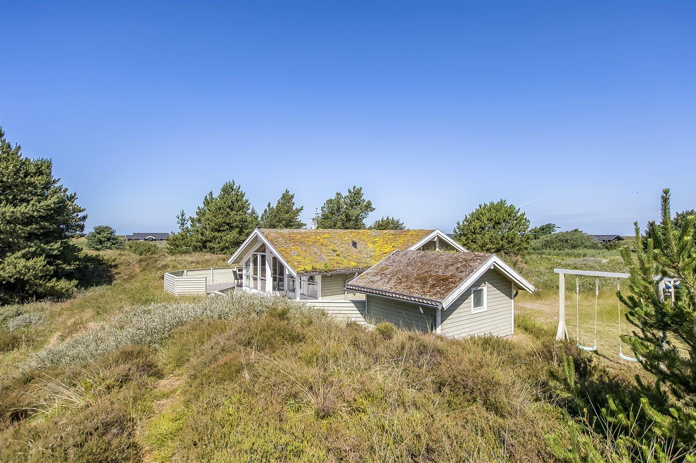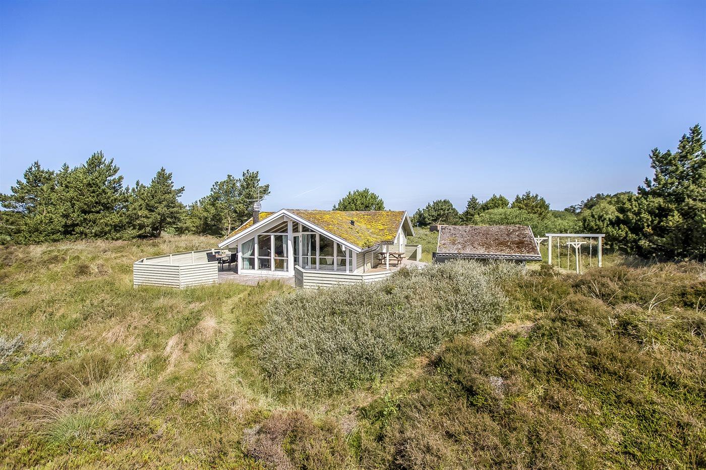 På en lille bakke med skøn udsigt over de fredede arealer ligger dette flotte sommerhus i træ, bygget i 1991 og renoveret i 2016. Til huset hører stor, dejlig og til dels afskærmet terrasse med havemøbler. Indvendig er væggene beklædt med træ. Skønt badeværelse med gulvvarme, bruseniche, 2-pers. Spa, vaskemaskine og tørretumbler. Desuden findes der et gæstetoilet, også med gulvvarme. Det dejlige lyse køkken, som ligger i forbindelse med stuen indeholder bl.a. opvaskemaskine, mikrobølgeovn og fryser. Den store, lyse opholdsstue med panoramavinduer, hvorfra der er udsigt over den flotte natur, er udstyret med brændeovn, stereoanlæg, DVD-afspiller samt TV med parabolantenne. Husets sovepladser fordeler sig på 3 soveværelser, 2 med dobbeltseng og 1 med 2 enkeltsenge. Desuden forefindes gratis trådløs internetforbindelse (egen computer medbringes), ekstra TV, barneseng og barnestol. Der er installeret energibesparende varmepumpe. På grunden er der sandkasse og gynge til børnene. Huset ligger i et naturskønt, kuperet hedeområde i Bolilmark, hvorfra en gang/cykelsti fører til Lakolk og stranden.