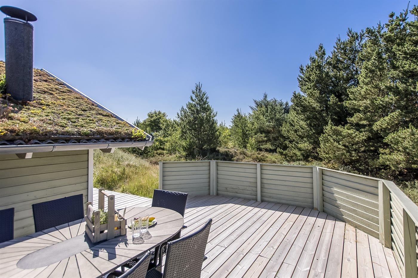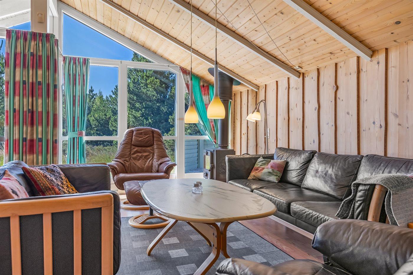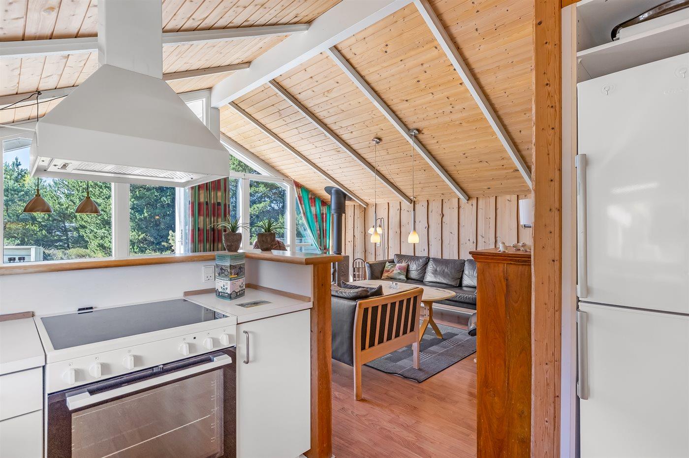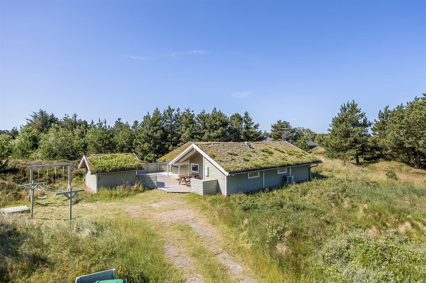 På en lille bakke med skøn udsigt over de fredede arealer ligger dette flotte sommerhus i træ, bygget i 1991 og renoveret i 2016. Til huset hører stor, dejlig og til dels afskærmet terrasse med havemøbler. Indvendig er væggene beklædt med træ. Skønt badeværelse med gulvvarme, bruseniche, 2-pers. Spa, vaskemaskine og tørretumbler. Desuden findes der et gæstetoilet, også med gulvvarme. Det dejlige lyse køkken, som ligger i forbindelse med stuen indeholder bl.a. opvaskemaskine, mikrobølgeovn og fryser. Den store, lyse opholdsstue med panoramavinduer, hvorfra der er udsigt over den flotte natur, er udstyret med brændeovn, stereoanlæg, DVD-afspiller samt TV med parabolantenne. Husets sovepladser fordeler sig på 3 soveværelser, 2 med dobbeltseng og 1 med 2 enkeltsenge. Desuden forefindes gratis trådløs internetforbindelse (egen computer medbringes), ekstra TV, barneseng og barnestol. Der er installeret energibesparende varmepumpe. På grunden er der sandkasse og gynge til børnene. Huset ligger i et naturskønt, kuperet hedeområde i Bolilmark, hvorfra en gang/cykelsti fører til Lakolk og stranden.