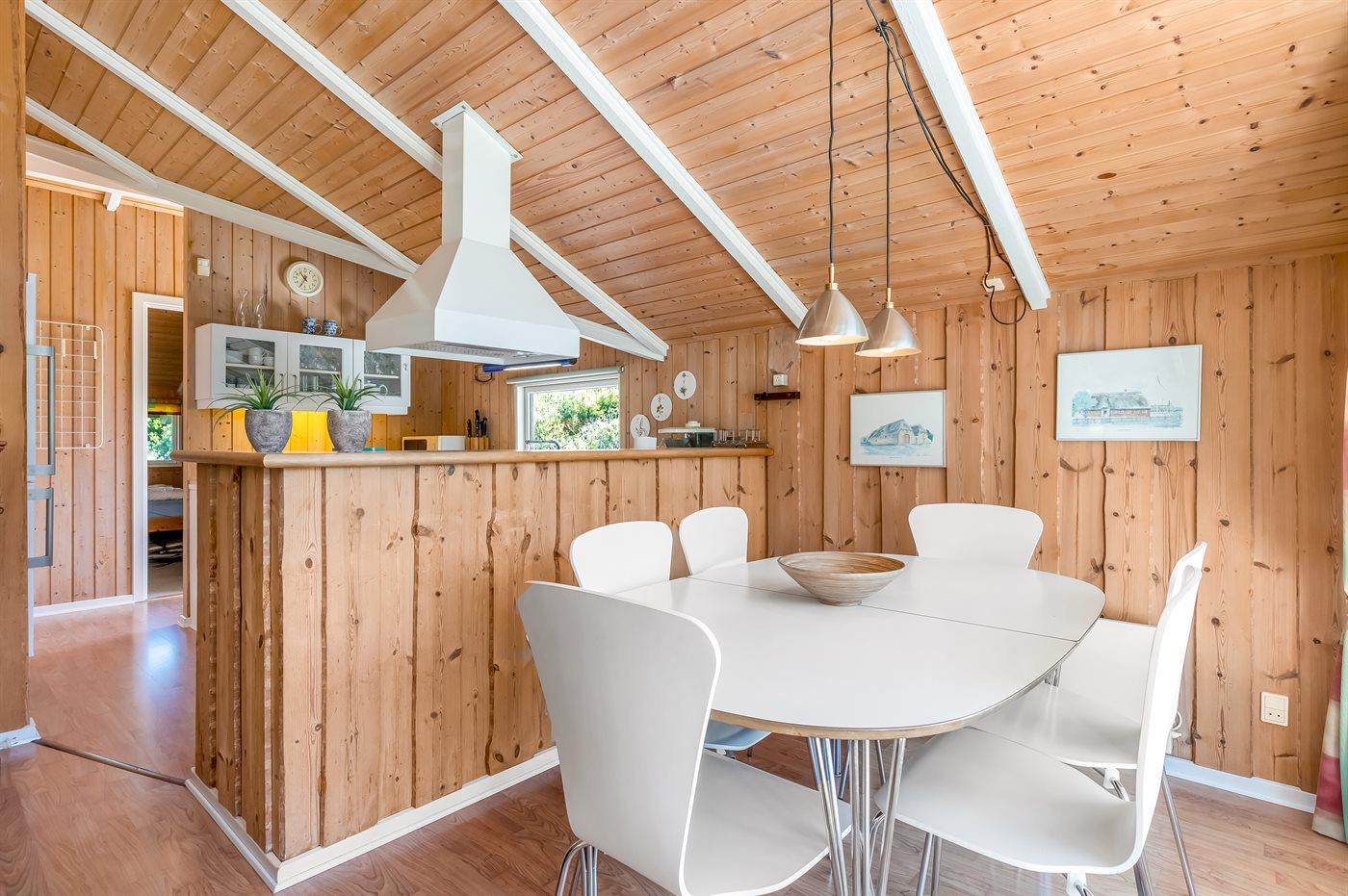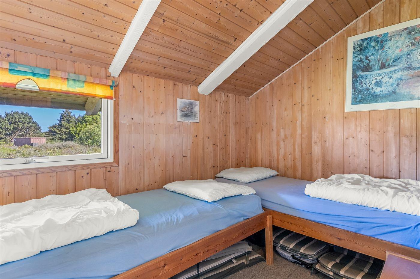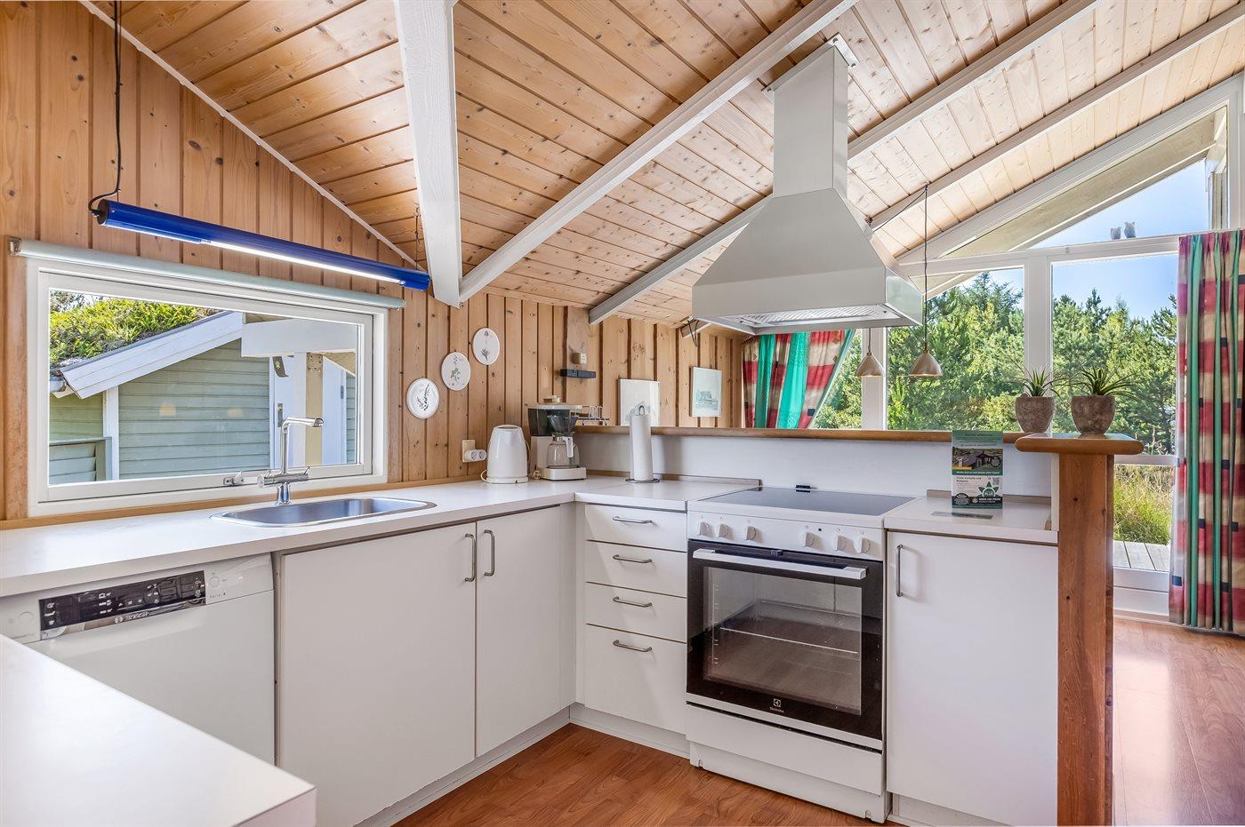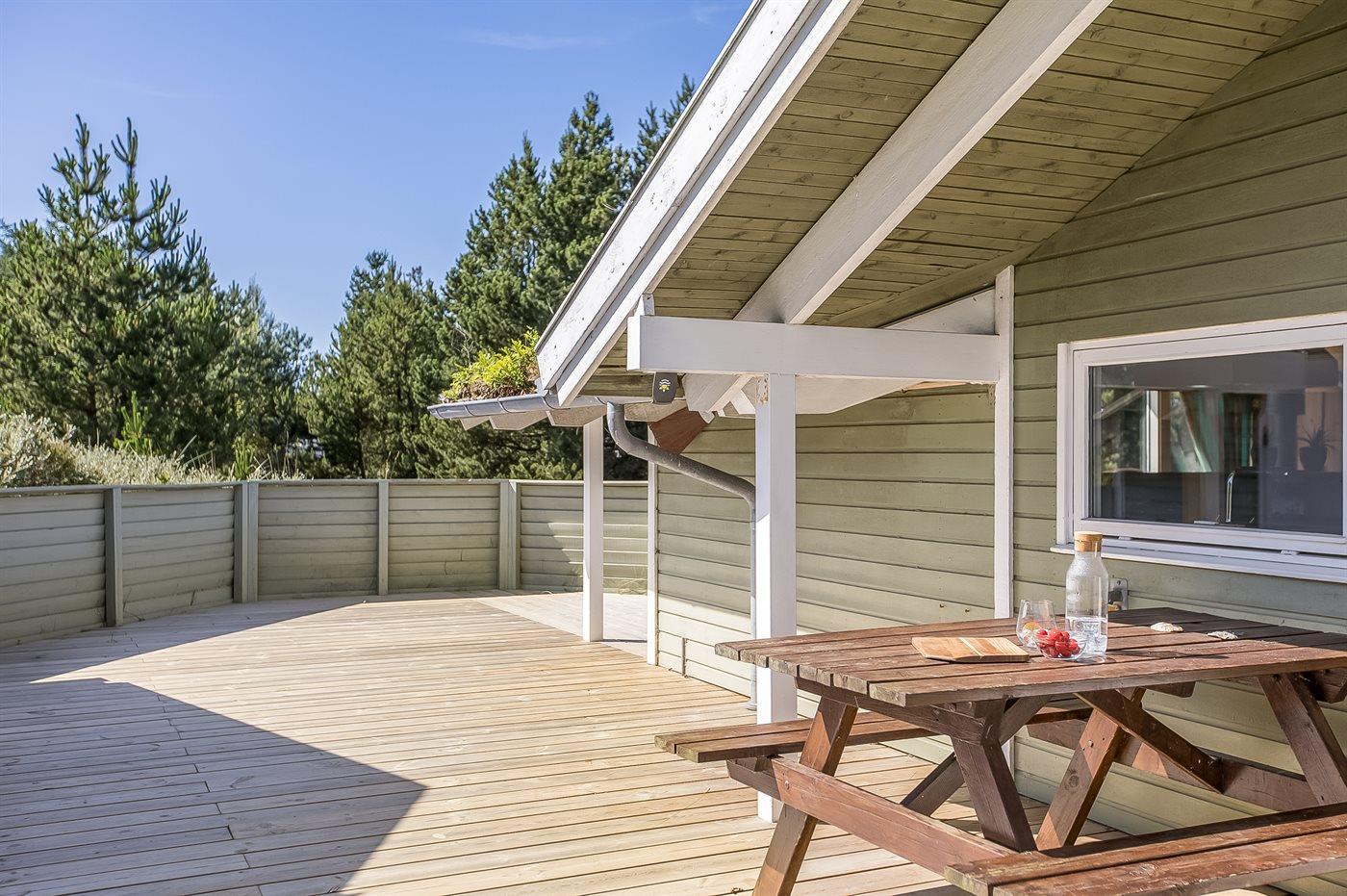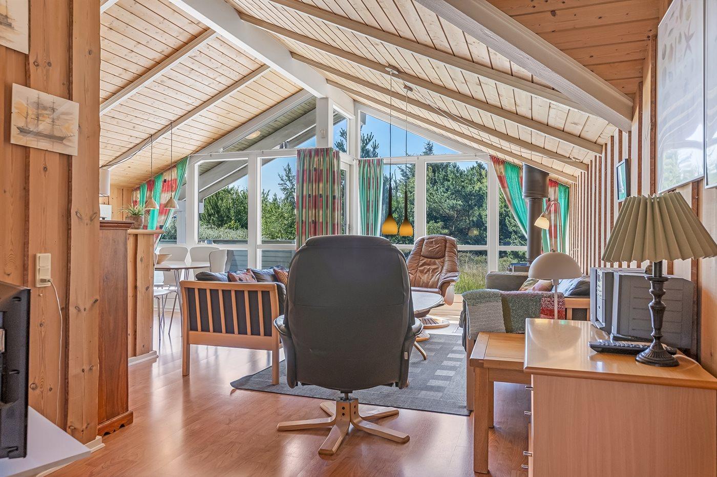 På en lille bakke med skøn udsigt over de fredede arealer ligger dette flotte sommerhus i træ, bygget i 1991 og renoveret i 2016. Til huset hører stor, dejlig og til dels afskærmet terrasse med havemøbler. Indvendig er væggene beklædt med træ. Skønt badeværelse med gulvvarme, bruseniche, 2-pers. Spa, vaskemaskine og tørretumbler. Desuden findes der et gæstetoilet, også med gulvvarme. Det dejlige lyse køkken, som ligger i forbindelse med stuen indeholder bl.a. opvaskemaskine, mikrobølgeovn og fryser. Den store, lyse opholdsstue med panoramavinduer, hvorfra der er udsigt over den flotte natur, er udstyret med brændeovn, stereoanlæg, DVD-afspiller samt TV med parabolantenne. Husets sovepladser fordeler sig på 3 soveværelser, 2 med dobbeltseng og 1 med 2 enkeltsenge. Desuden forefindes gratis trådløs internetforbindelse (egen computer medbringes), ekstra TV, barneseng og barnestol. Der er installeret energibesparende varmepumpe. På grunden er der sandkasse og gynge til børnene. Huset ligger i et naturskønt, kuperet hedeområde i Bolilmark, hvorfra en gang/cykelsti fører til Lakolk og stranden.