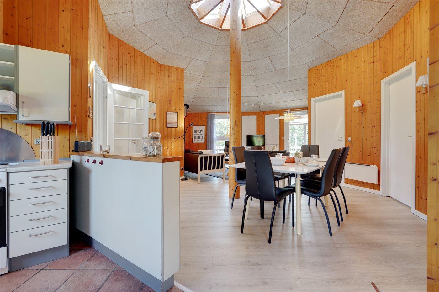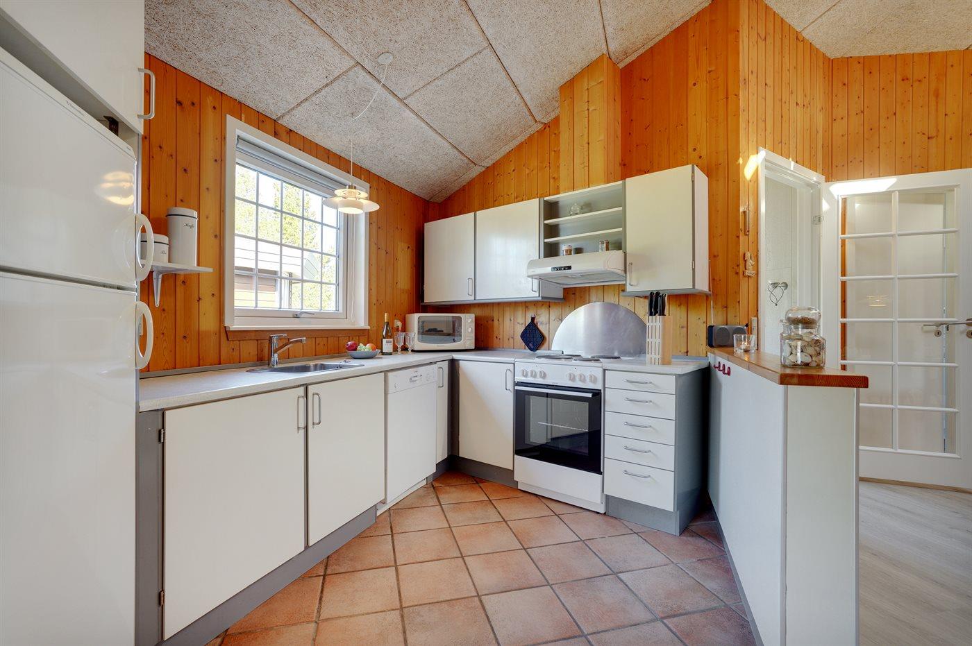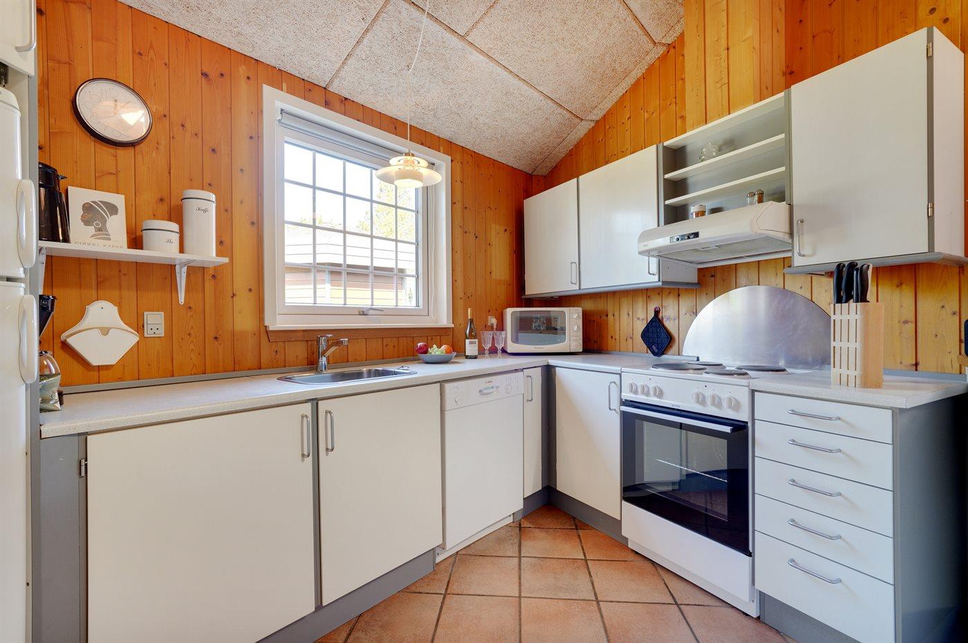 Køkkenet er udstyret med 1 køleskab. Der er 4 elkogeplader, bageovn, mikrobølgeovn samt opvaskemaskine.