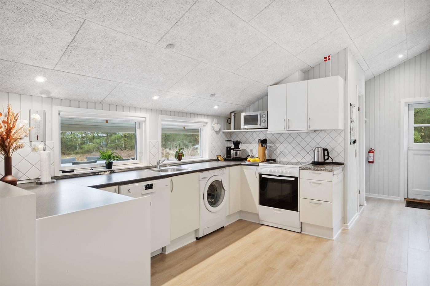 Køkkenet er udstyret med 1 køleskab med fryseskab på 10 liter, 4 keramiske kogeplader, bageovn, mikrobølgeovn samt opvaskemaskine.