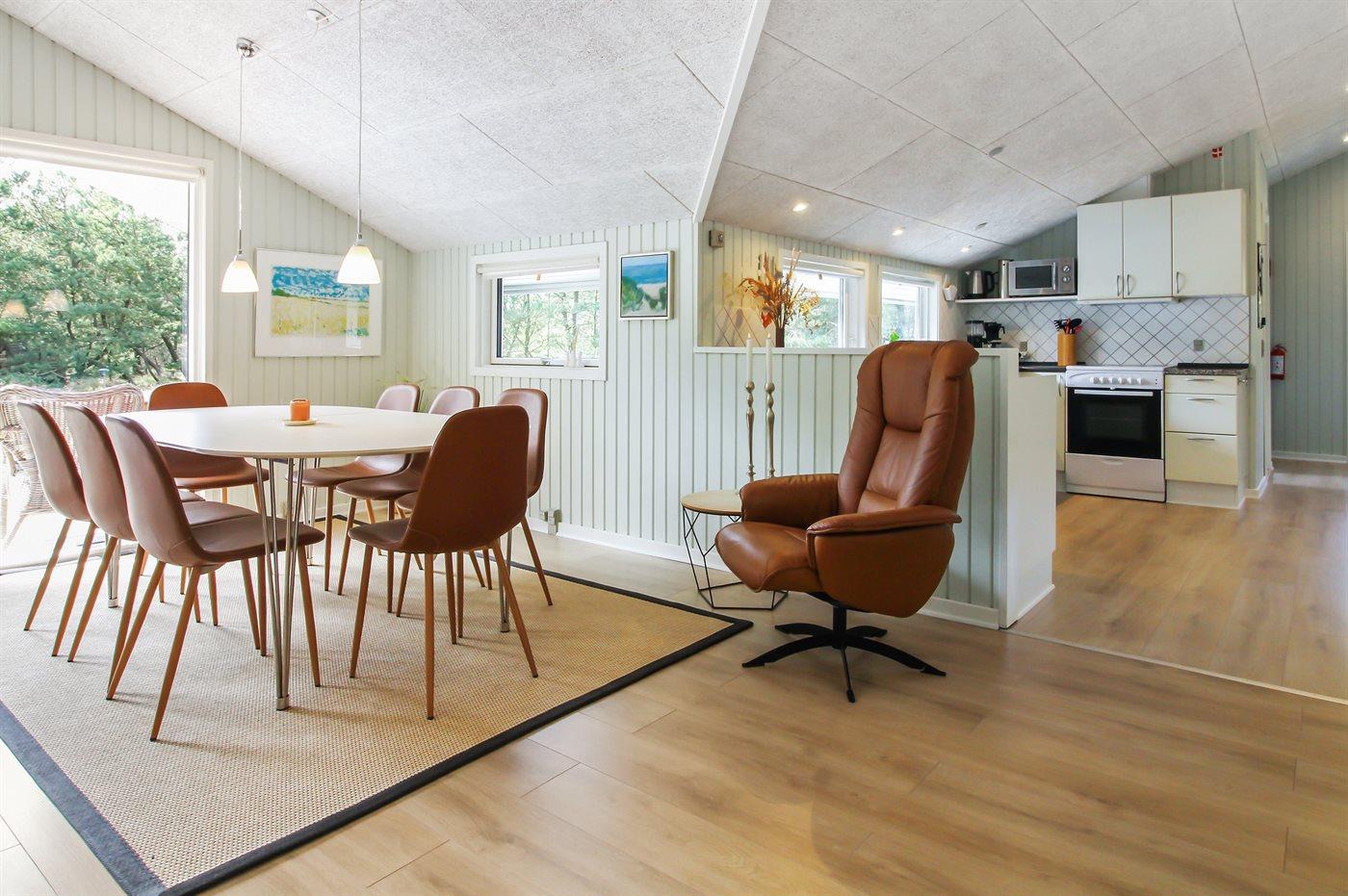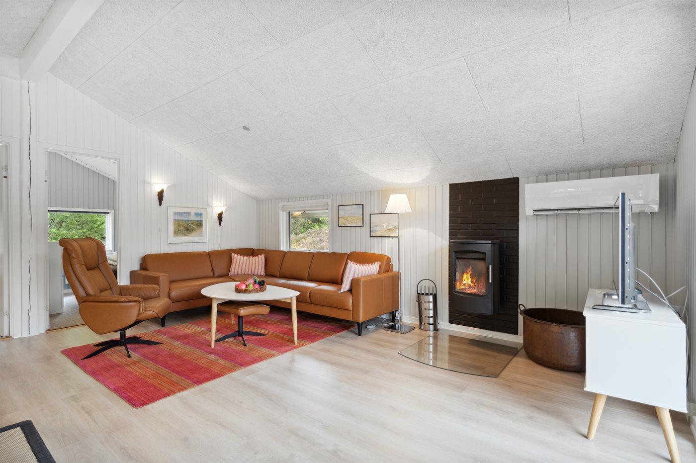 Huset er nyindrettet med en lys og rummelig opholdsstue med brændeovn, kombineret med køkkenet.