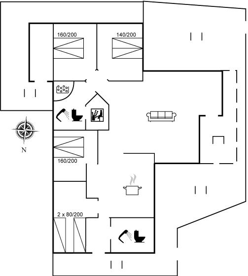 Der er i alt 4 soveværelser. Sovepladserne fordeler sig på: 6 sovepladser i dobbeltsenge. 2 sovepladser i enkeltsenge.