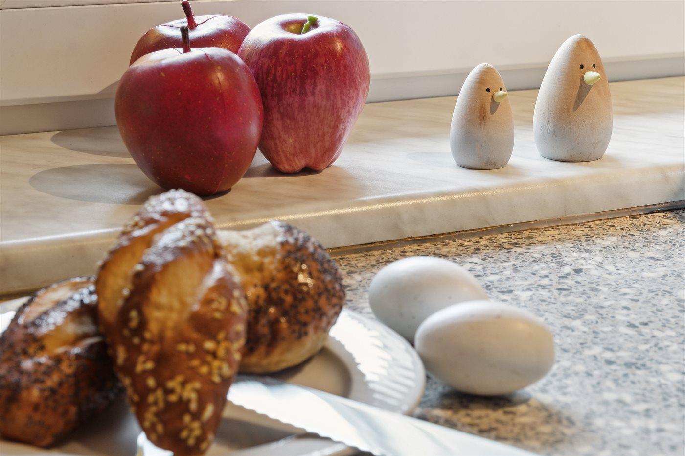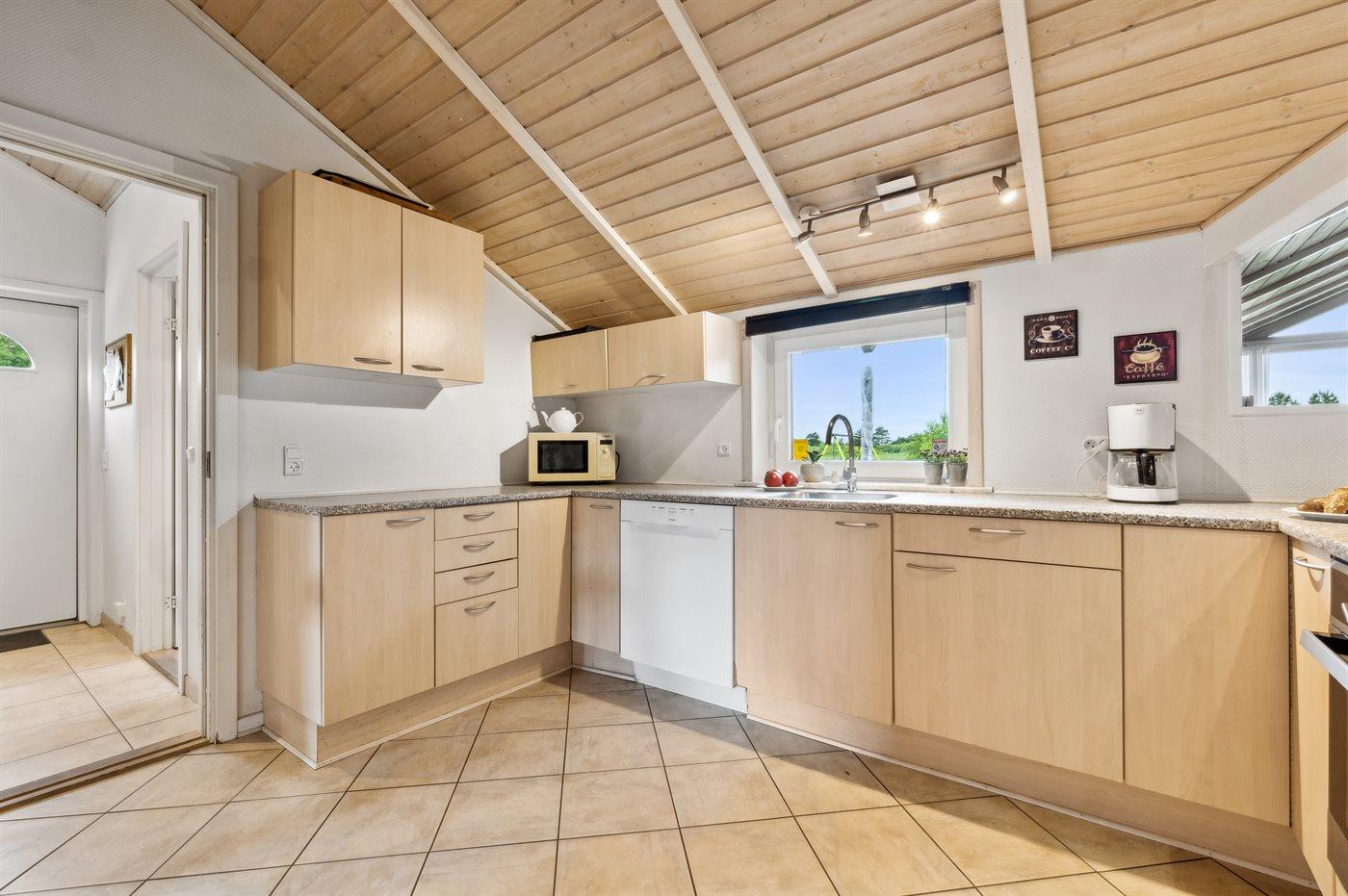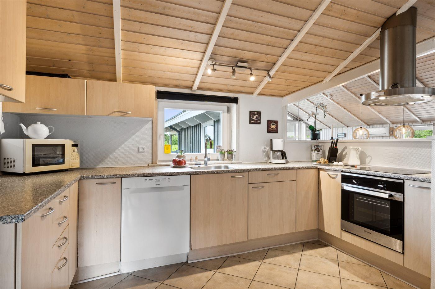 Køkkenet er udstyret med 1 køleskab. Der er 4 elkogeplader, varmluftovn, mikrobølgeovn samt opvaskemaskine.