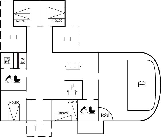 Der er i alt 5 soveværelser. Sovepladserne fordeler sig på: 6 sovepladser i dobbeltsenge. 2 sovepladser i enkeltsenge. 2 sovepladser i køjeseng. Derudover er der 1 stk. barneseng.