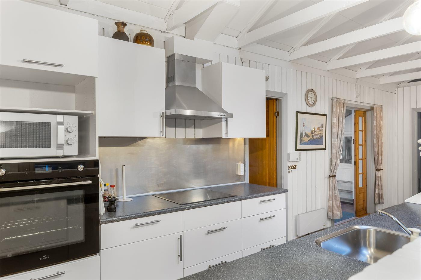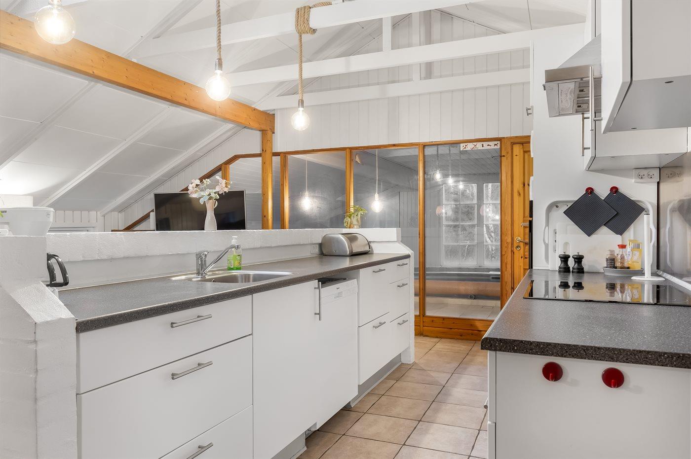 Køkkenet er udstyret med 1 køleskab. Der er 4 elkogeplader, bageovn, mikrobølgeovn samt opvaskemaskine.