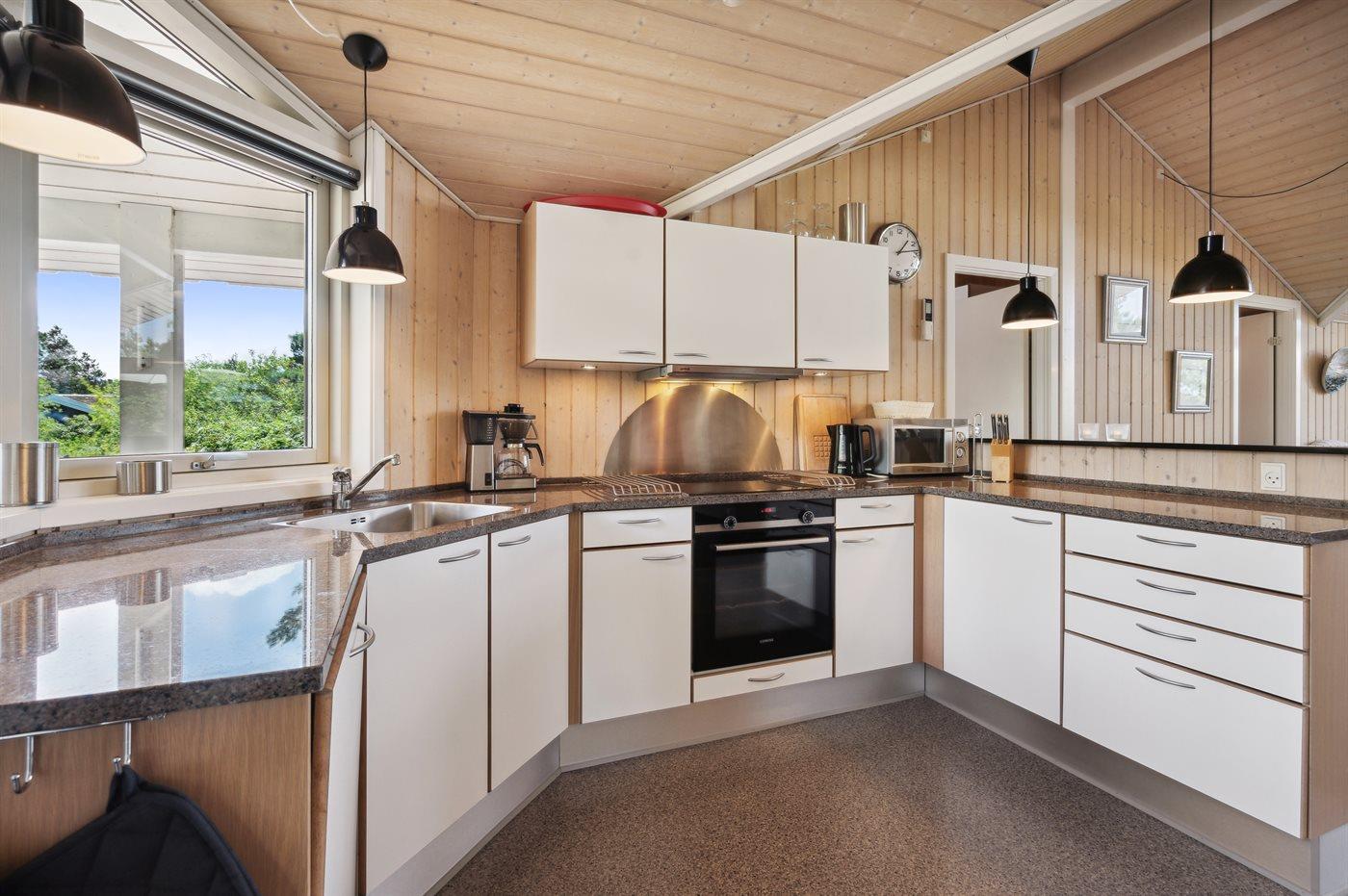 Køkkenet er udstyret med 1 køleskab. Der er 4 keramiske kogeplader, varmluftovn, mikrobølgeovn samt opvaskemaskine.