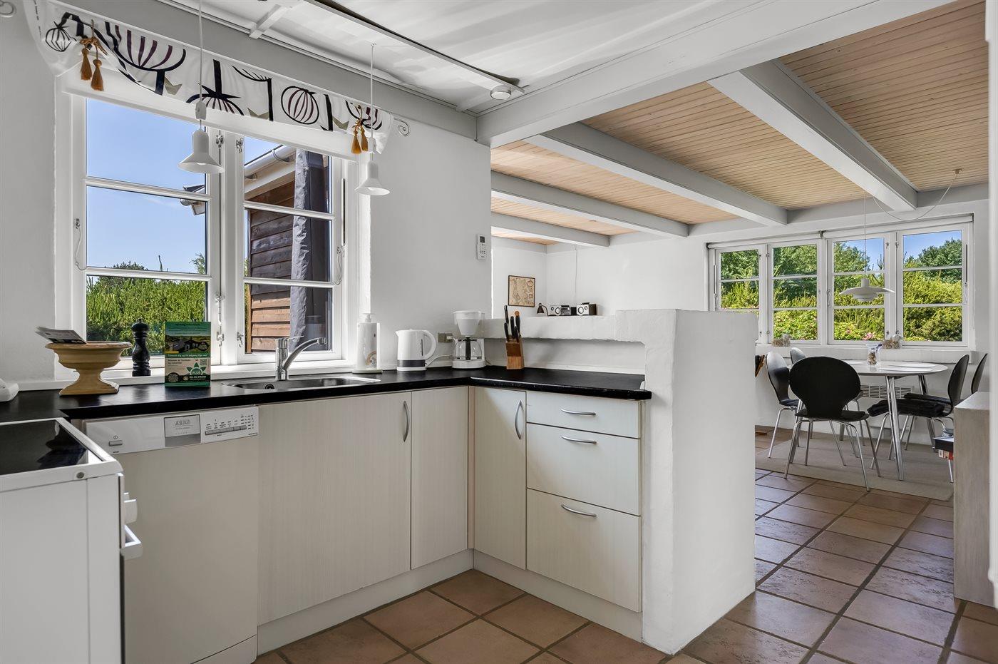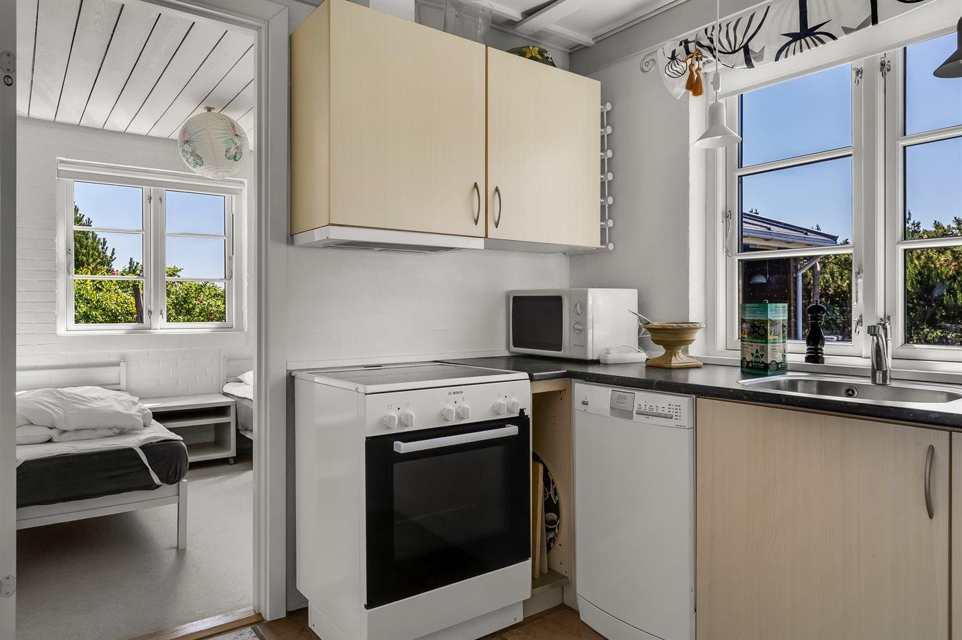 Køkkenet er udstyret med 1 køleskab. Der er 4 elkogeplader, varmluftovn, mikrobølgeovn samt opvaskemaskine.