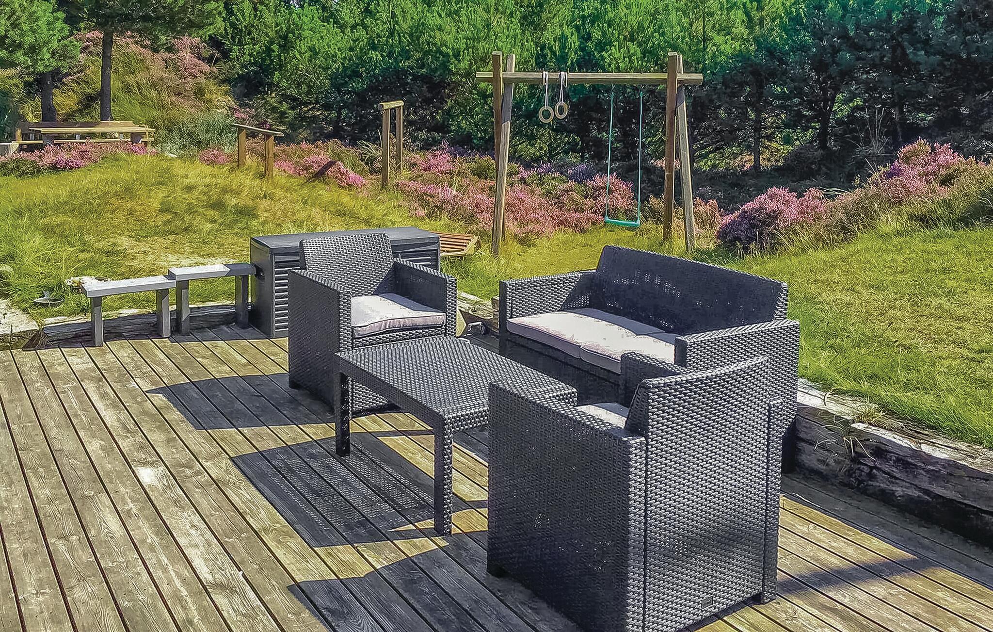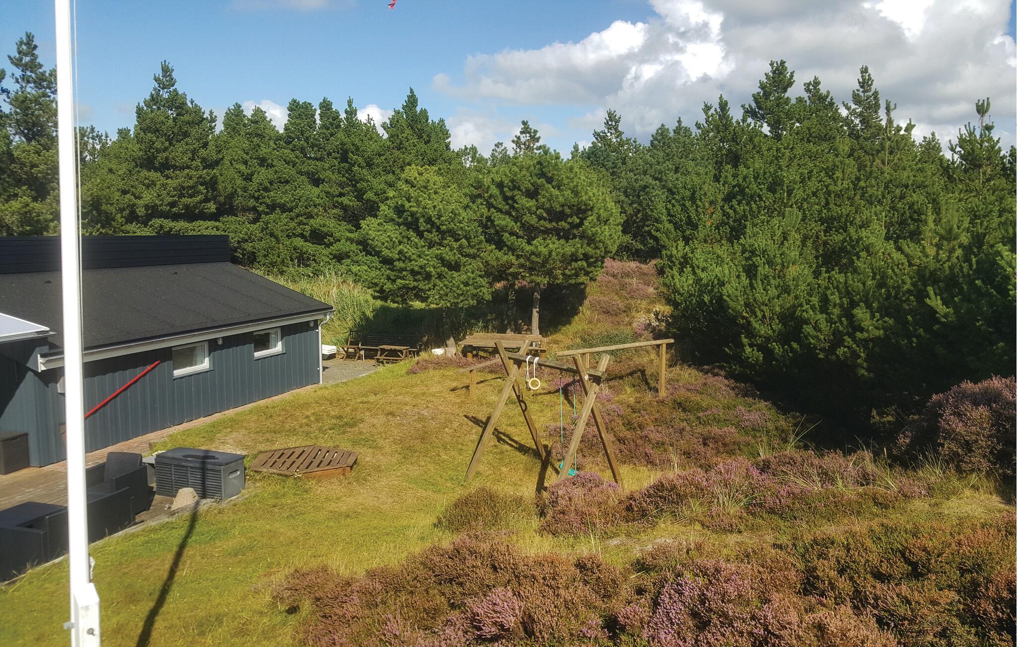 Dette dejlige feriehus ligger for enden af en blind vej, hvor Bolilmarks natur er allermest flot og kuperet. Fra grundens højeste punkt er der en flot udsigt over Vesterhavet og ferieområdet Bolilmark. Huset har en delvist overdækket terrasse, så de lange sommeraftener kan nydes til sidste minut. Desuden er der åbne terrasser, hvor I kan solbade om dagen. På den ene terrasse er der en udendørs bruser. Interiøret og farvevalget giver en varm og hyggelig stemning i huset. Det er velegnet til såvel en som flere familier.