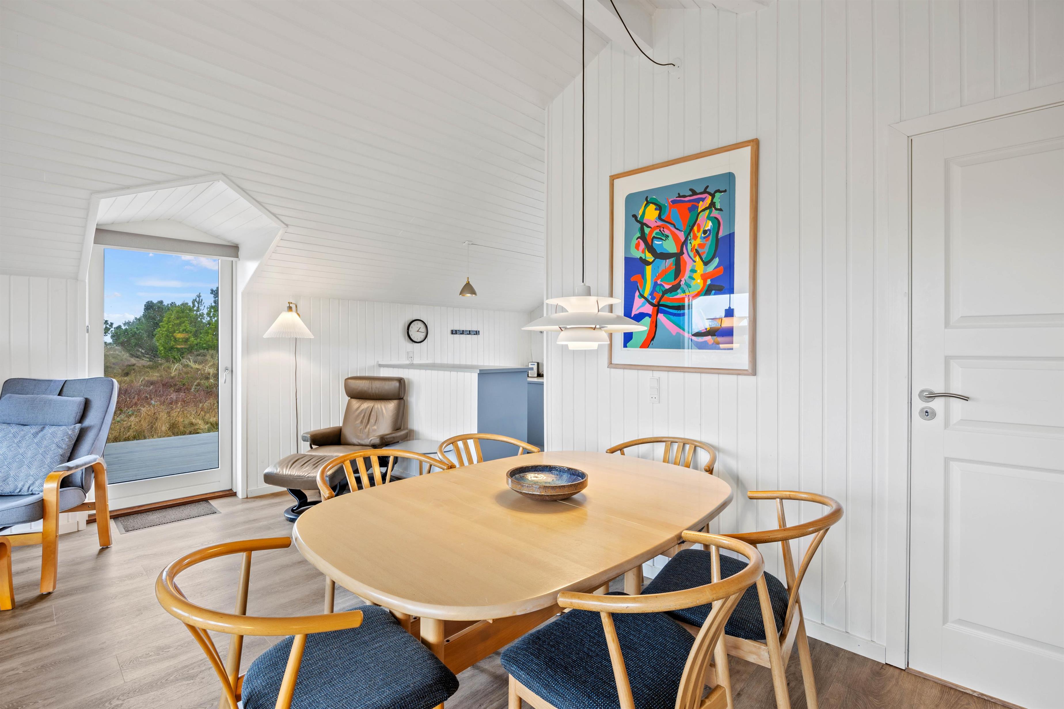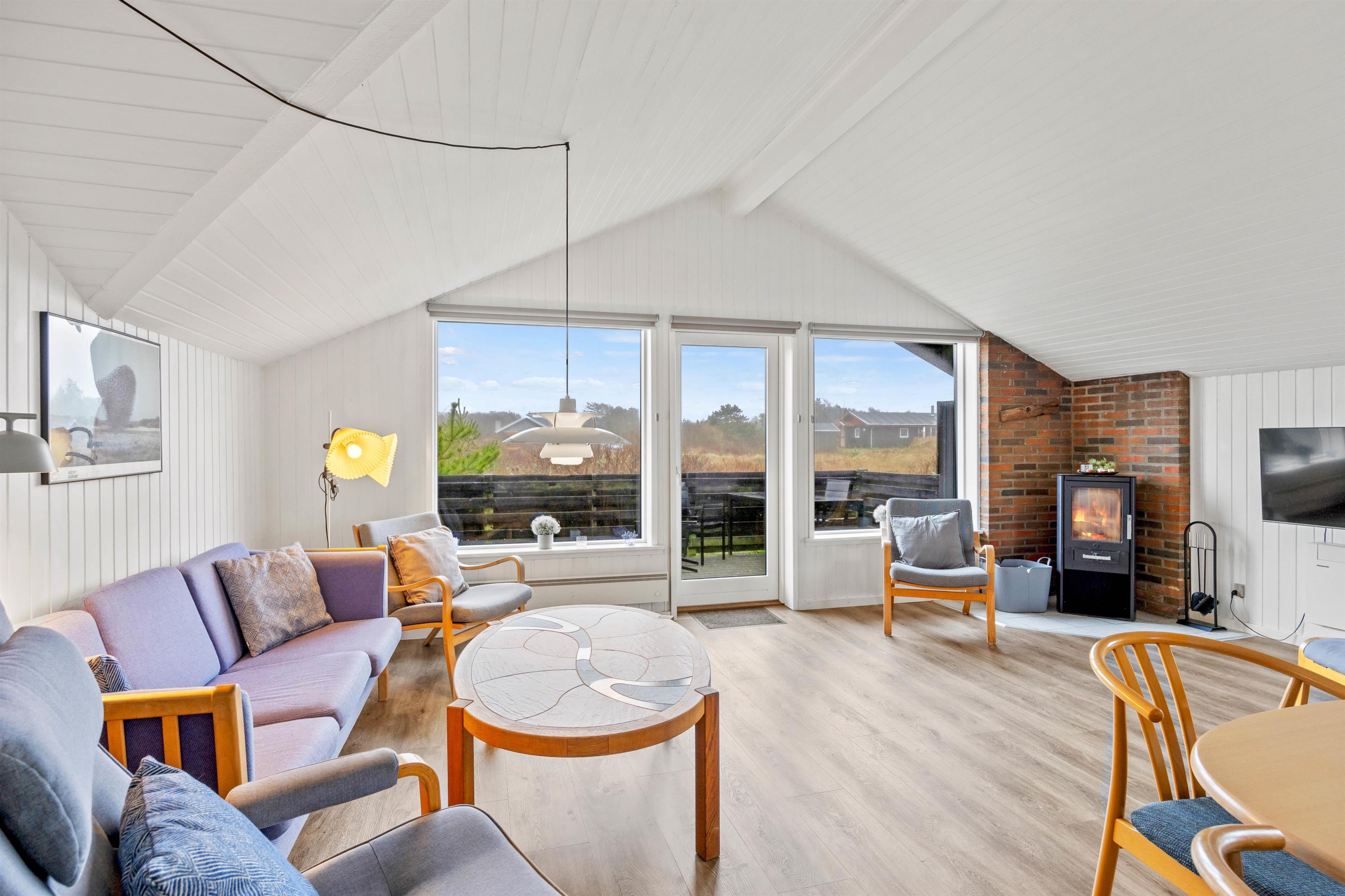 I dette feriehus vil I straks føle jer velkomne, og den smagfuldt afstemte indretning skaber en hyggelig atmosfære. Her kan I slappe af i de komfortable møbler og nyde udsigten til det fri gennem vinduespartiet. Her kan I sammen spille et spil kort eller blot nyde knitren fra brændeovnen med en god bog eller et glas vin. Sommerhuset har desuden en energibesparende varmepumpe, som I med fordel kan benytte jer af.