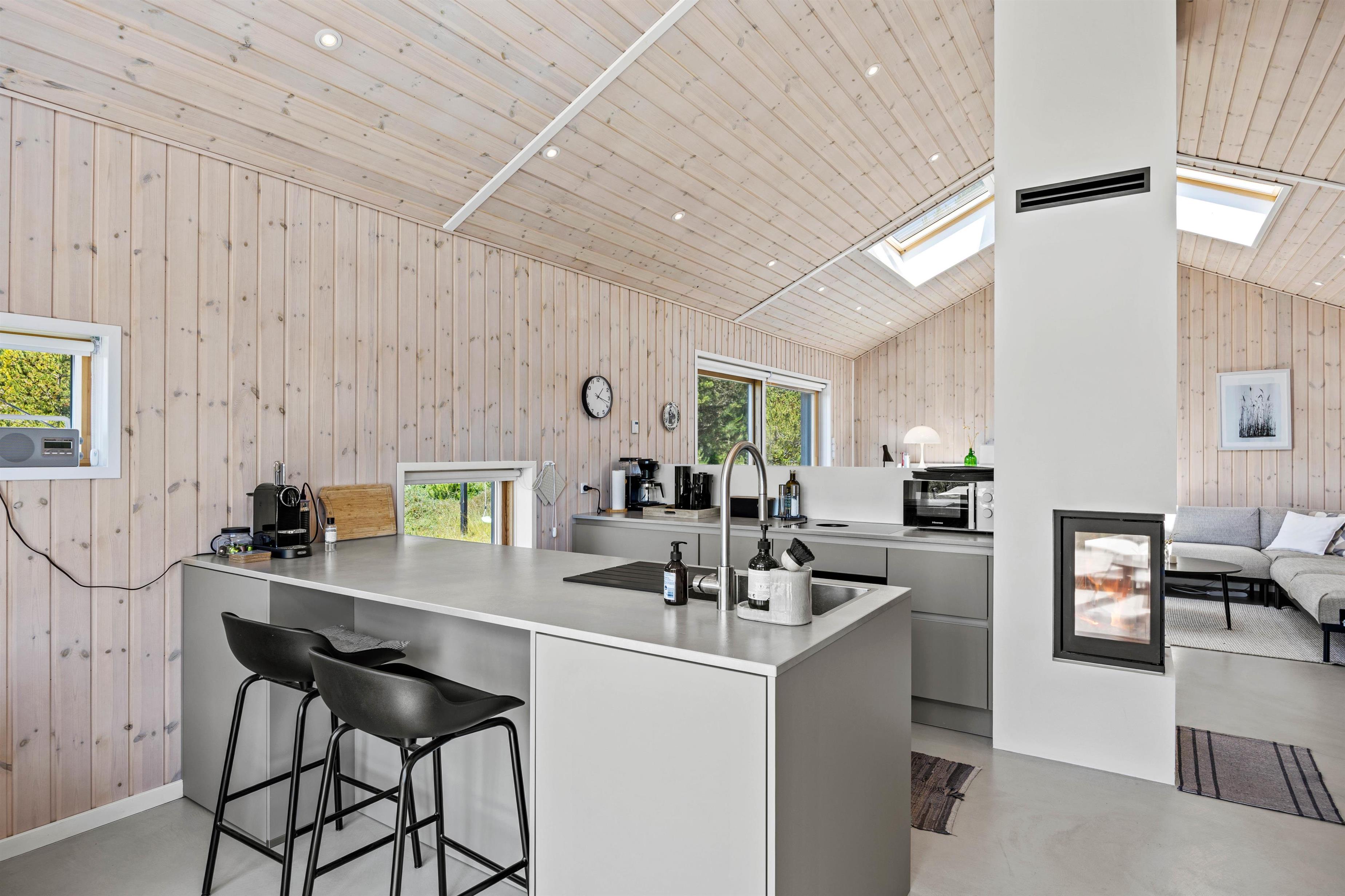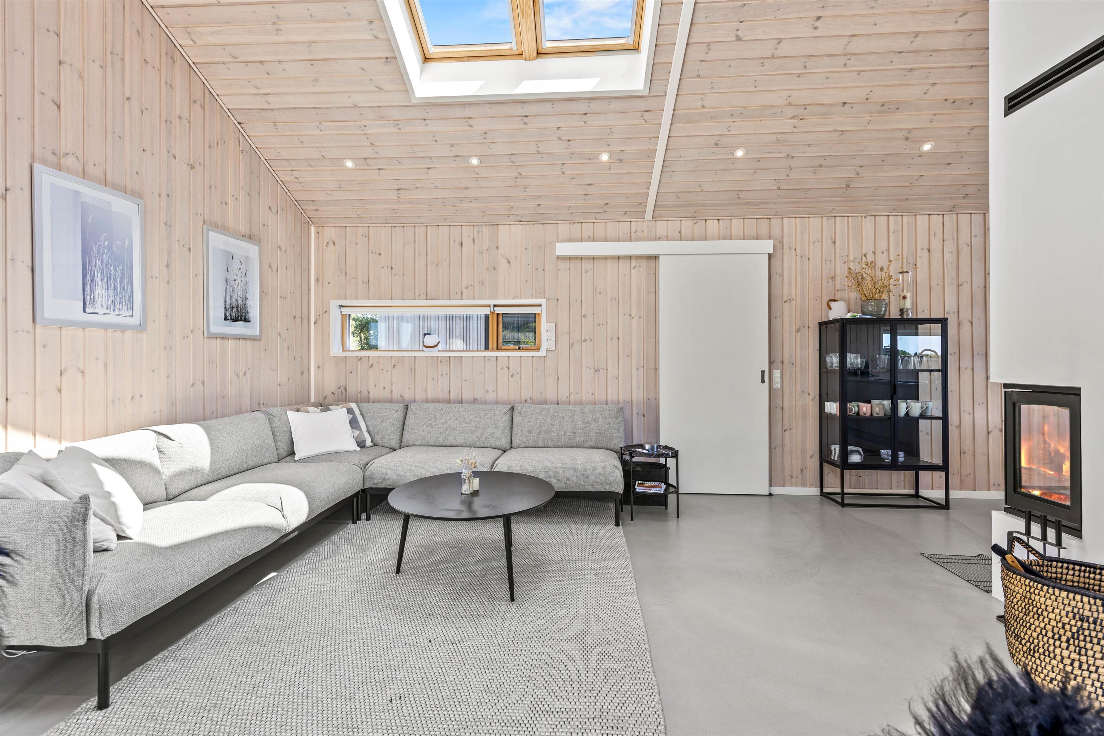Den lyse og moderne atmosfære strømmer gennem hvert rum, og et moderne køkken med blandt andet opvaskemaskine ligger i åben forbindelse med stuen, hvor en hyggelig brændeovn skaber en varm atmosfære og indbyder til familiehygge. Der findes hurtigt fibernet, tv-pakke og streaming.