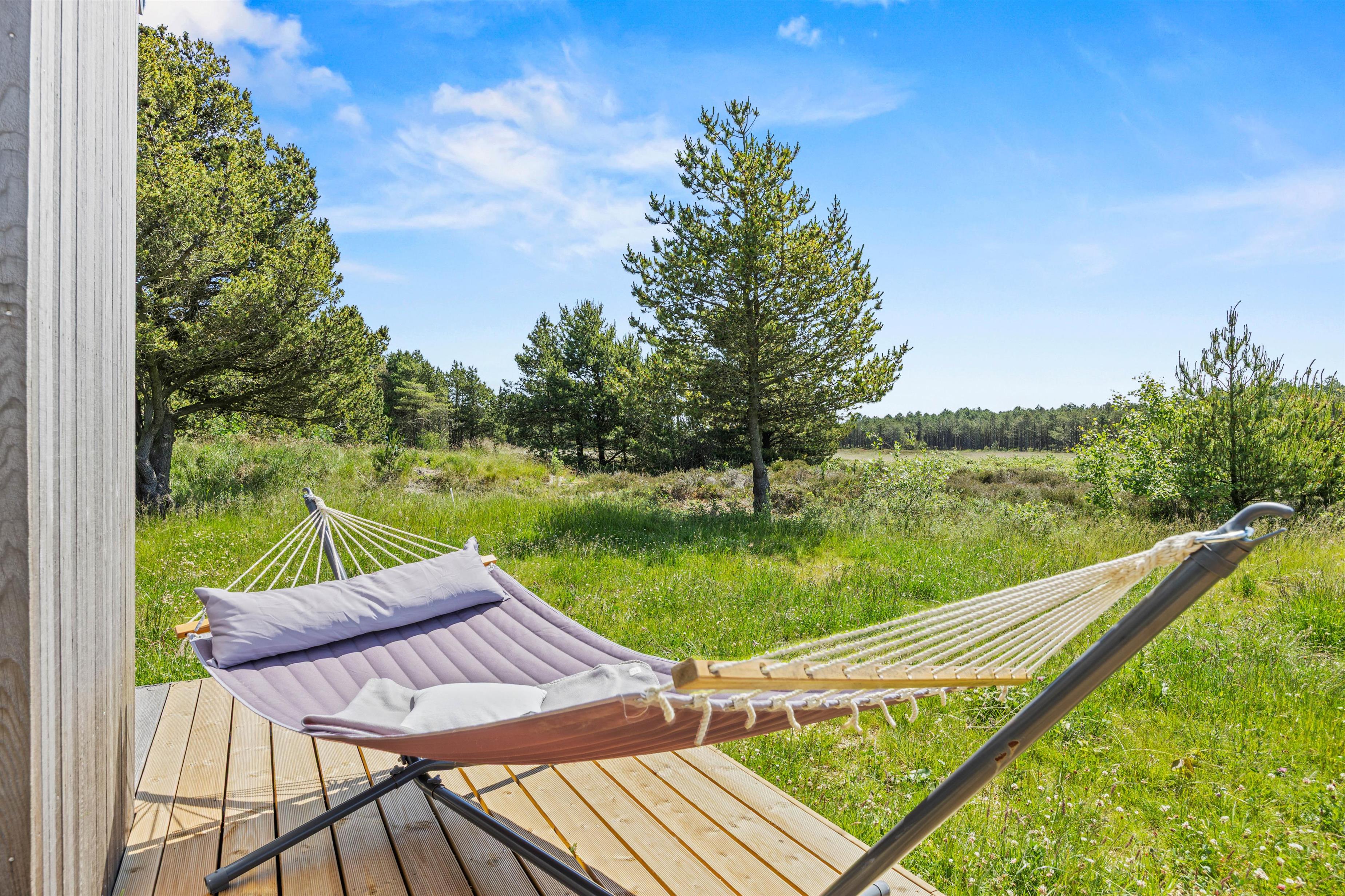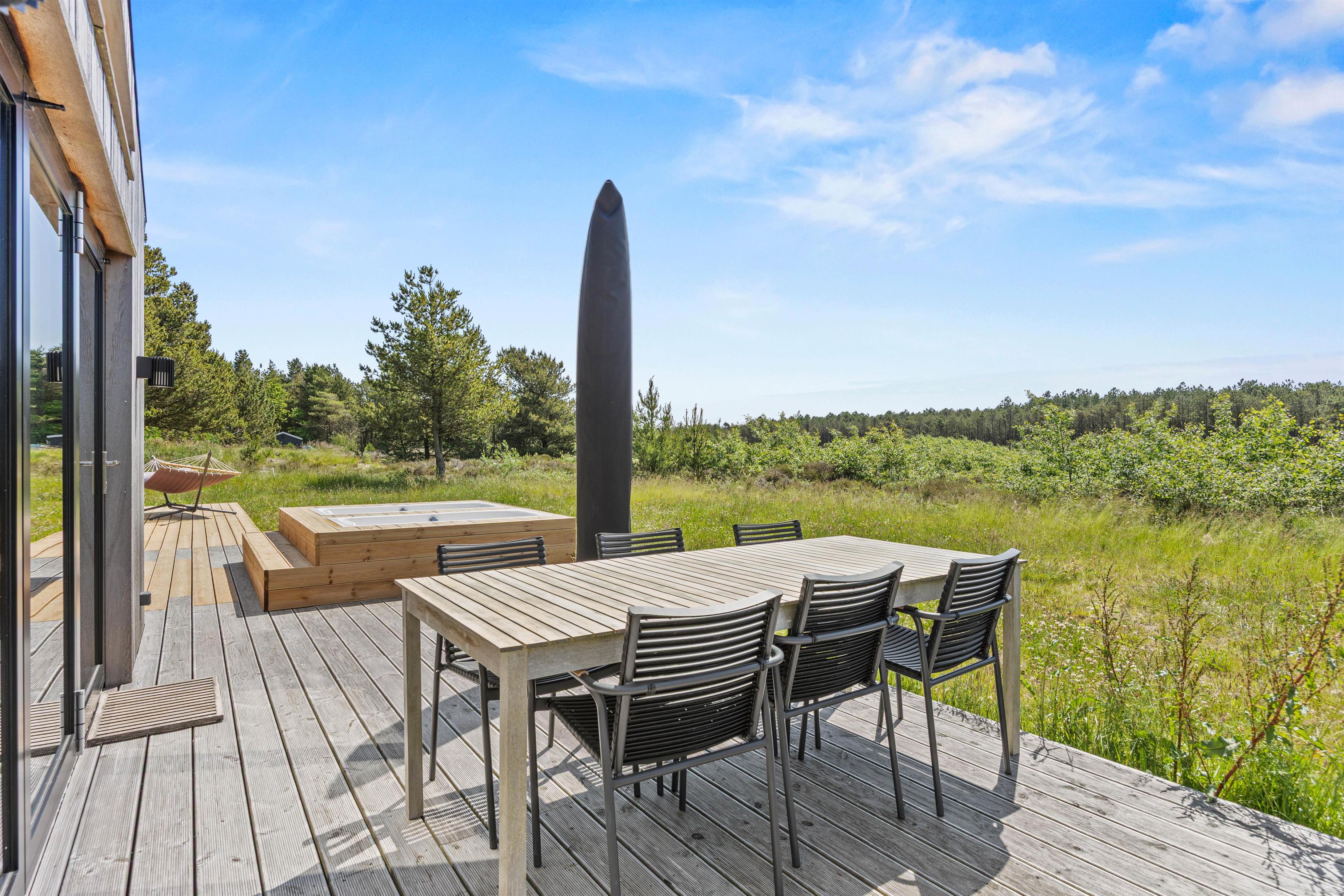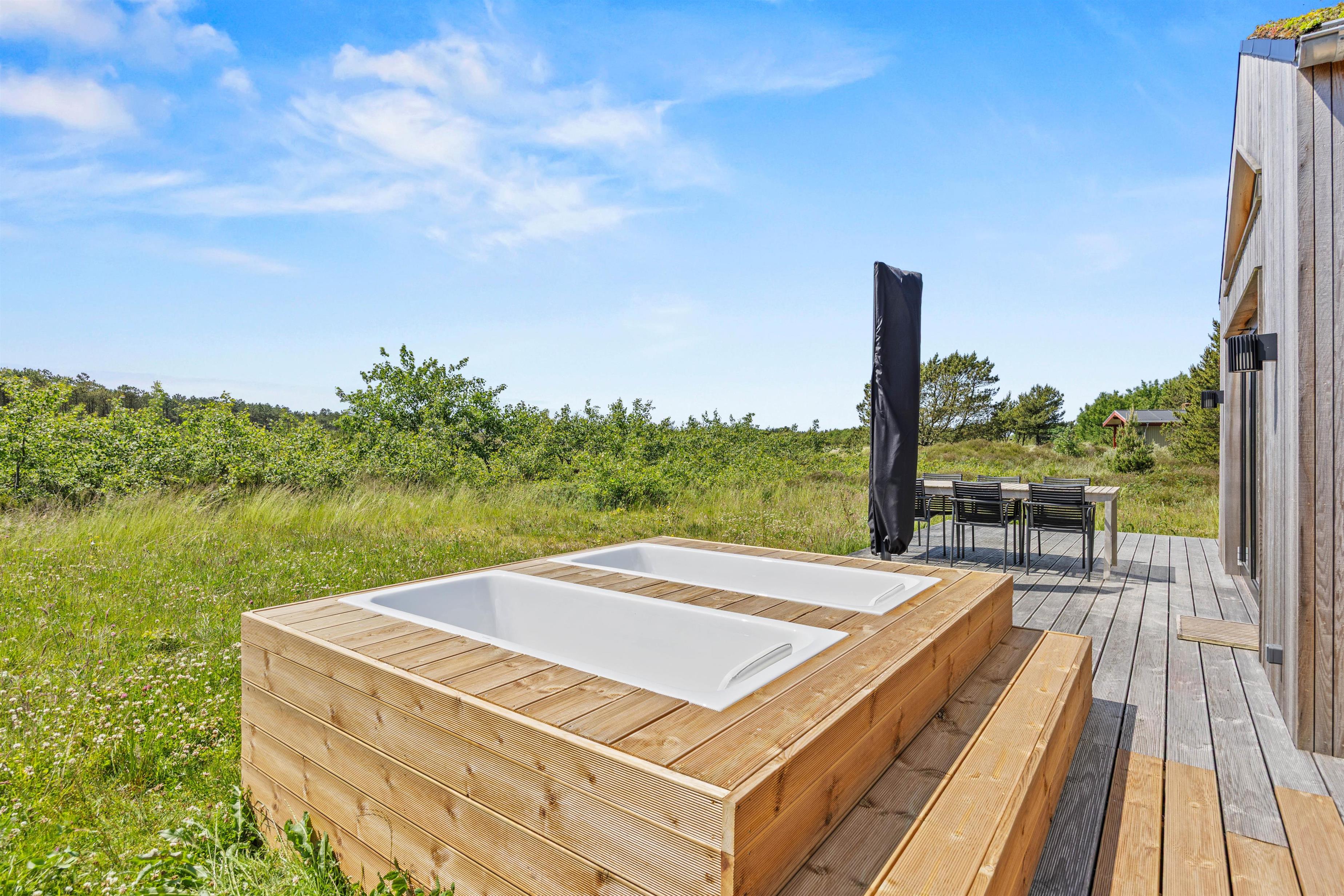 Et af højdepunkterne ved huset er den store træterrasse, der byder på to indbyggede badekar. Her kan I slappe af om aftenen med et koldt glas vin i badekarrene og nyde den skønne, lyngbeklædte natur og samtidig beundre den fantastiske udsigt. Der er fliser hele vejen rundt om terrassen. Huset er omgivet af en stor naturgrund, hvor der også findes sandkasse og gynge til de små. Udebruseren er til rådighed fra april til november.
