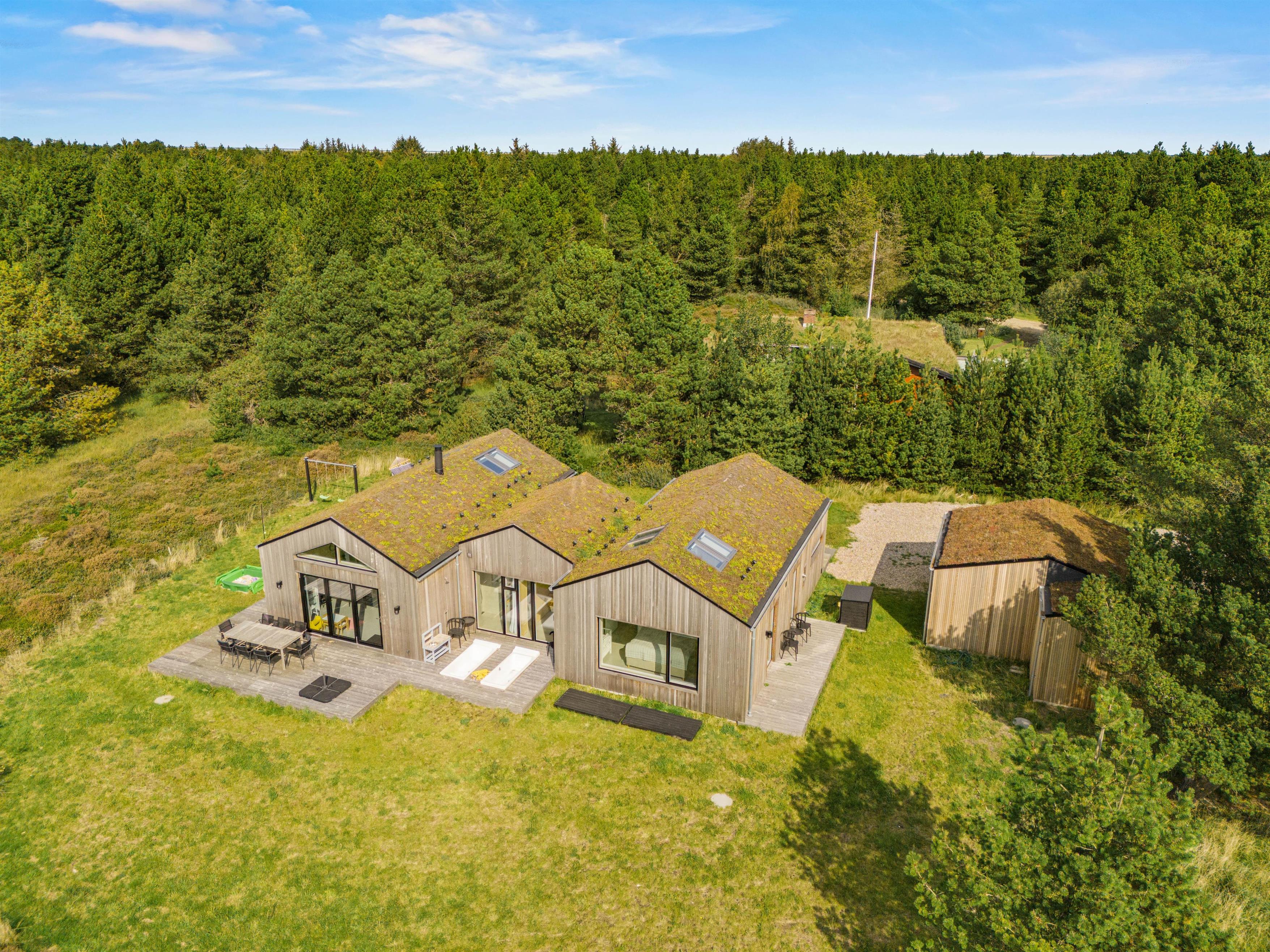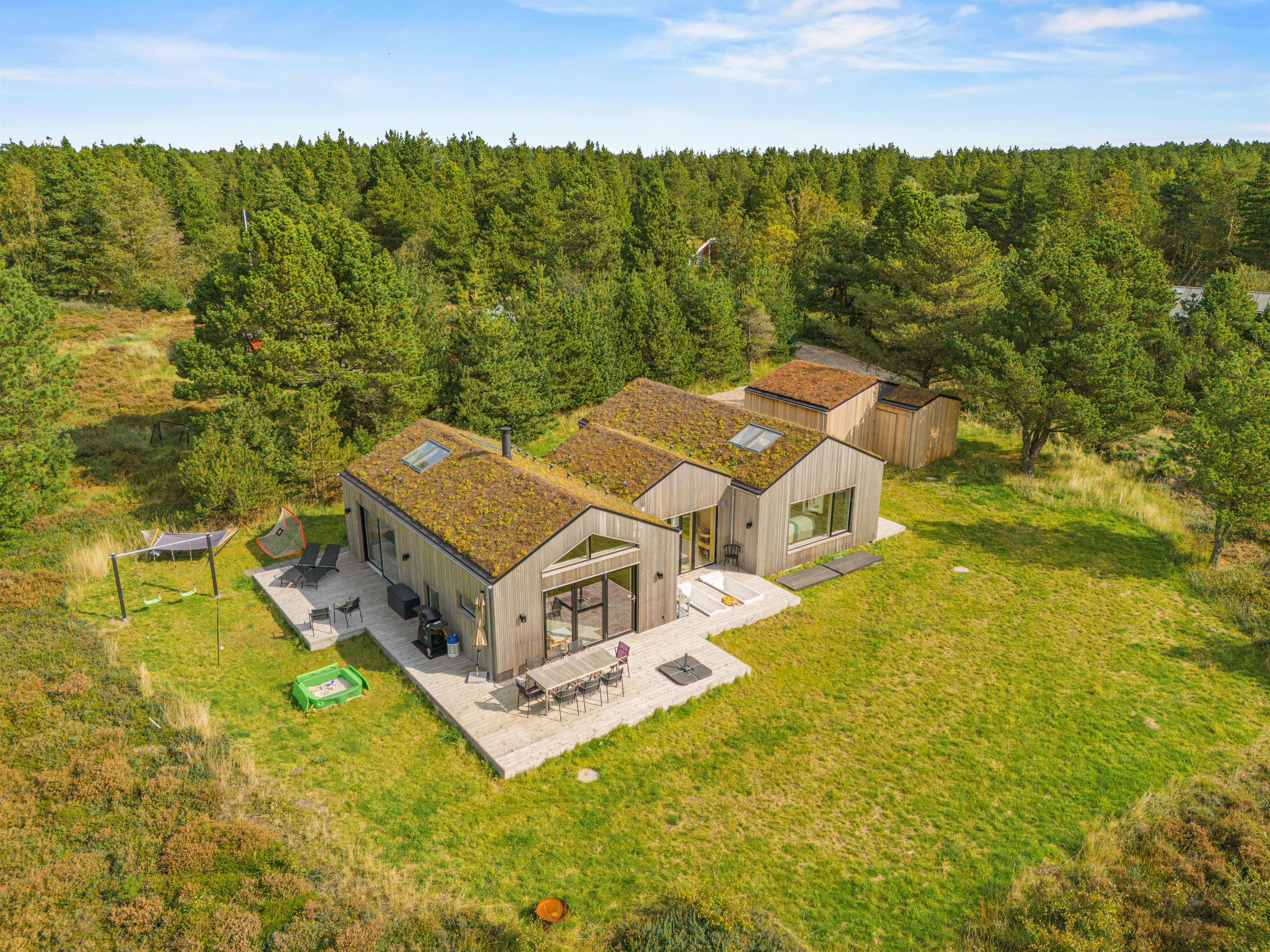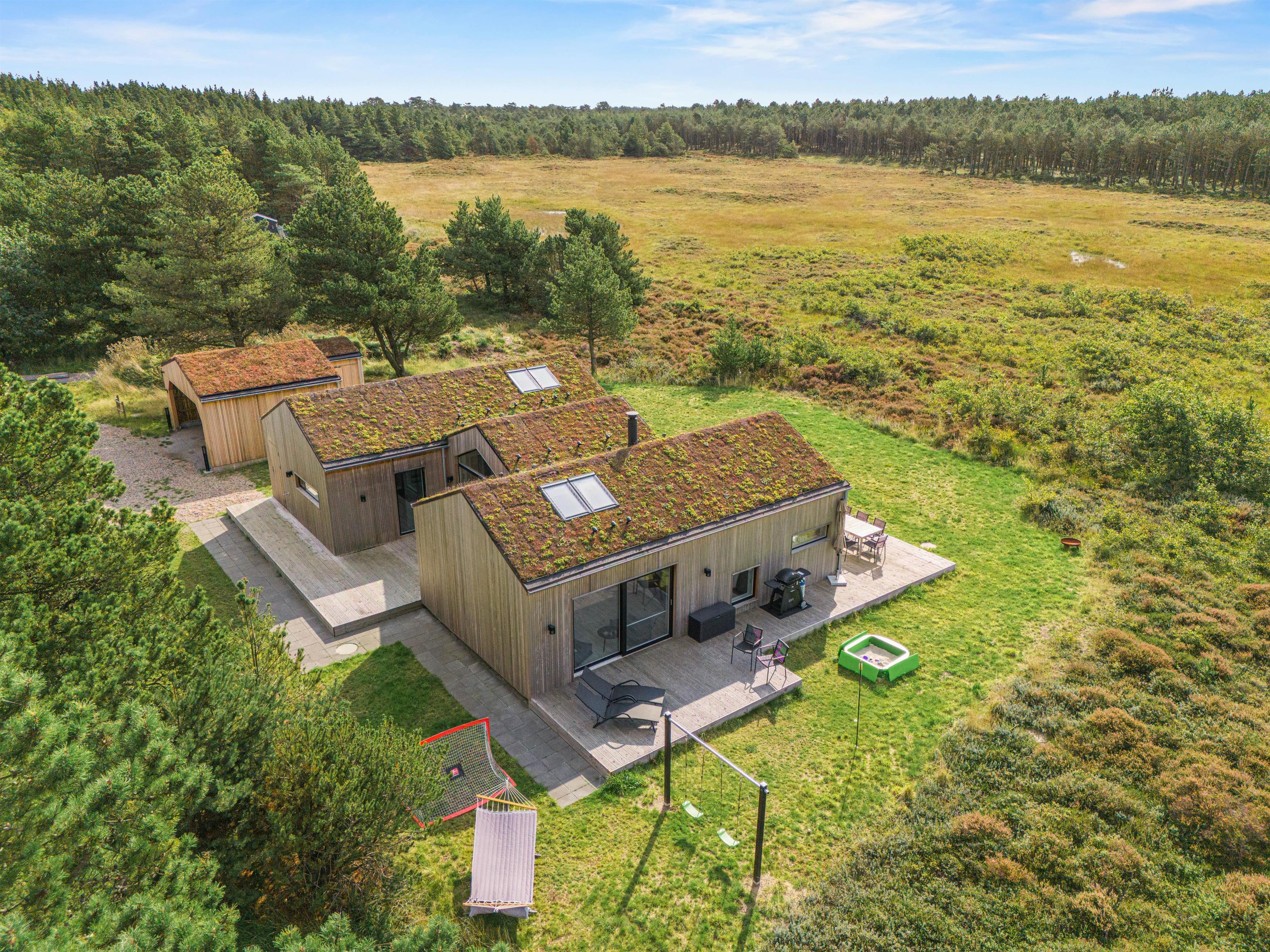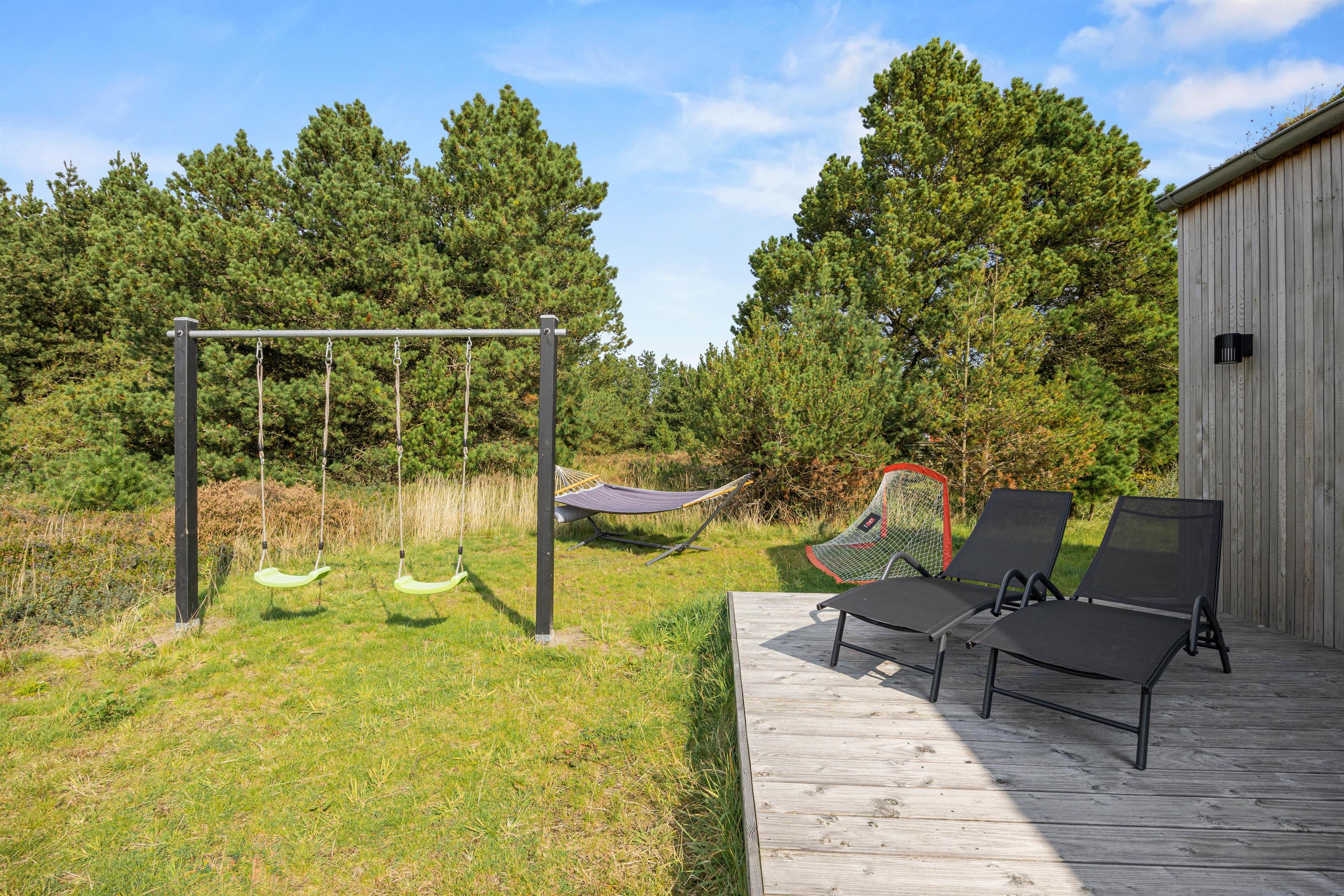 Et af højdepunkterne ved huset er den store træterrasse, der byder på to indbyggede badekar. Her kan I slappe af om aftenen med et koldt glas vin i badekarrene og nyde den skønne, lyngbeklædte natur og samtidig beundre den fantastiske udsigt. Der er fliser hele vejen rundt om terrassen. Huset er omgivet af en stor naturgrund, hvor der også findes sandkasse og gynge til de små. Udebruseren er til rådighed fra april til november.