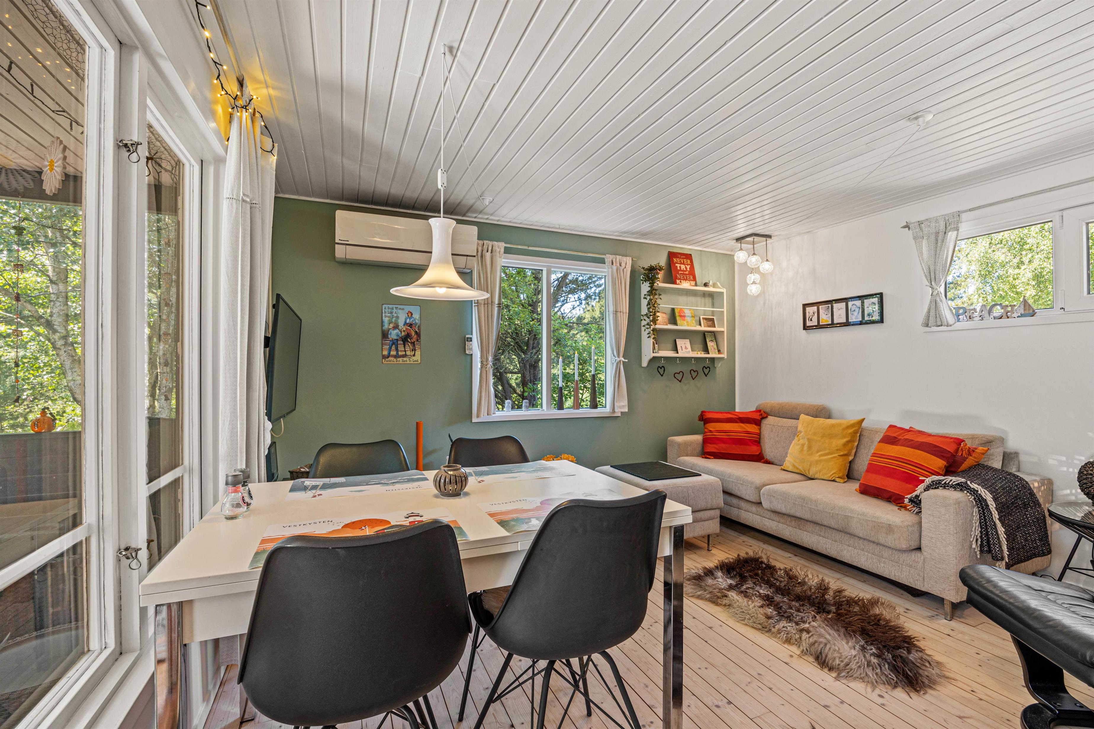 Dette charmerende feriehus blev renoveret i 2018 og er indrettet med lyse, træbeklædte vægge hyggelige møbler.