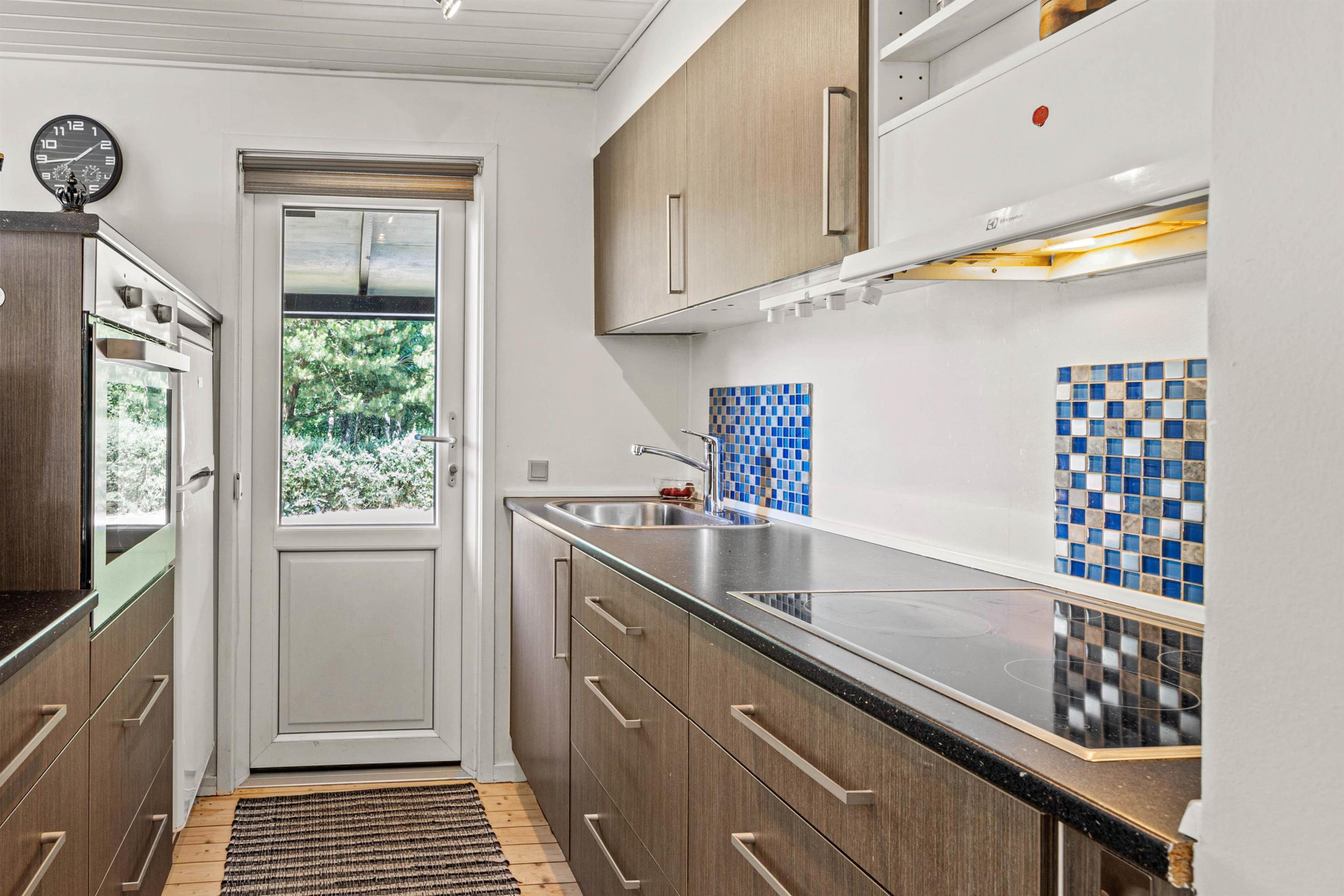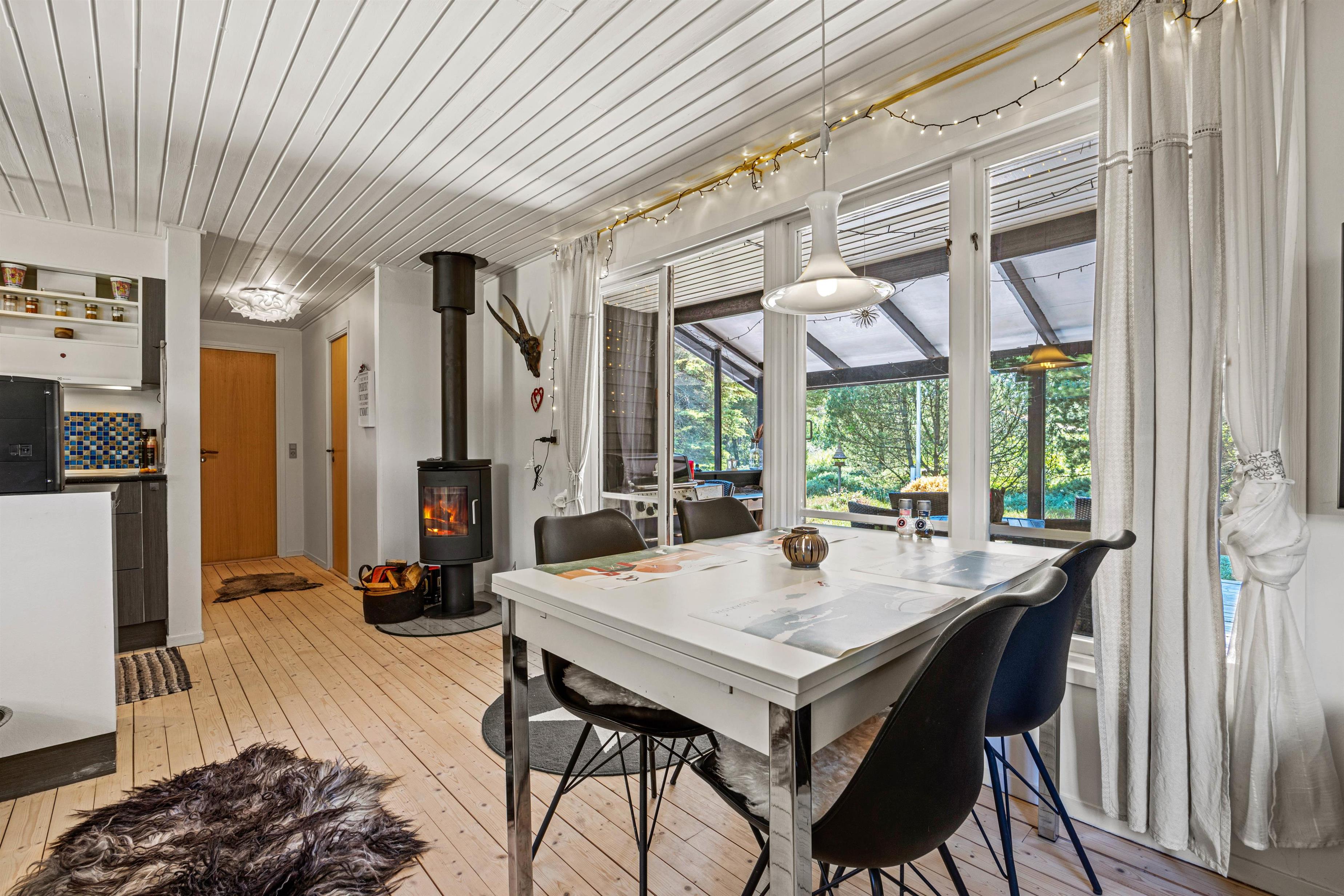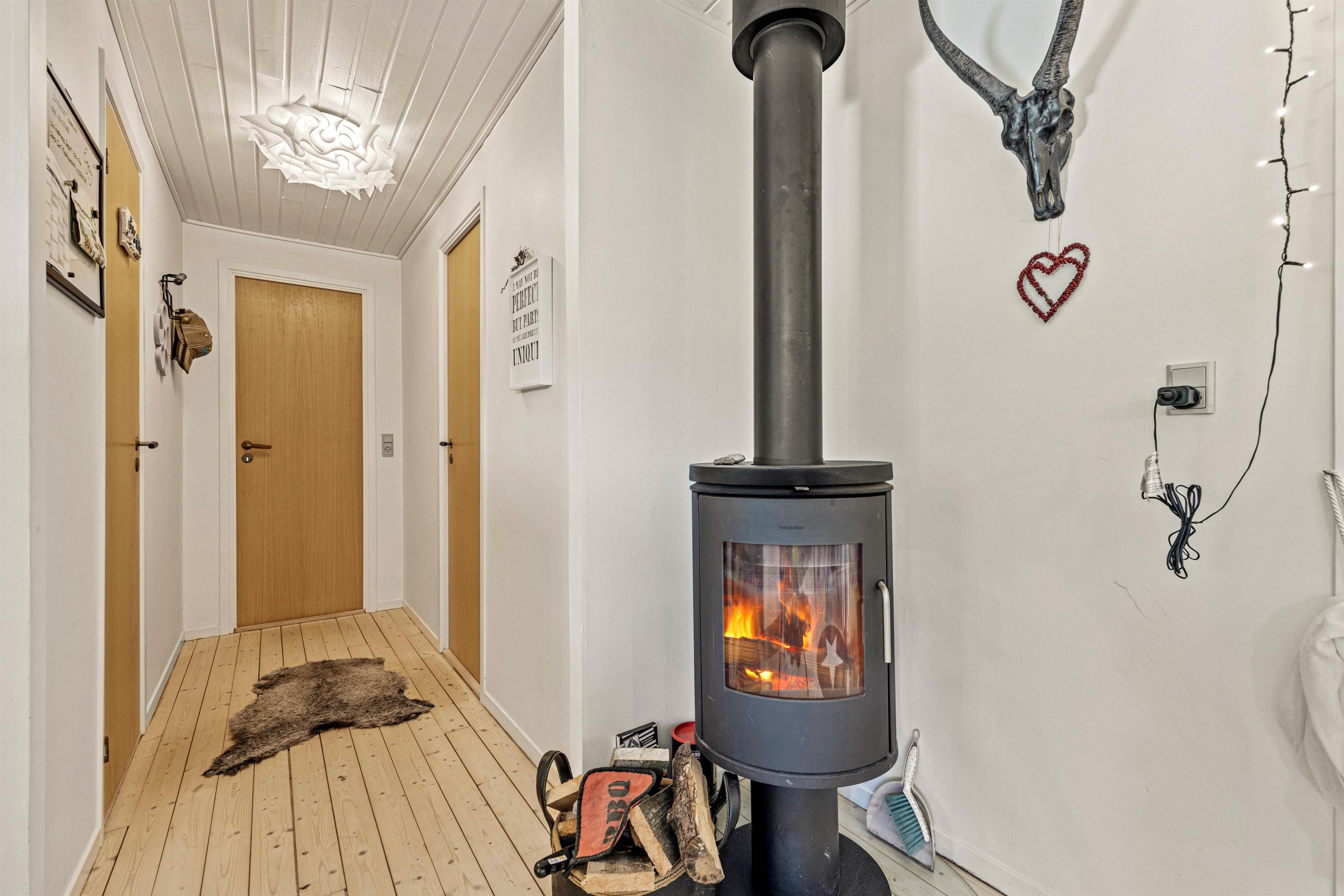 Feriehuset har et åbent opholdsrum med køkken og spisestue, hvor hele familien kan samles og skabe fælles minder. Brændeovnen sørger for hyggelige aftener og varmer huset op på kølige dage. Samtidig sørger en energibesparende varmepumpe for behagelige temperaturer året rundt.