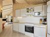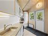 Det åbne køkken er praktisk udstyret og har bl.a. opvaskemaskine, mikrobølgeovn og et køleskab med fryseboks.