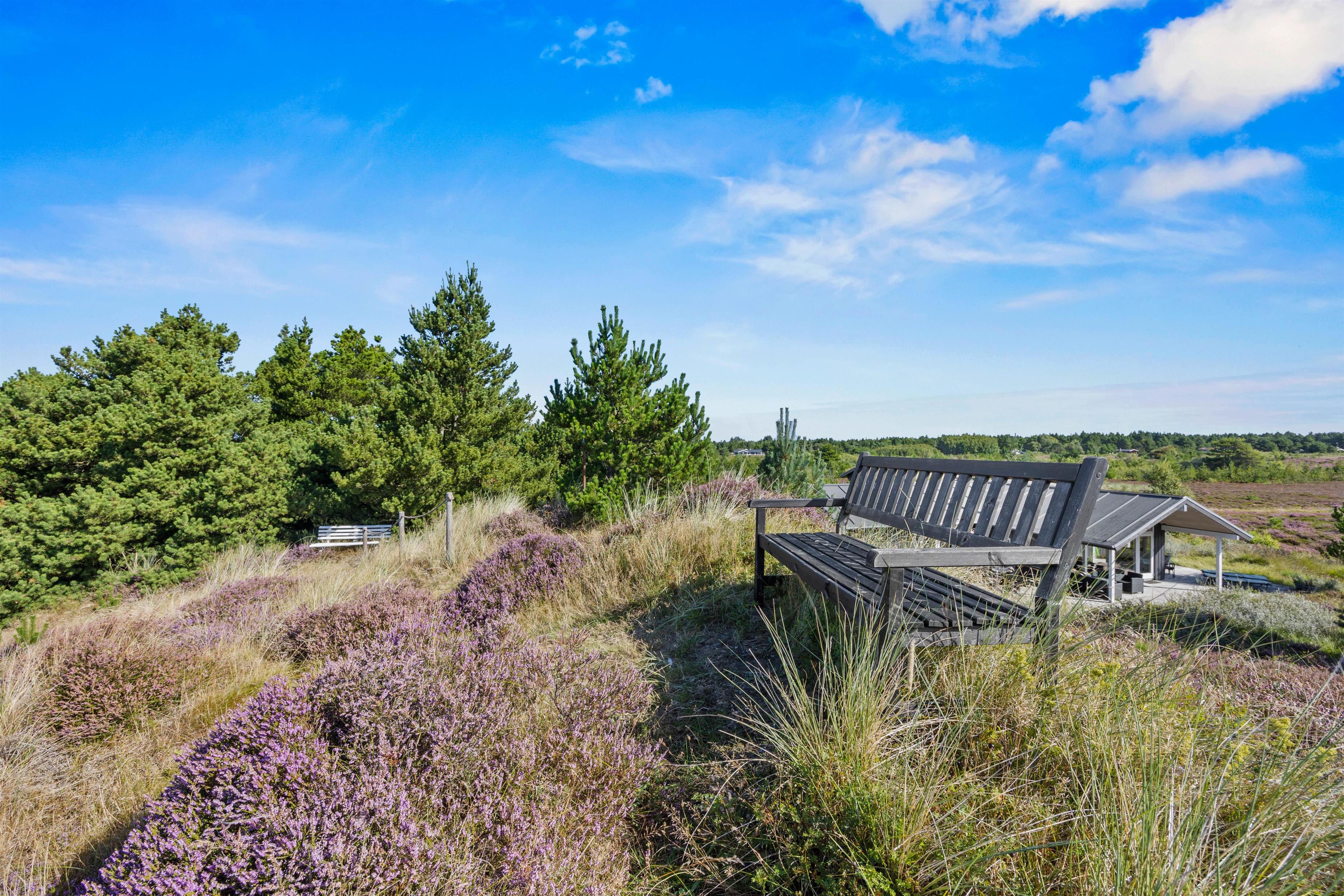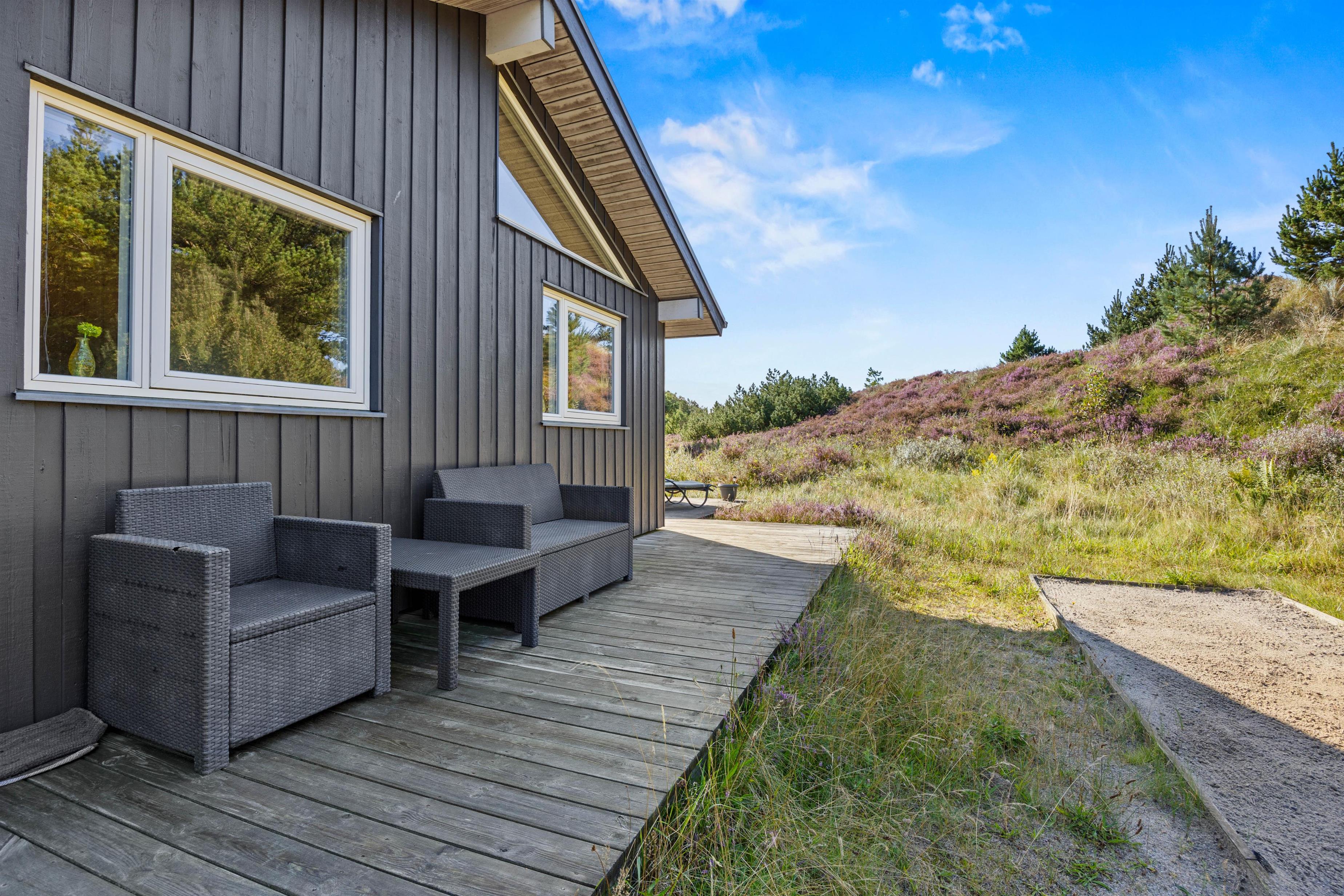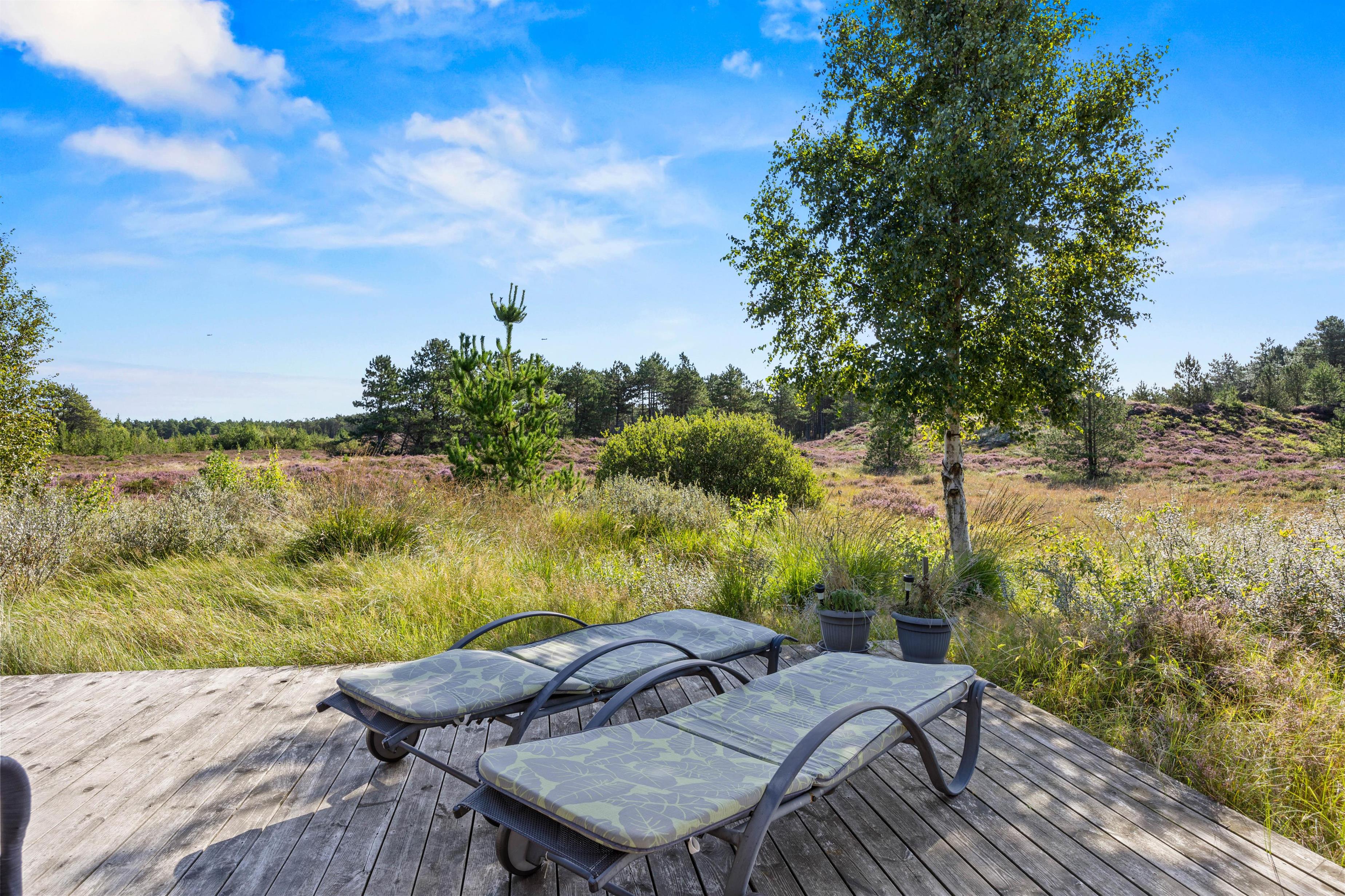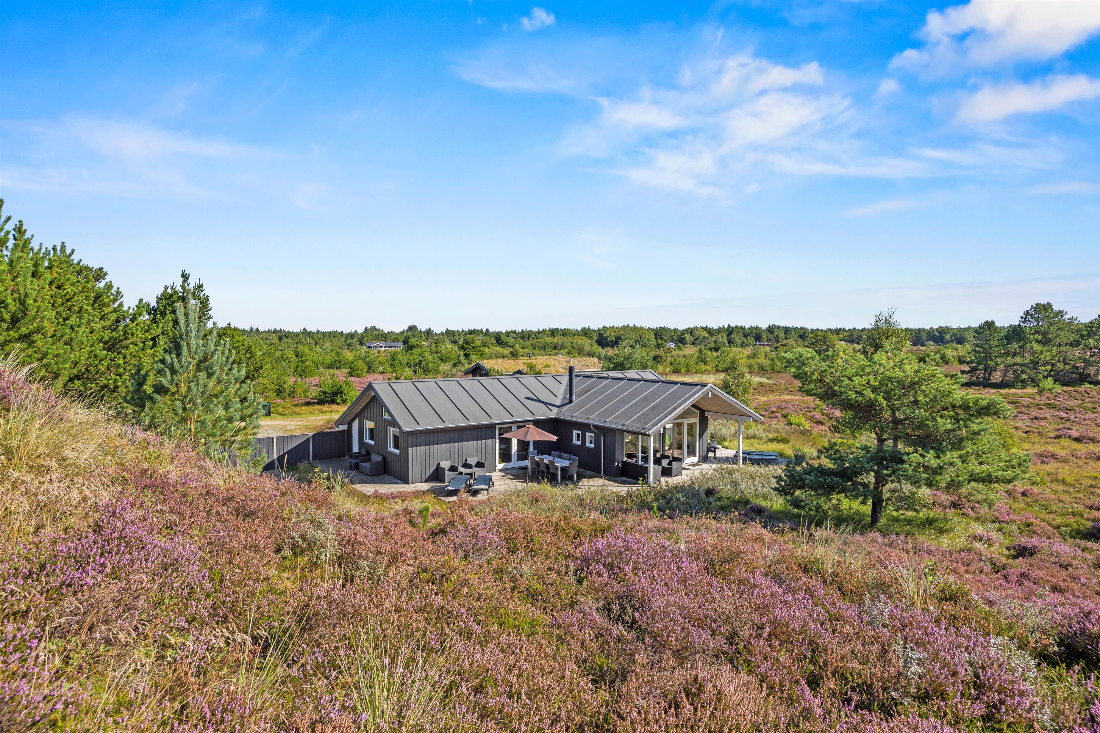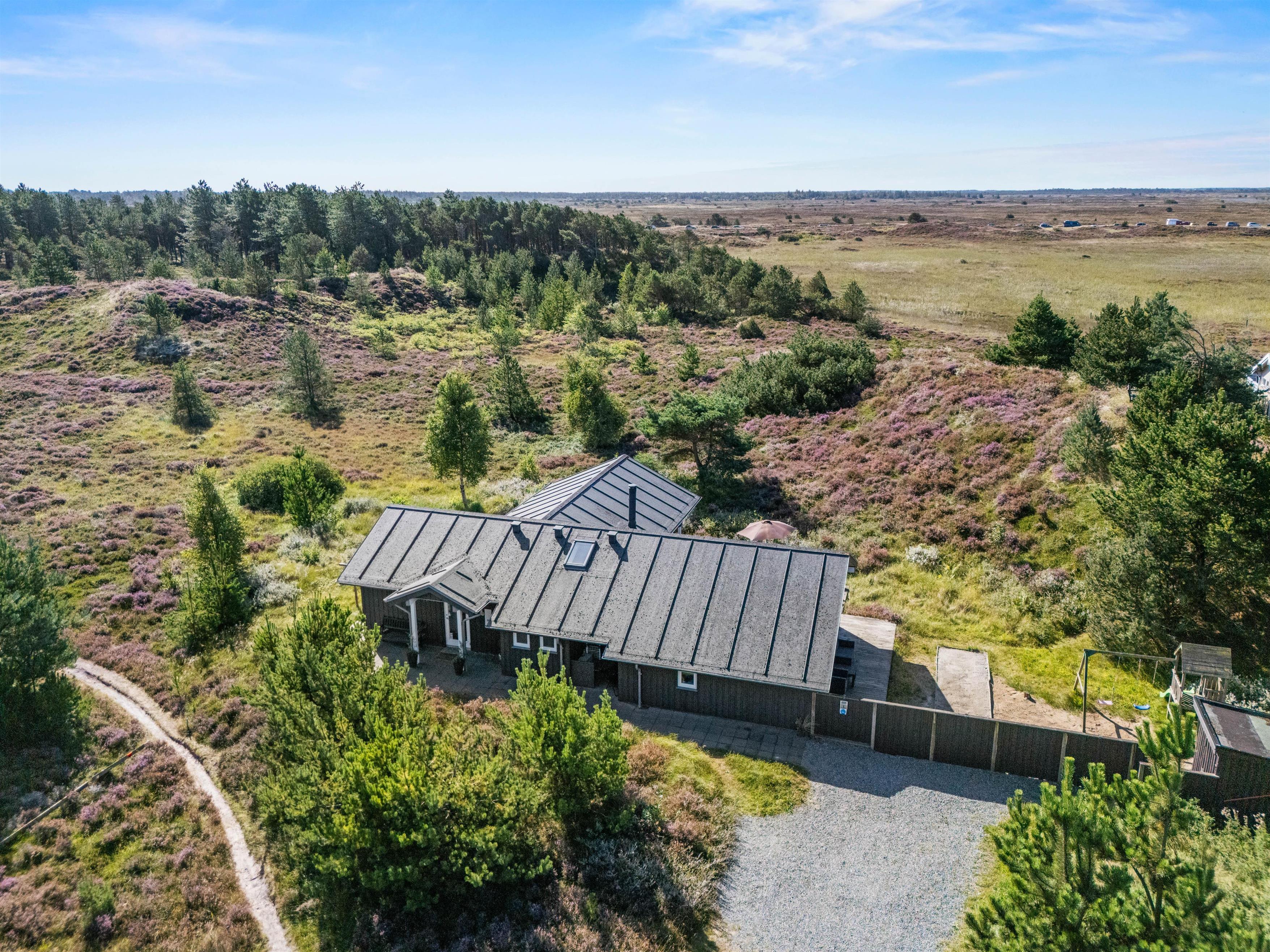 Fra opholdsområdet har I adgang til de delvist overdækkede terrasser, som indbyder til mange timer i frisk luft, solbadning eller til at afslutte dagen med et lækkert grillmåltid. Især når den omkringliggende hede blomstrer, har I en smuk udsigt, akkompagneret af fuglesang og duften af skov. For jeres børn er der egen legeplads på den 2.500 m2 store grund. Klatring, rutsjebane, gynger og sandkasse - mens I tilbereder maden eller måske læser en bog, er børnene godt beskæftiget. På bakken ved siden af huset, er der lavet en lille sti op til toppen. Der kan I sidde på en bænk og nyde solnedgangen.