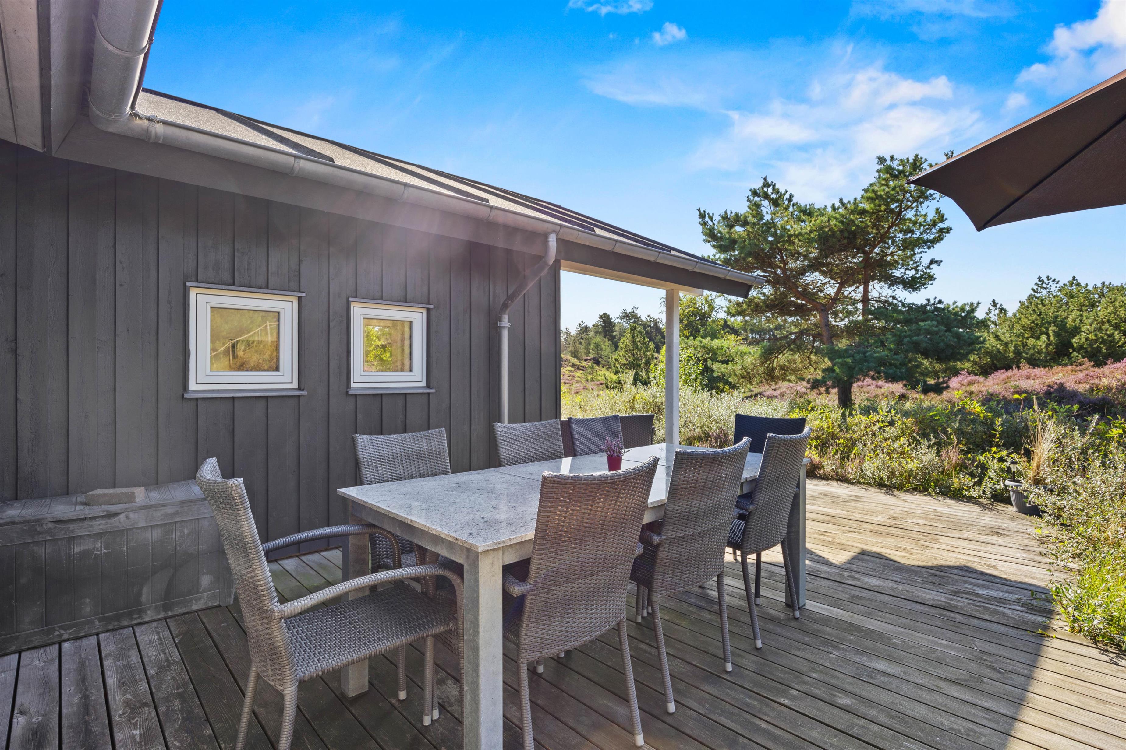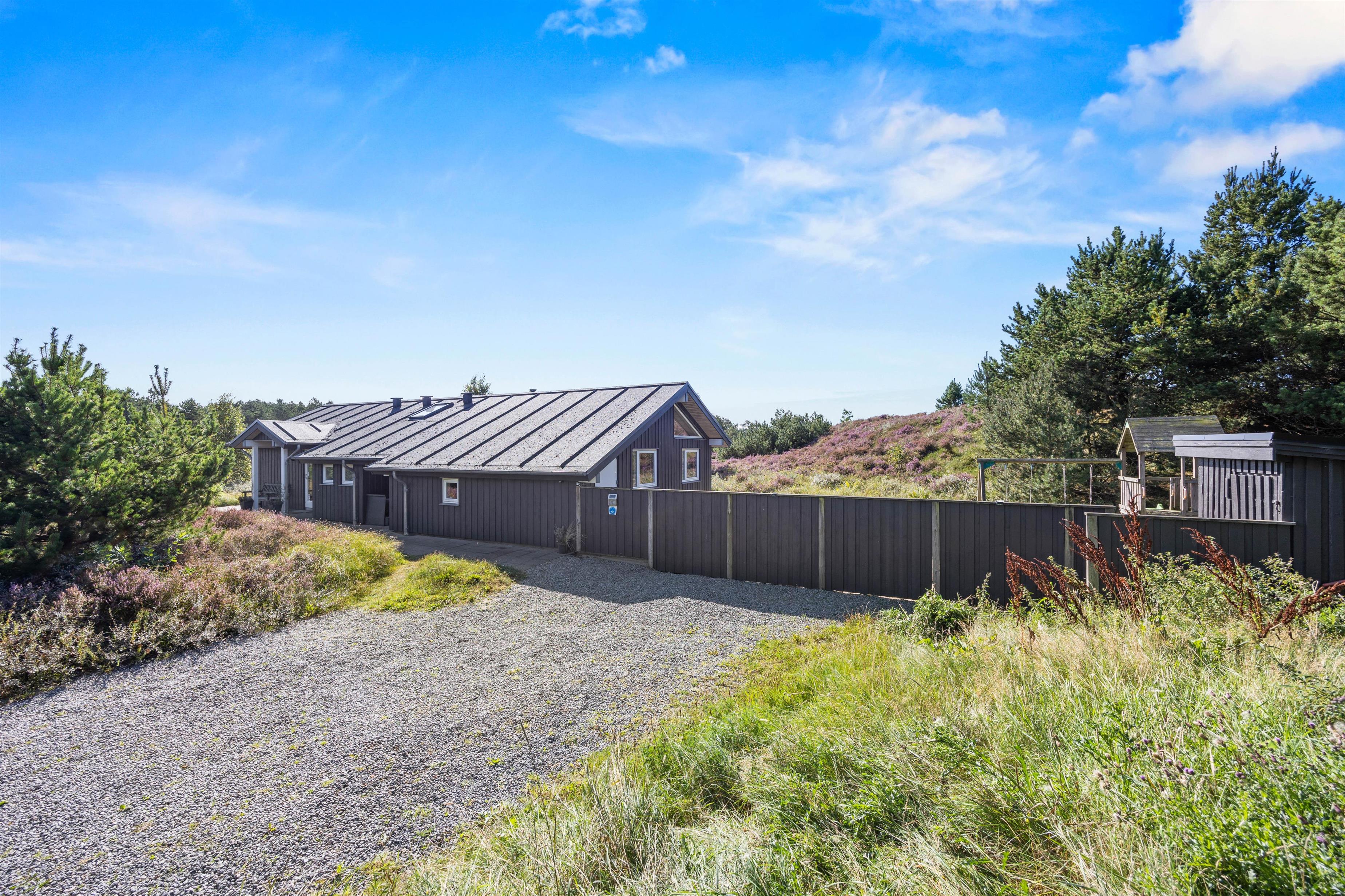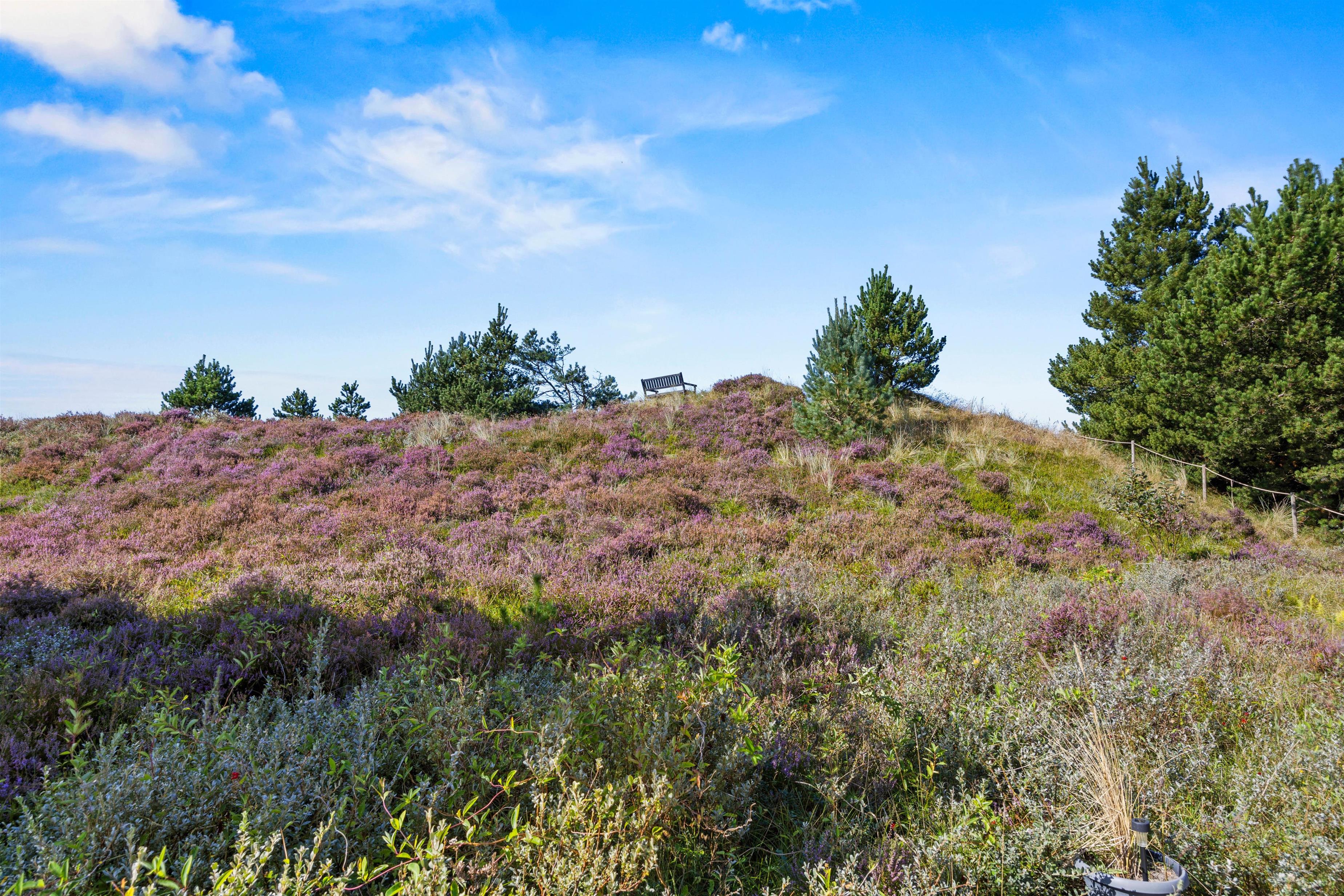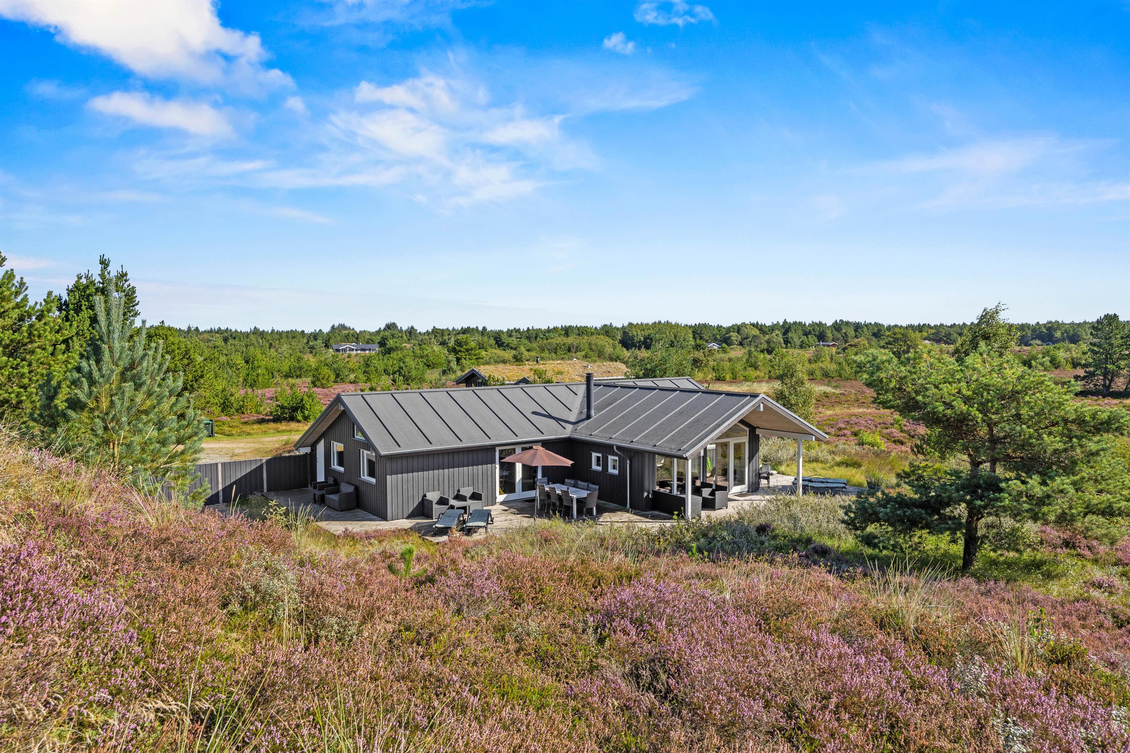 Fra opholdsområdet har I adgang til de delvist overdækkede terrasser, som indbyder til mange timer i frisk luft, solbadning eller til at afslutte dagen med et lækkert grillmåltid. Især når den omkringliggende hede blomstrer, har I en smuk udsigt, akkompagneret af fuglesang og duften af skov. For jeres børn er der egen legeplads på den 2.500 m2 store grund. Klatring, rutsjebane, gynger og sandkasse - mens I tilbereder maden eller måske læser en bog, er børnene godt beskæftiget. På bakken ved siden af huset, er der lavet en lille sti op til toppen. Der kan I sidde på en bænk og nyde solnedgangen.
