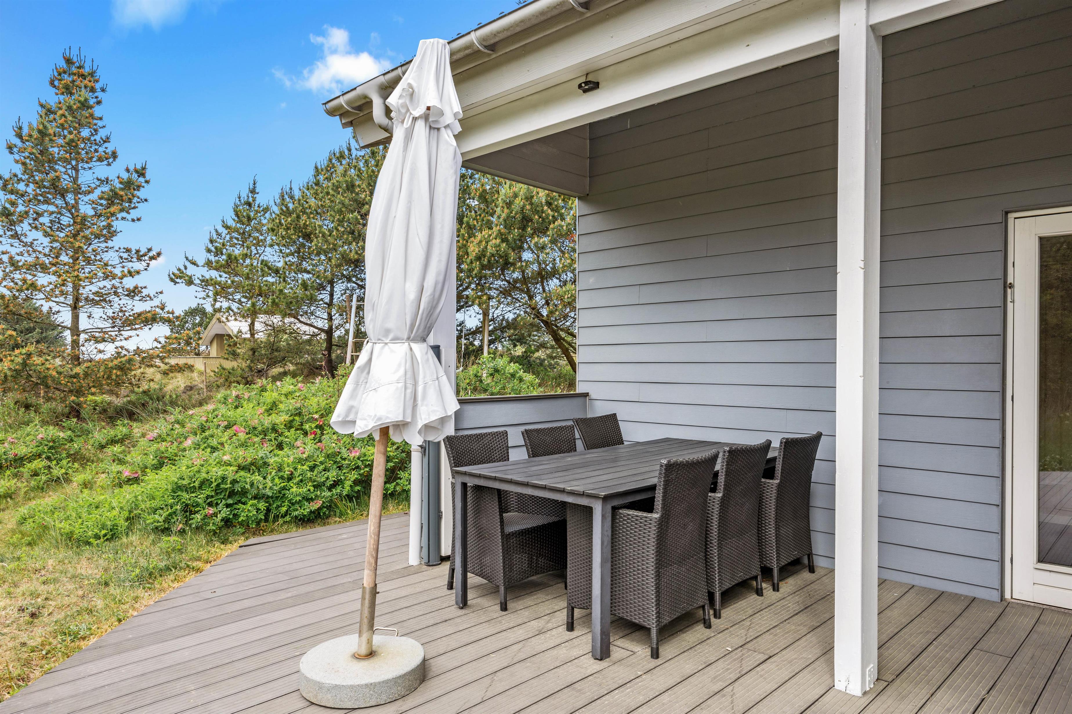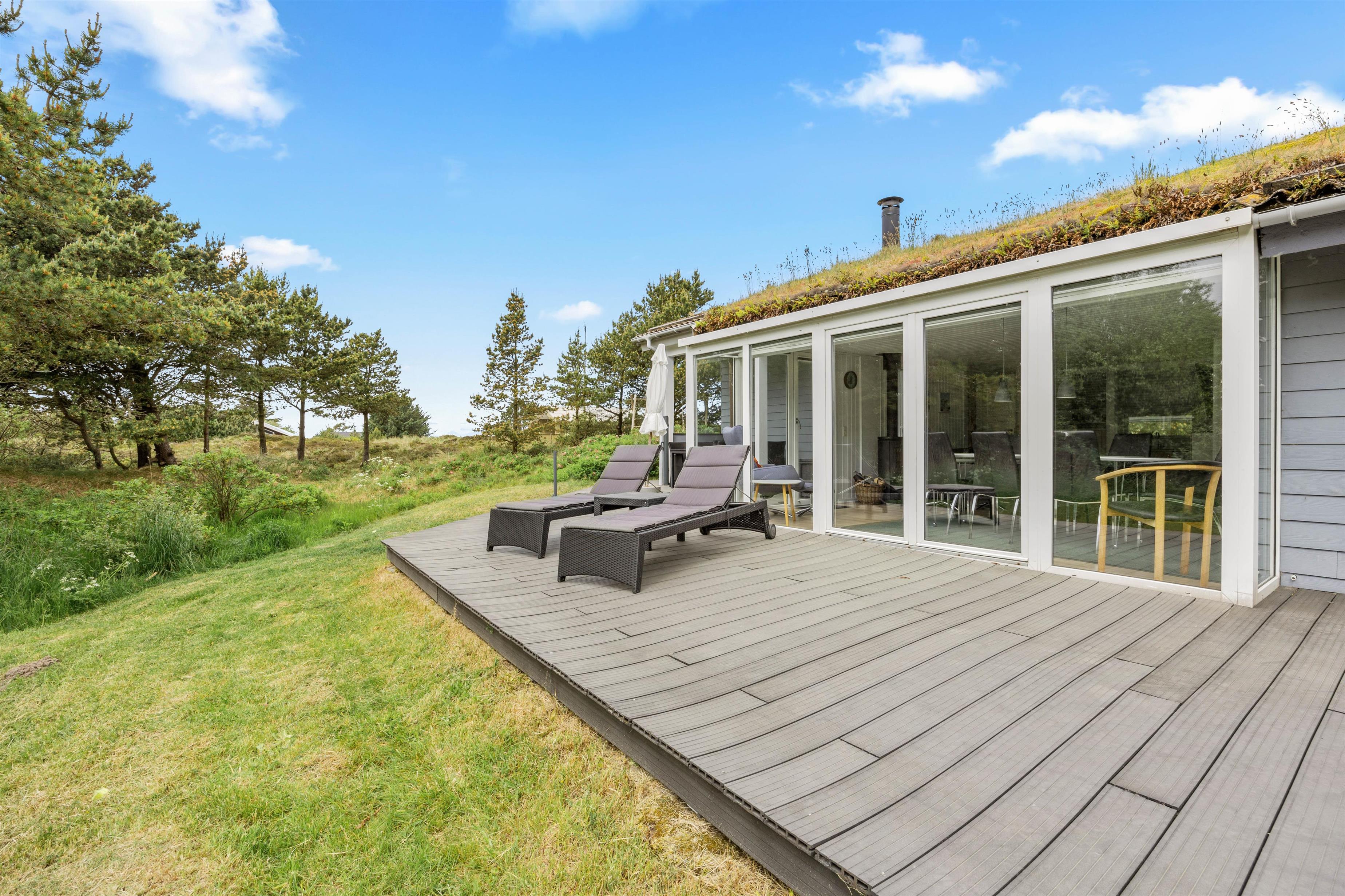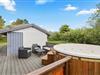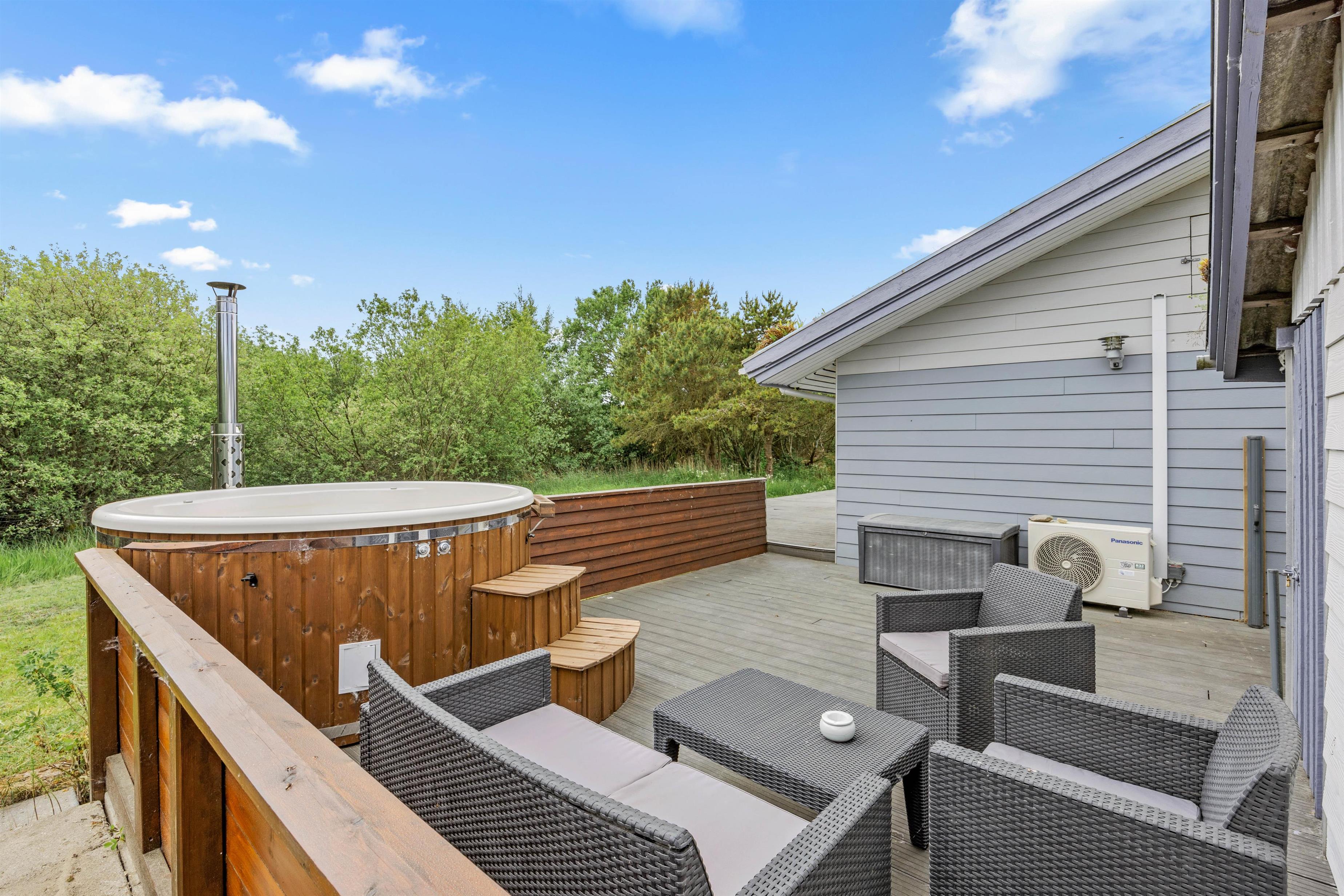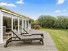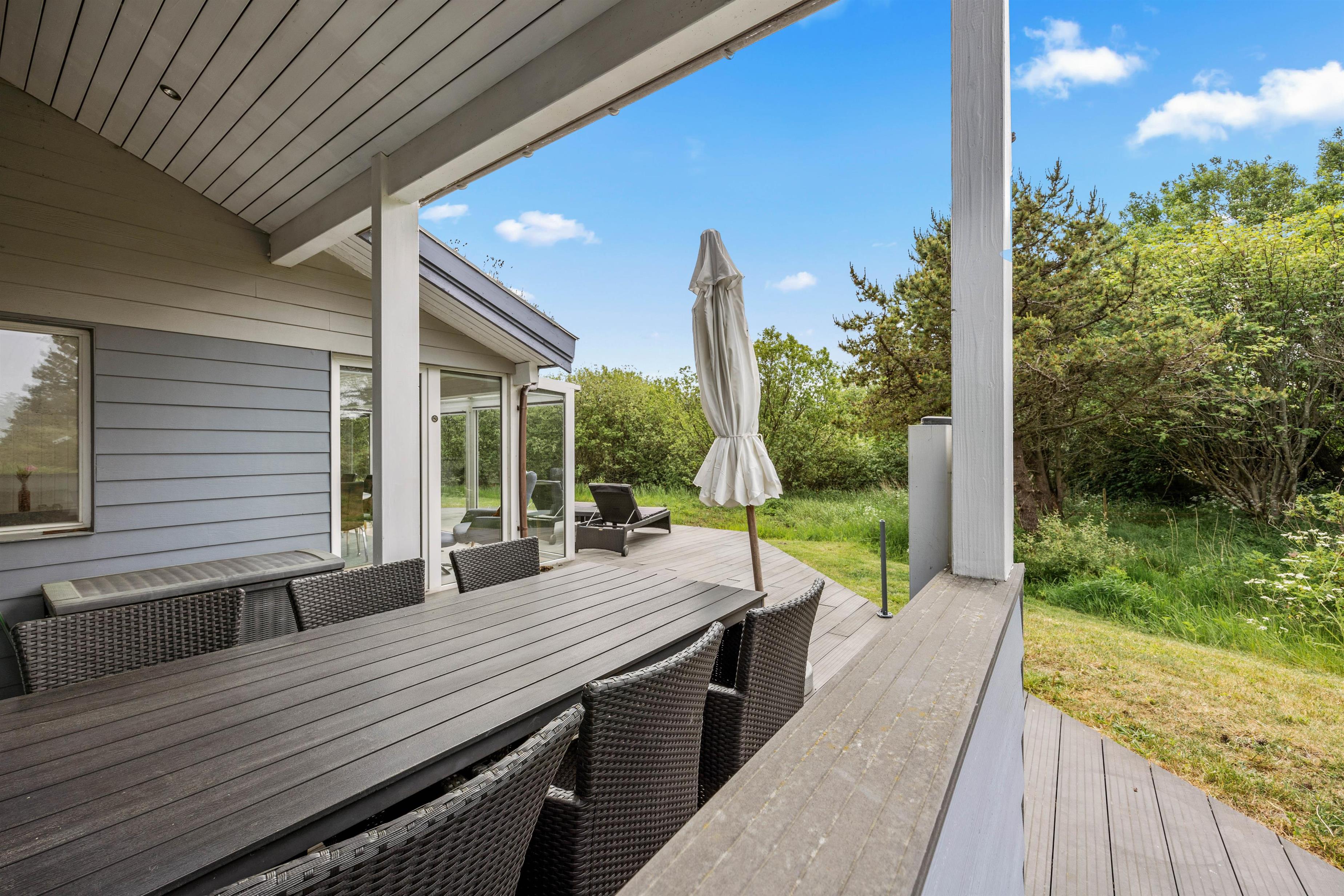 Den store træterrasse snor sig helt rundt om sommerhuset og giver rig mulighed for afslapning og føle sig godt tilpas udendørs. Der er to gynger i haven, behagelige solsenge på den delvist overdækkede terrasse, flere siddepladser, og selvfølgelig er der også en grill.