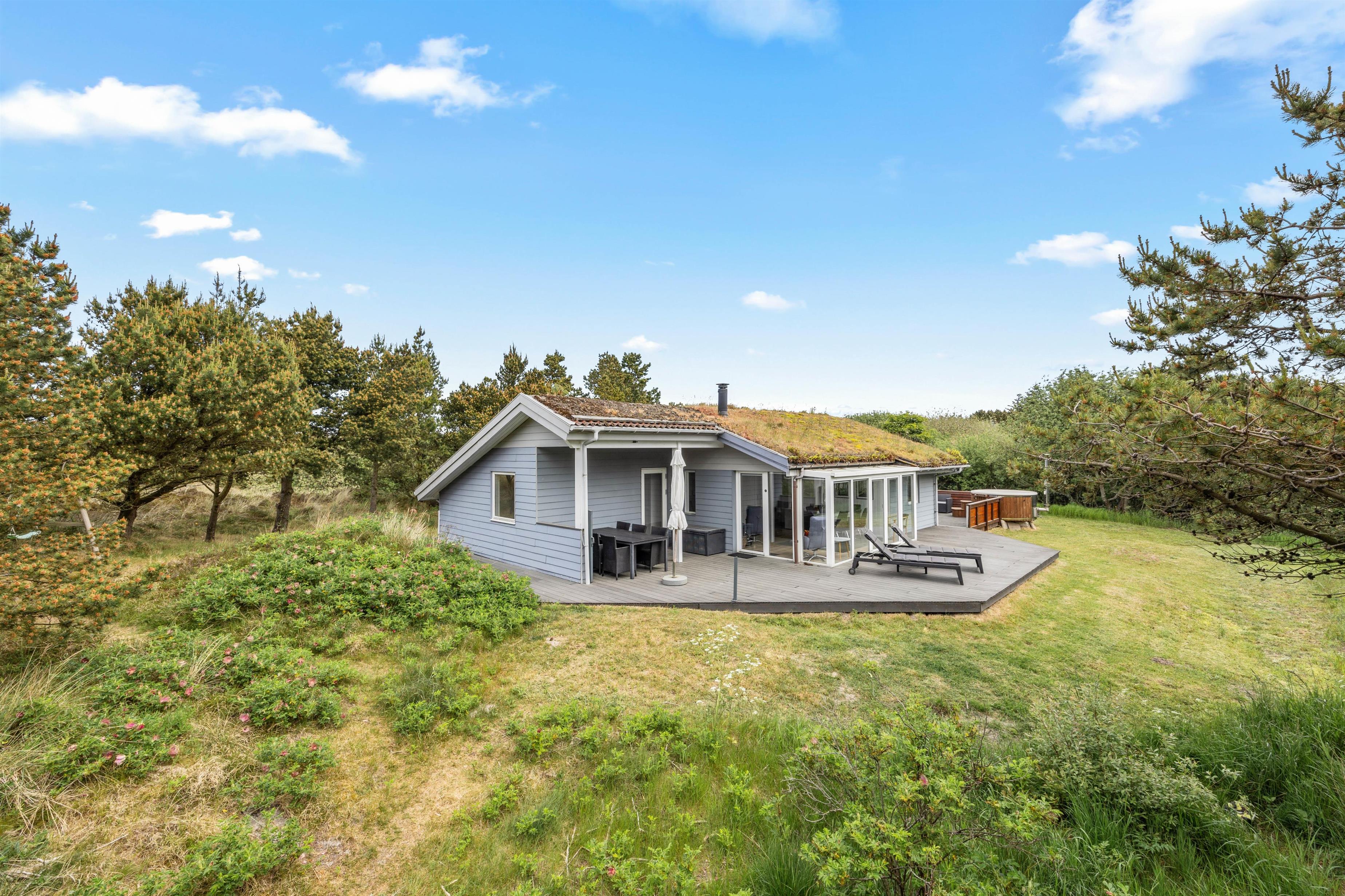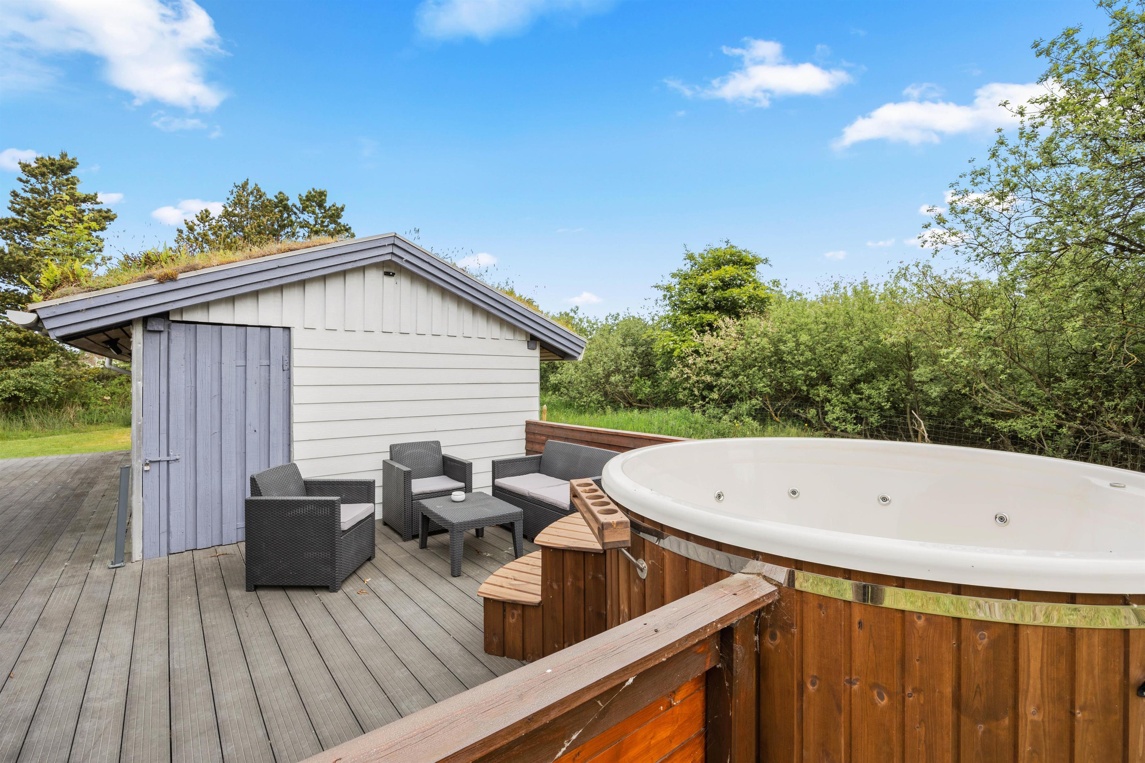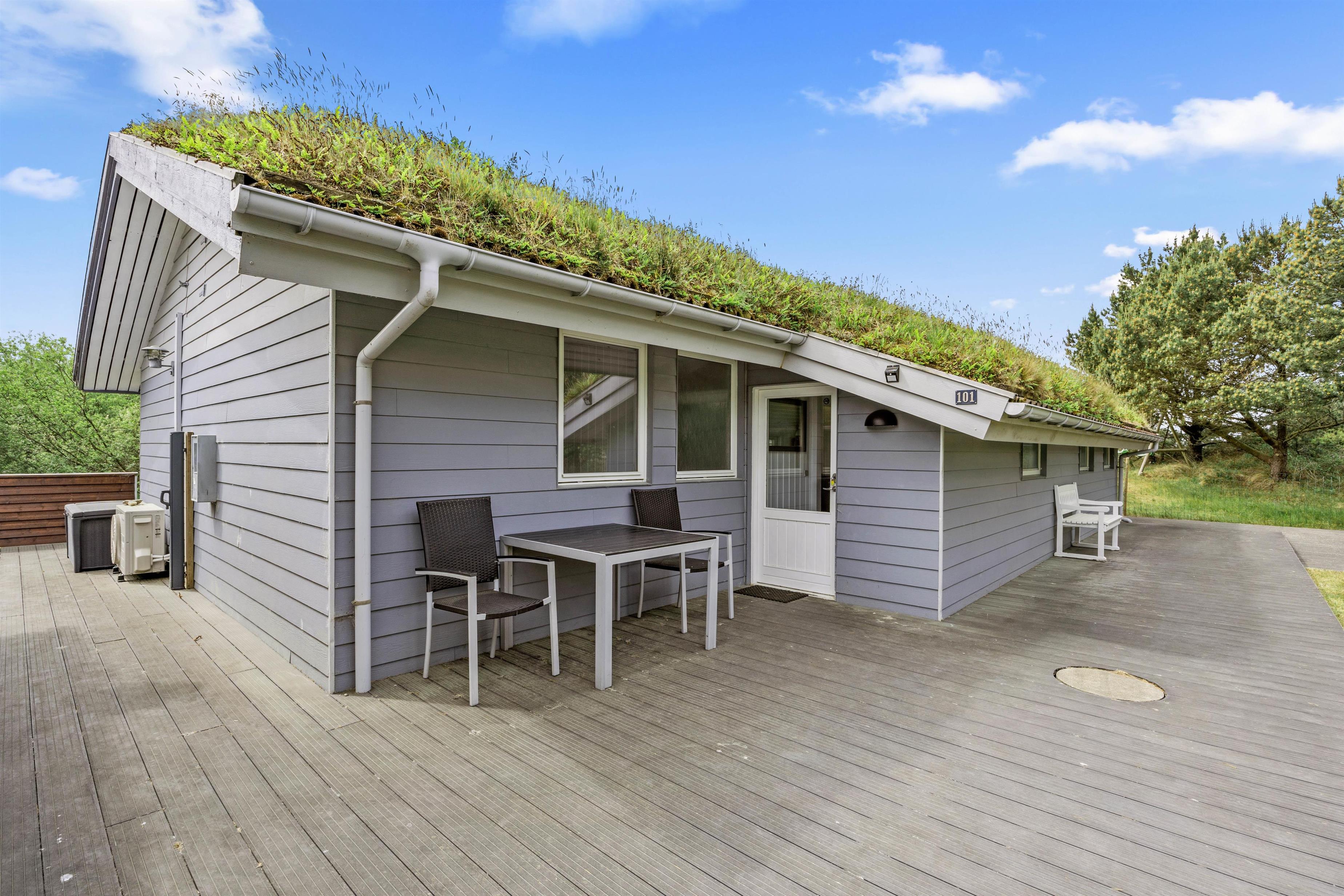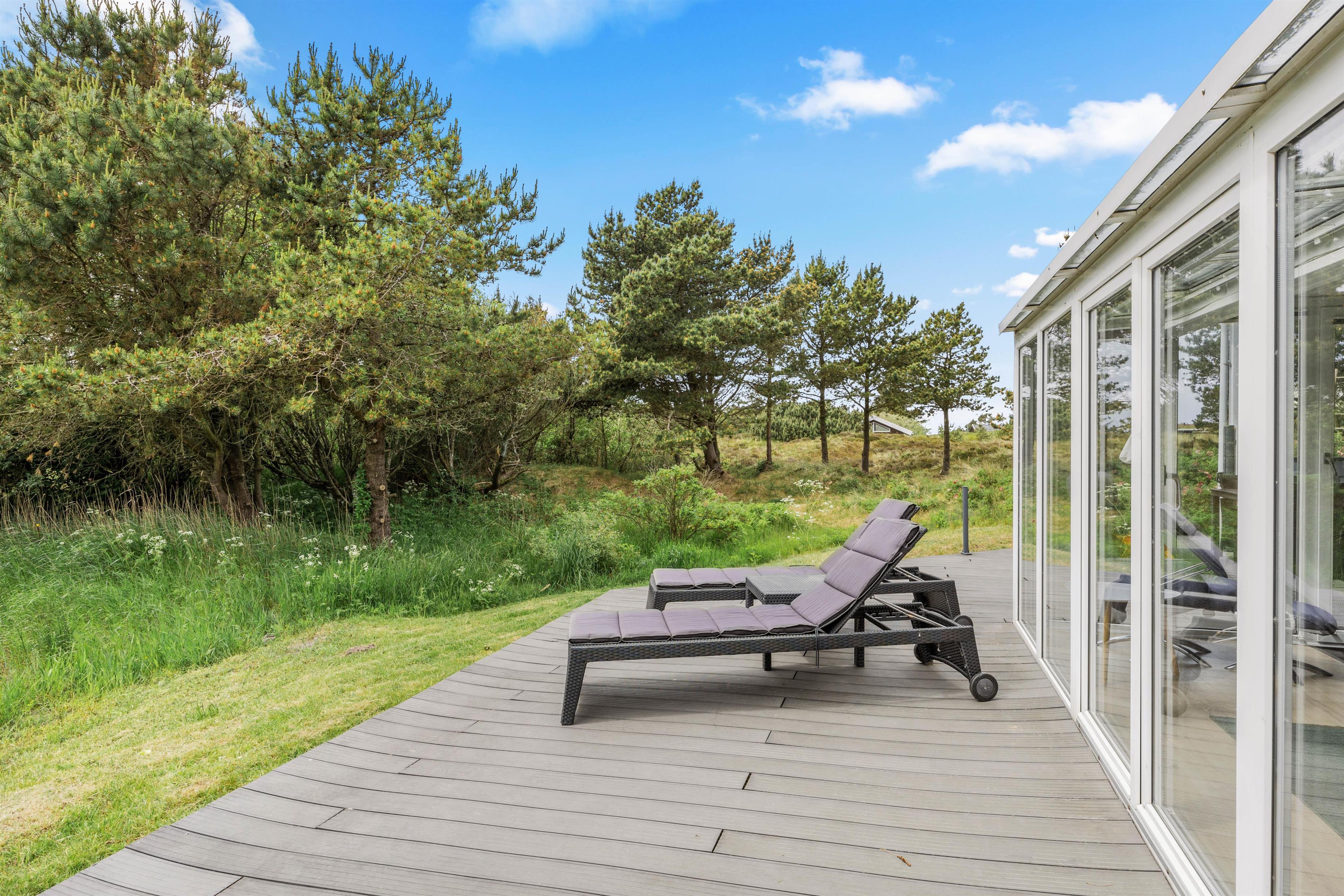 Den store træterrasse snor sig helt rundt om sommerhuset og giver rig mulighed for afslapning og føle sig godt tilpas udendørs. Der er to gynger i haven, behagelige solsenge på den delvist overdækkede terrasse, flere siddepladser, og selvfølgelig er der også en grill.