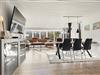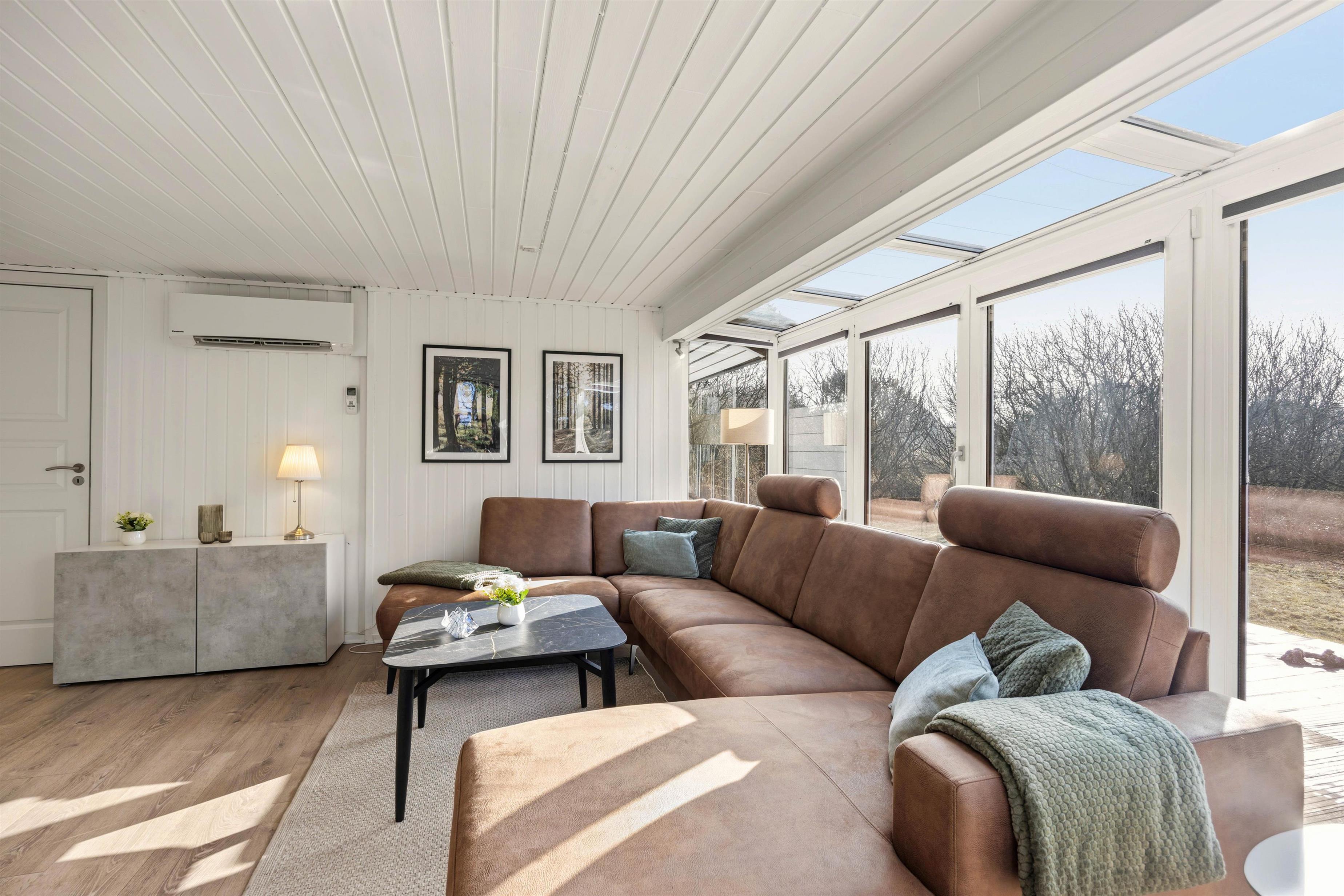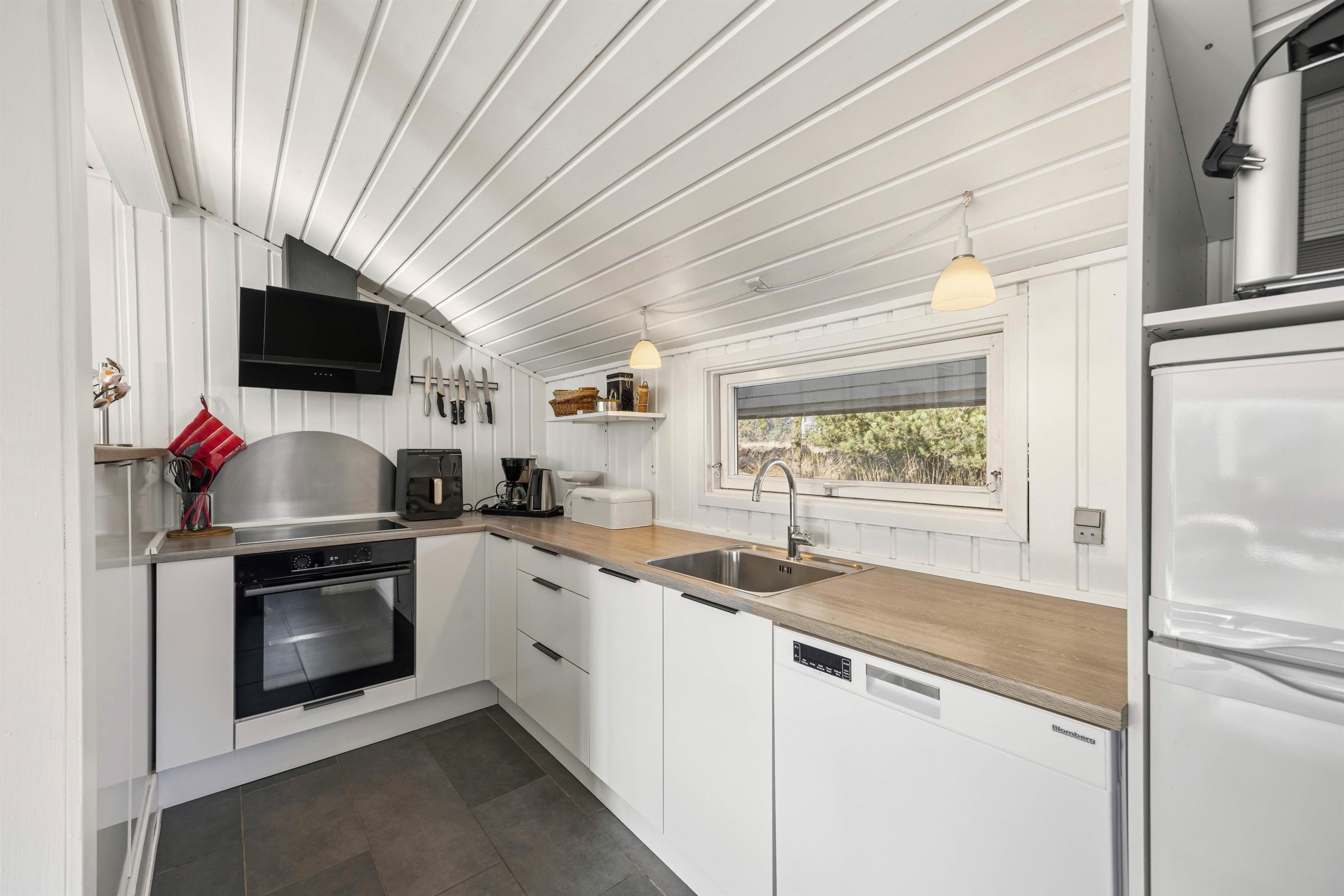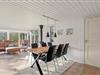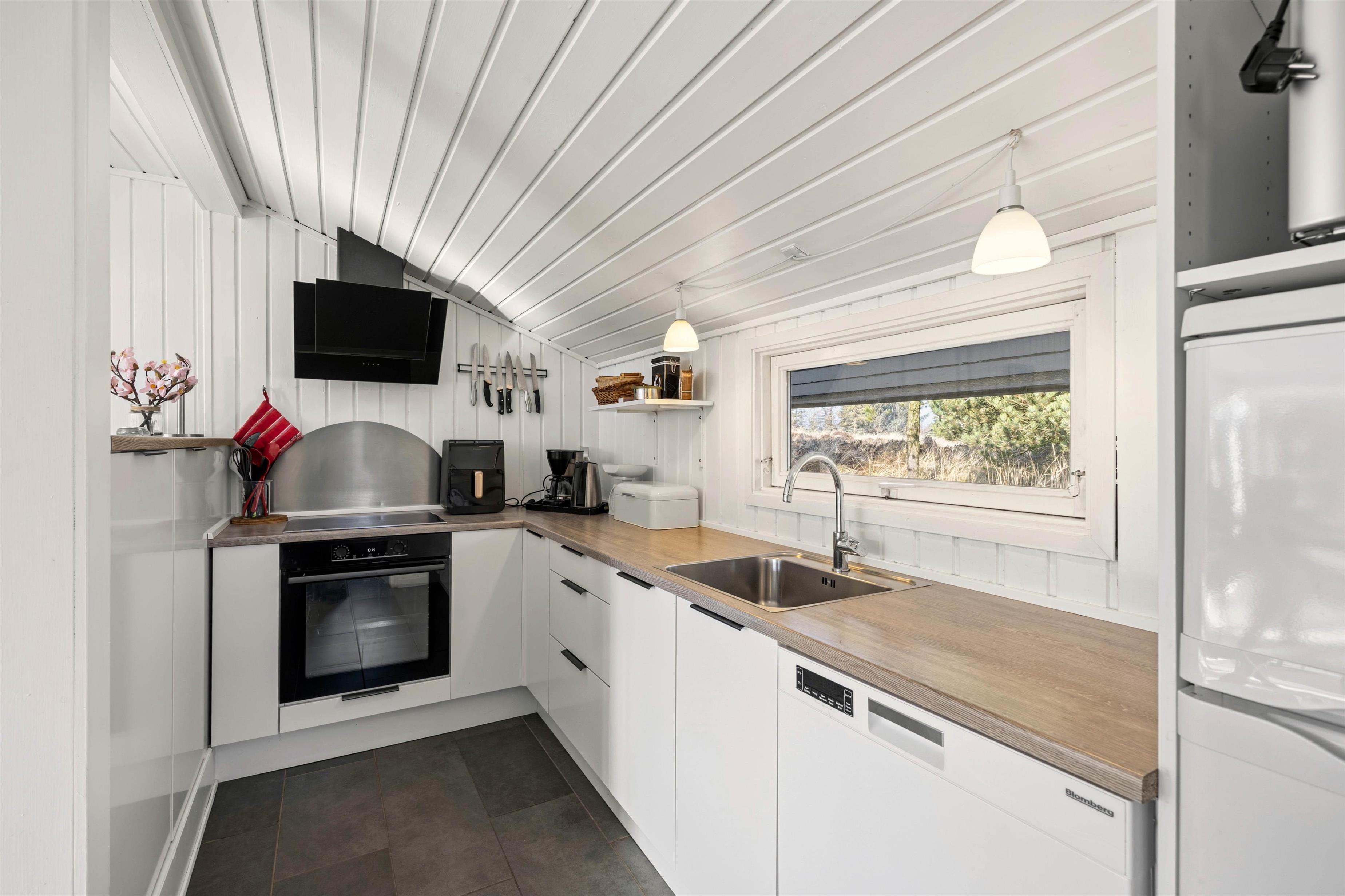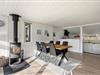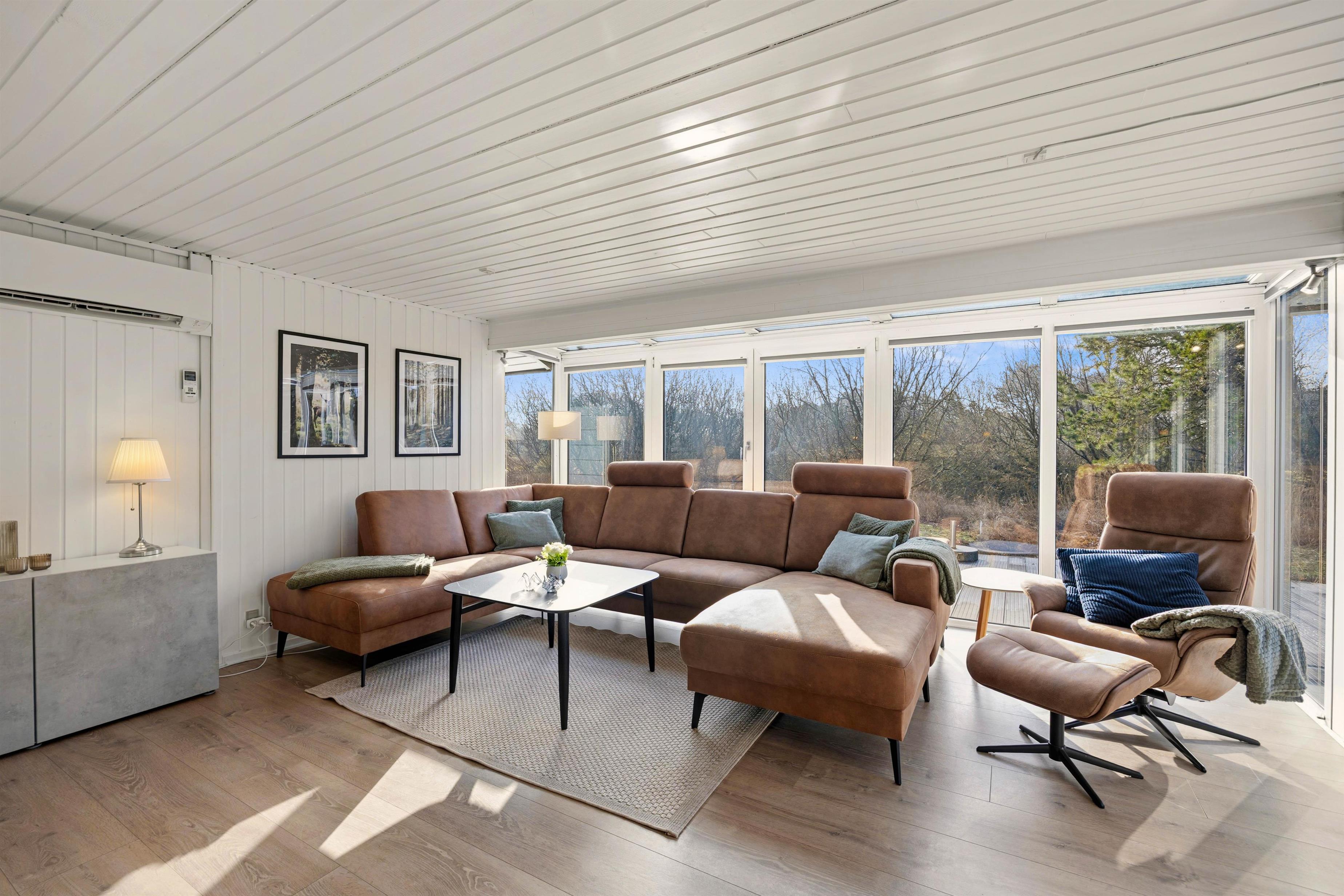 Det rummelige opholds- og spisestue ligger i åben forbindelse med det veludstyrede og velholdte køkken. Fra opholdsstuen har I en utroligt smuk panoramaudsigt ud i naturen og til terrassen. En brændeovn samt en varmepumpe gør huset hyggeligt i de kølige årstider.