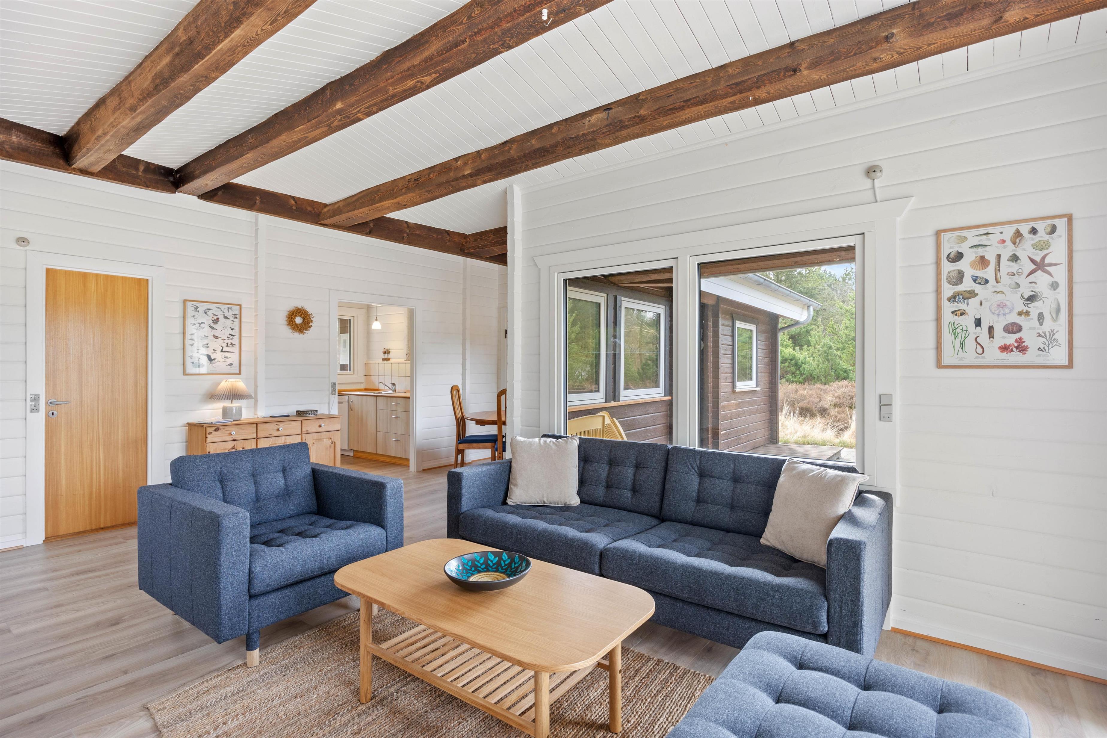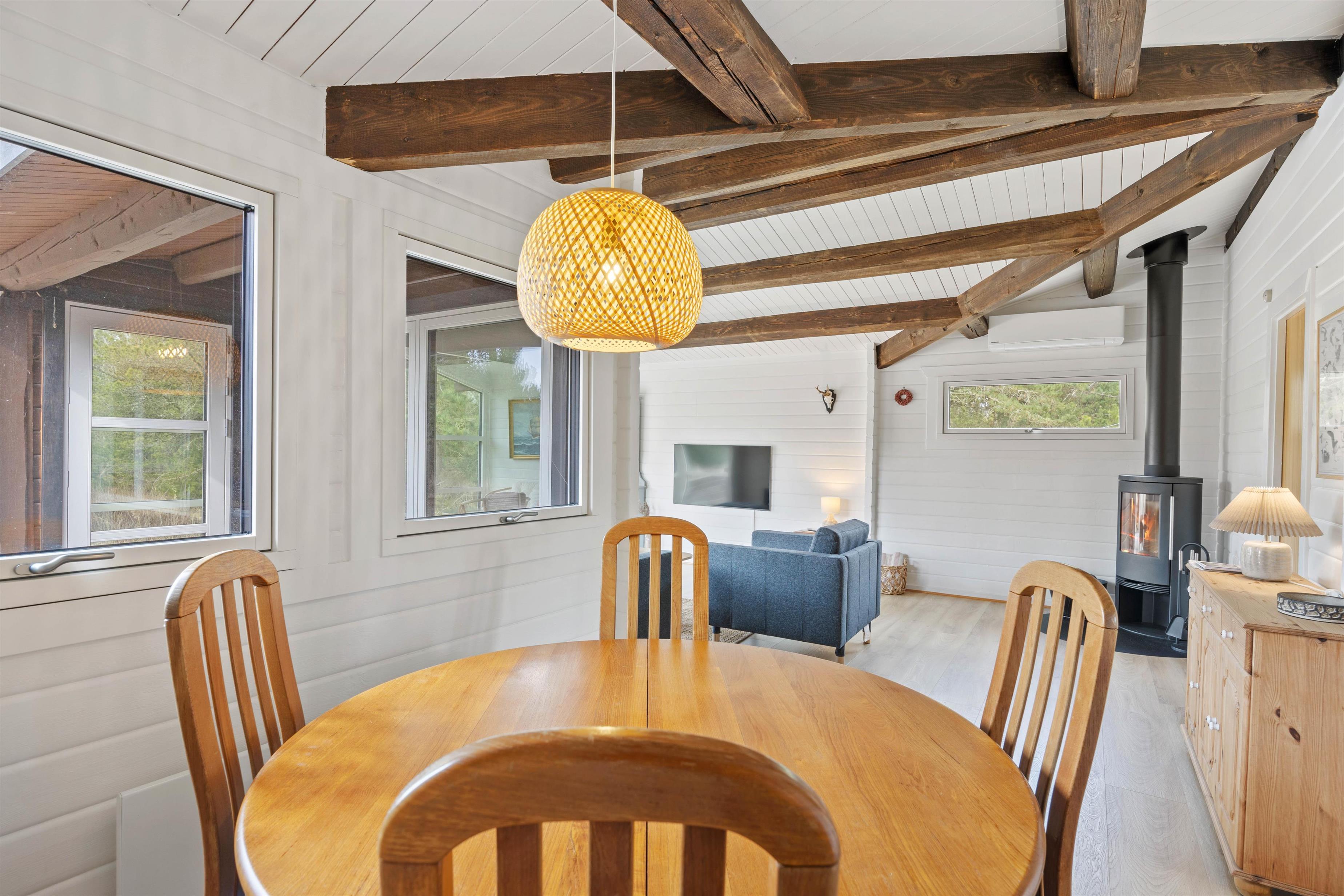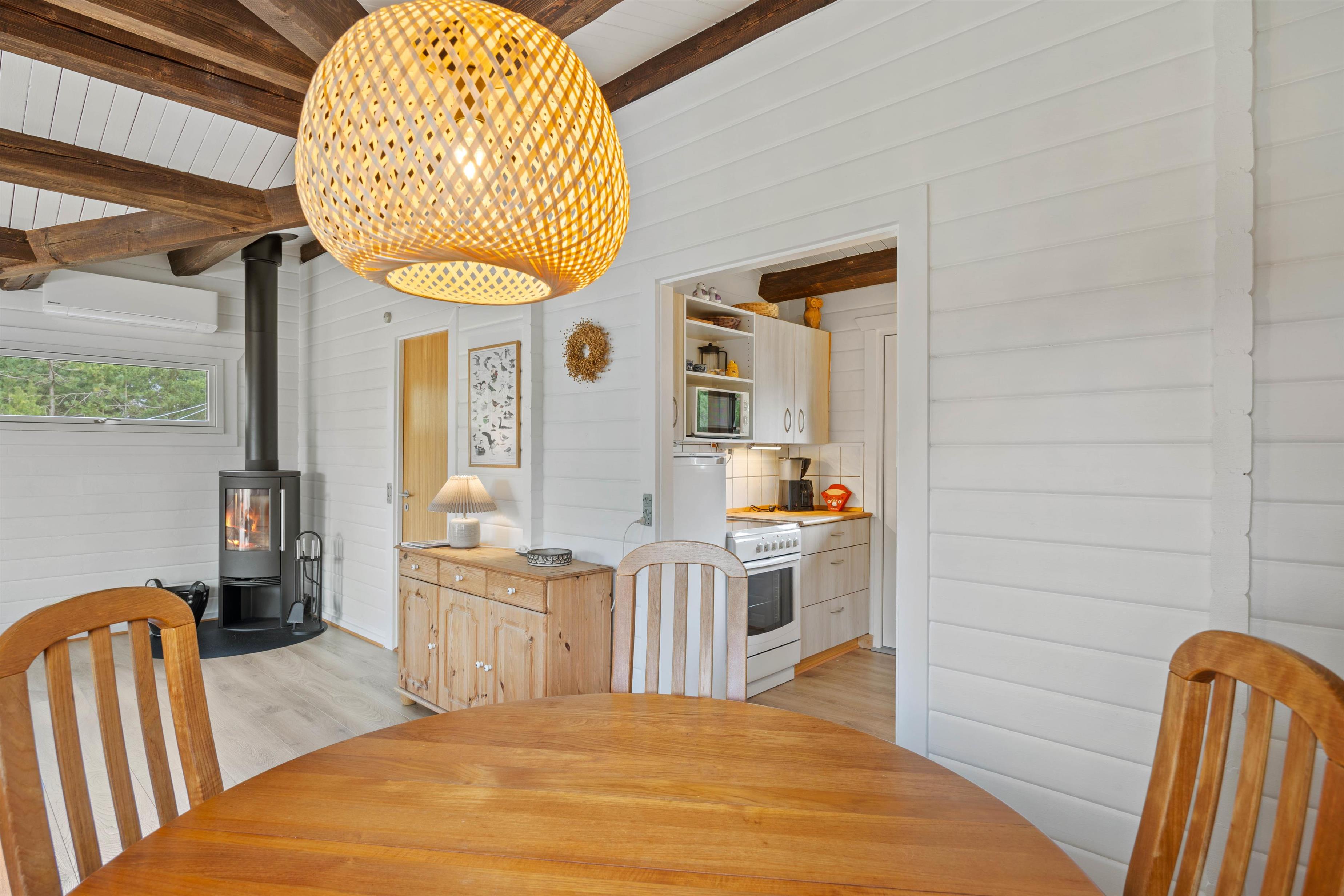 Velkommen indenfor på Trinnesvej 1! Et hyggeligt sommerhus, der emmer af sommerhusstemning med træbeklædte vægge, smukke loftbjælker og en knitrende brændeovn. Brændeovnen bidrager til en varm og indbydende atmosfære, perfekt til de køligere aftner. I stuen kan hele familien samles til mange gode stunder med brætspil, ferielæsning og meget mere!