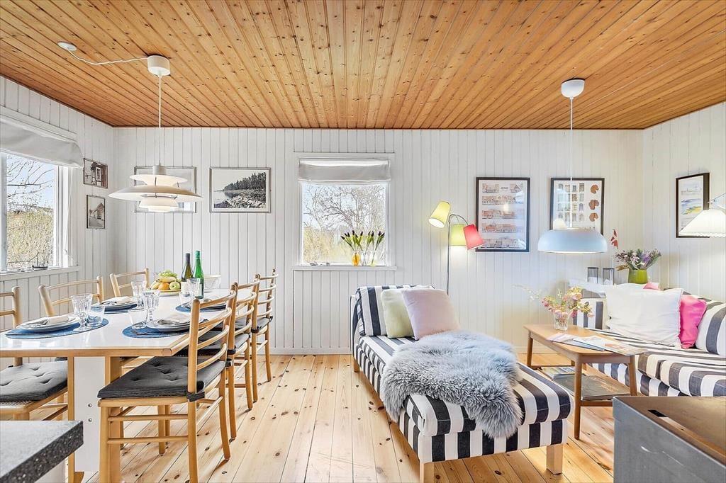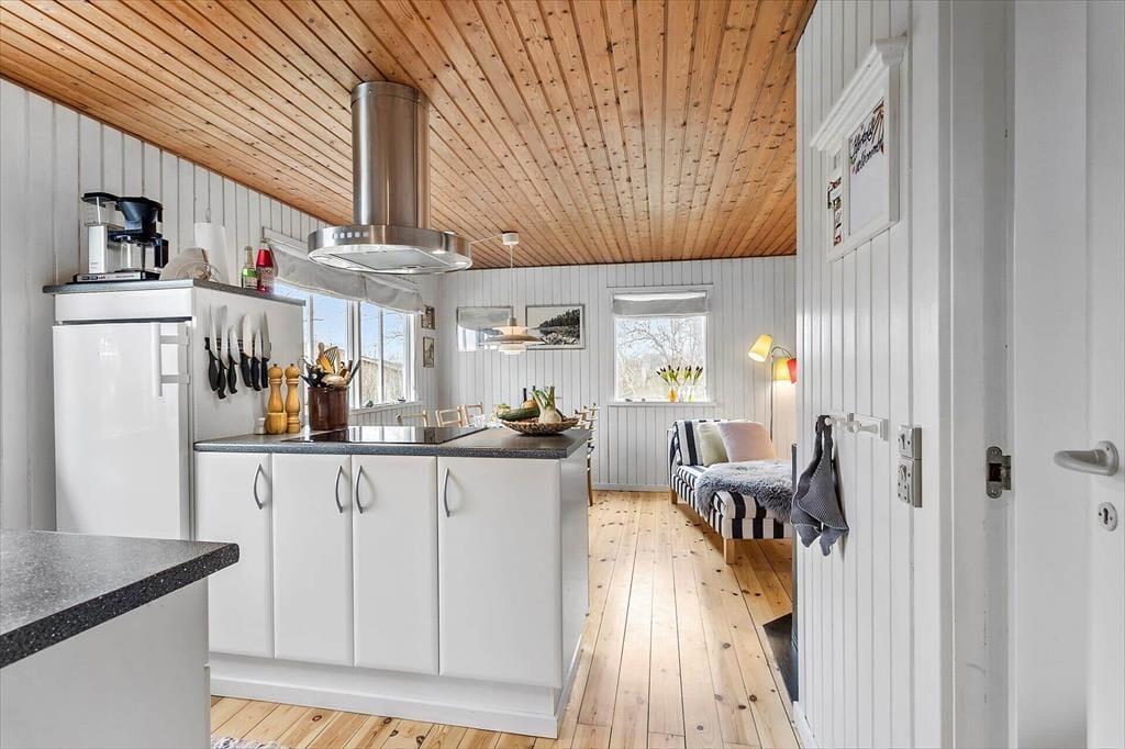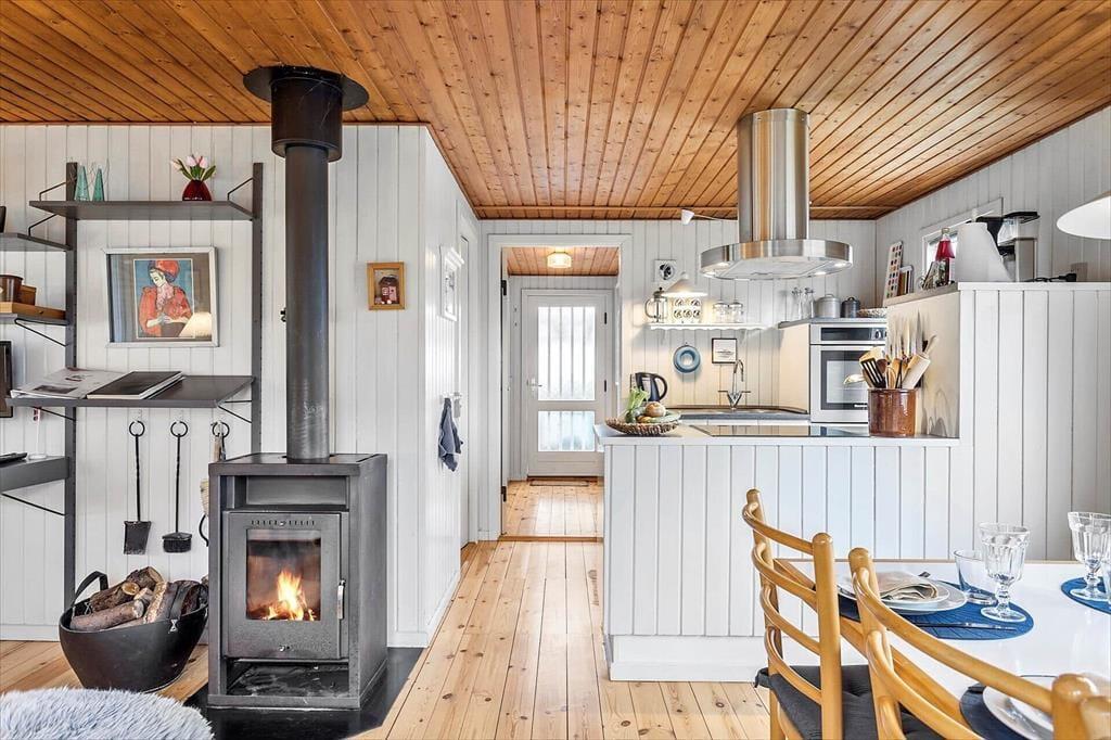 Når du træder ind i dette indbydende sommerhus, bliver du mødt af et lyst og venligt interiør. Hele huset er holdt i hvide farvetoner, hvilket skaber en let og luftig atmosfære. Det åbne køkken og stueområdet er husets hjerte, hvor du kan nyde hyggelige måltider ved spisepladsen eller slappe af foran brændeovnen, som hurtigt kan varme på kølige aftener. Køkkenet er veludstyret og moderne, så du kan lave lækre måltider til familien uden besvær. De store vinduer lader dagslyset strømme ind og giver en skøn udsigt til den omkringliggende natur.