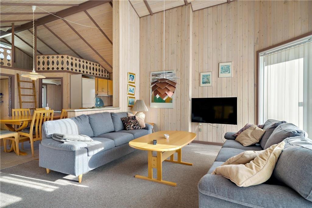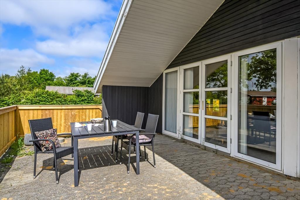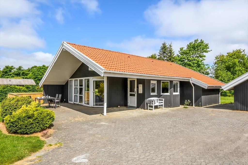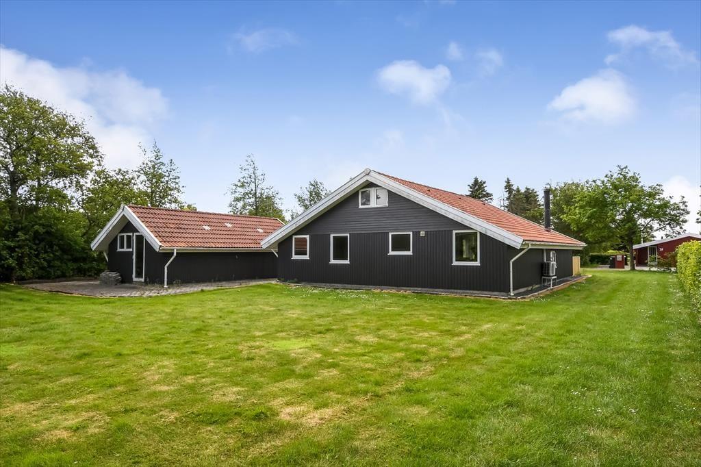 Ferielivet kommer til at udspille sig i lyse og fredelige rammer, når I vælger dette velindrettede træsommerhus, der ligger på en stor grund i bunden af Kosigvænget i Bork Havn.
