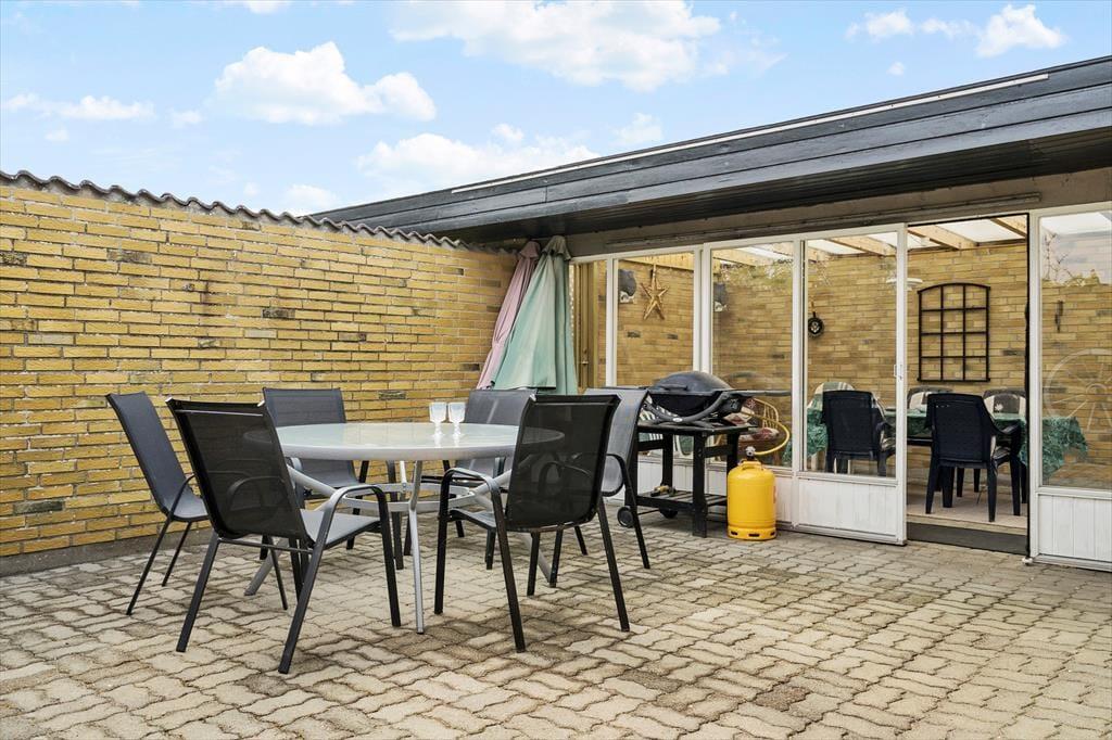 Også udenfor er der masser af muligheder for aktiviteter og hygge. Huset har en dejlig og lys udestue, der kan bruges uanset årstid, samt to terrasser med alt, hvad der skal bruges af havemøbler. I den store have er der også masser af plads til f.eks. boldspil eller andet leg, og her er også et gyngestativ og en lille hyggespot, perfekt til en god bog eller et godt glas vin. Når det bliver mørkt, kan I hygge jer ved den udendørs pejs.