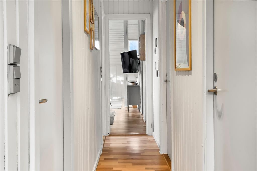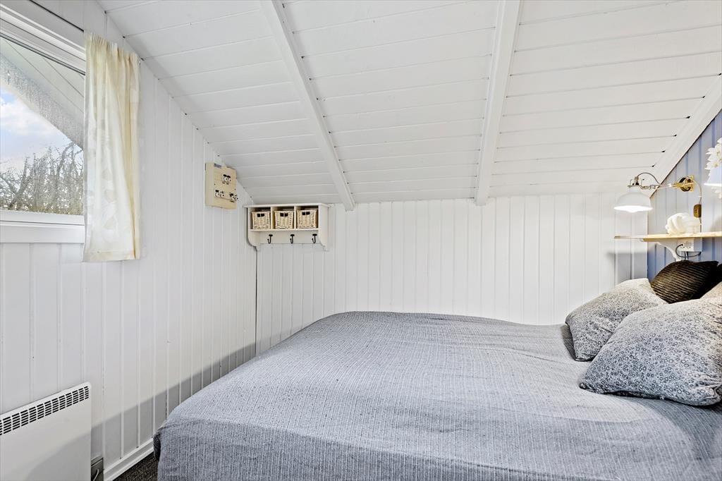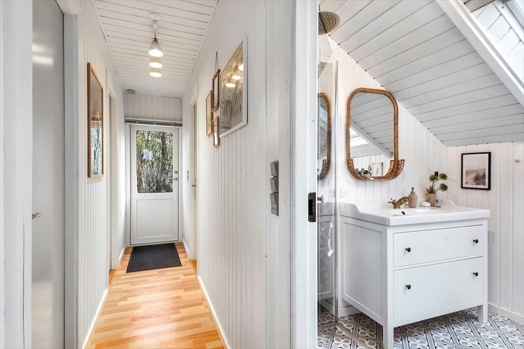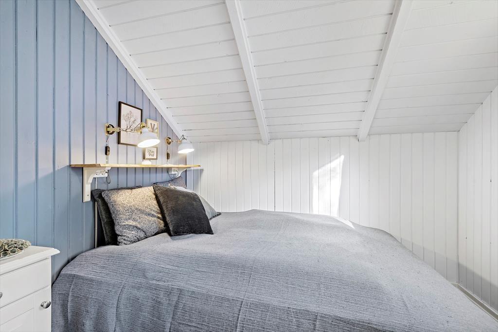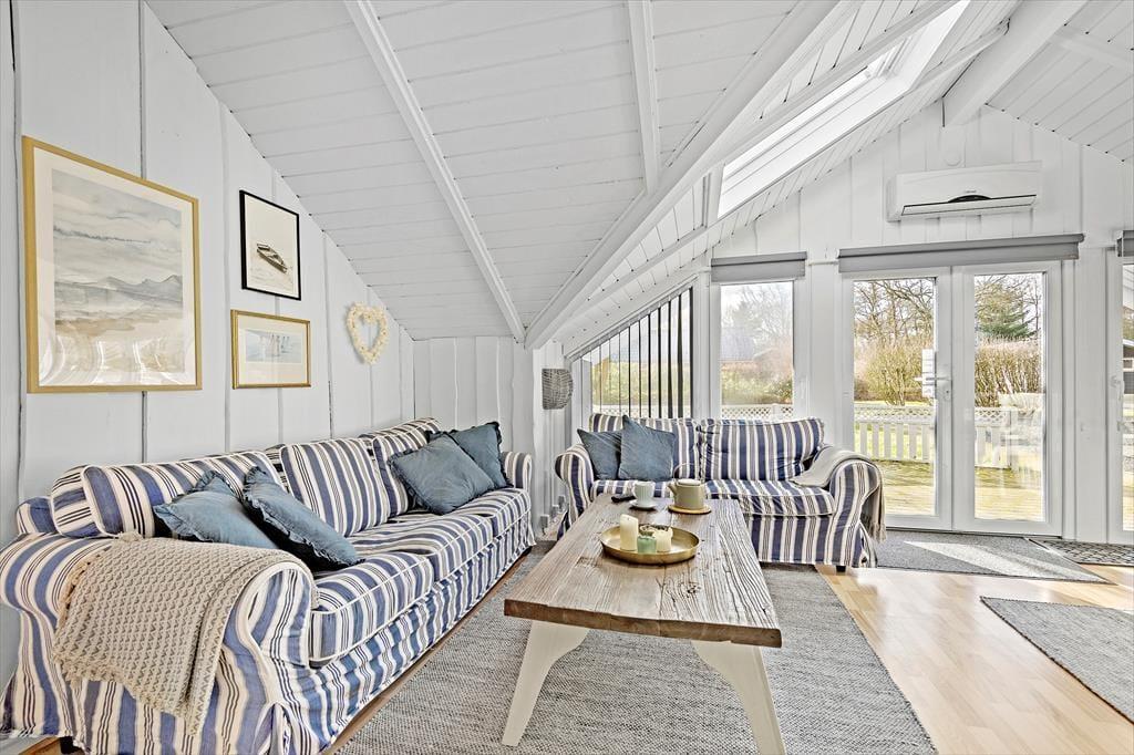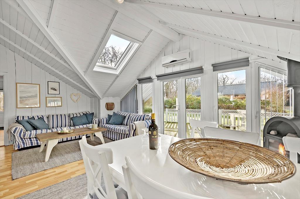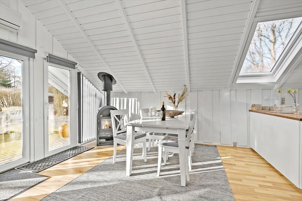 Inden døre i det nyrenoverede og opdaterede sommerhus er atmosfæren lys og venlig, så I kan hurtigt føle jer hjemme. I alle rum – også på badeværelset og på de tre soveværelser – er der på charmerende vis loft til kip, og stuens brændeovn hører også med til de klassiske sommerhustræk, der bidrager til hyggestemningen. Udover brændeovnen er stuen indrettet med en god sofaafdeling, spisebord og Smart TV, og takket være den åbne forbindelse til køkkenafdelingen er det nemt at være flere om madlavningen, når det er ved at være aftensmadstid.