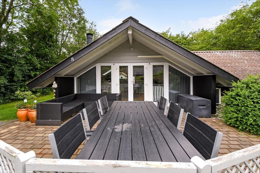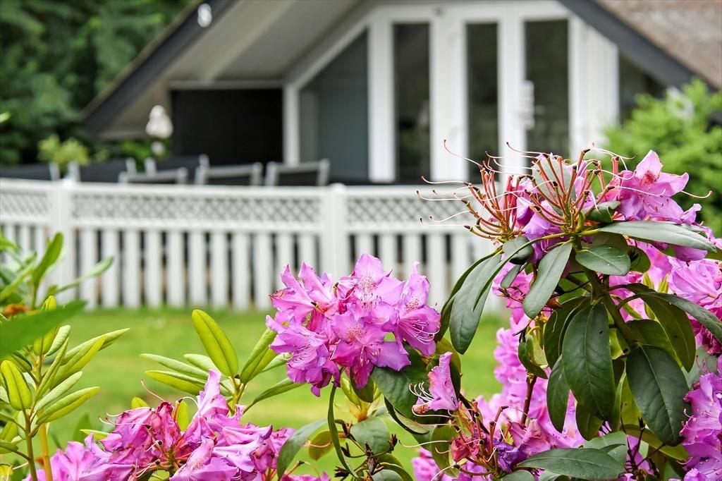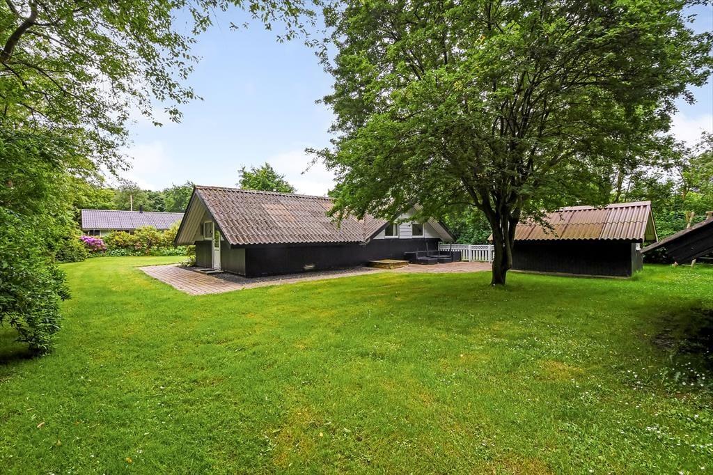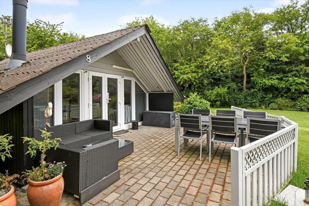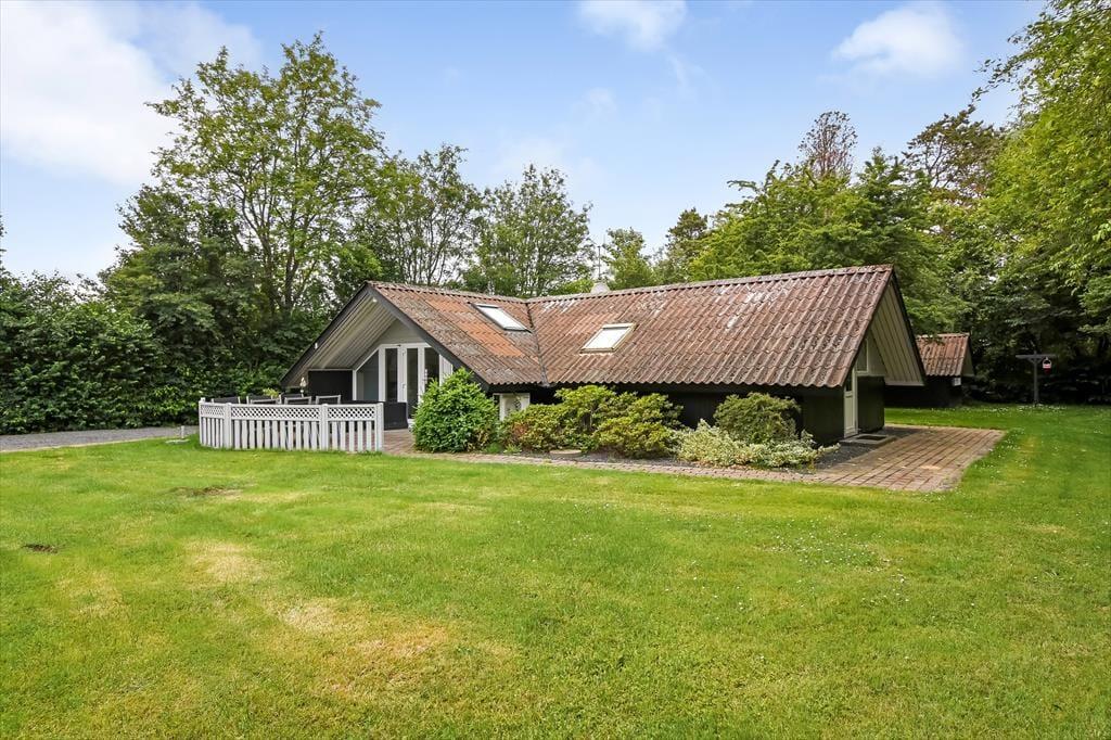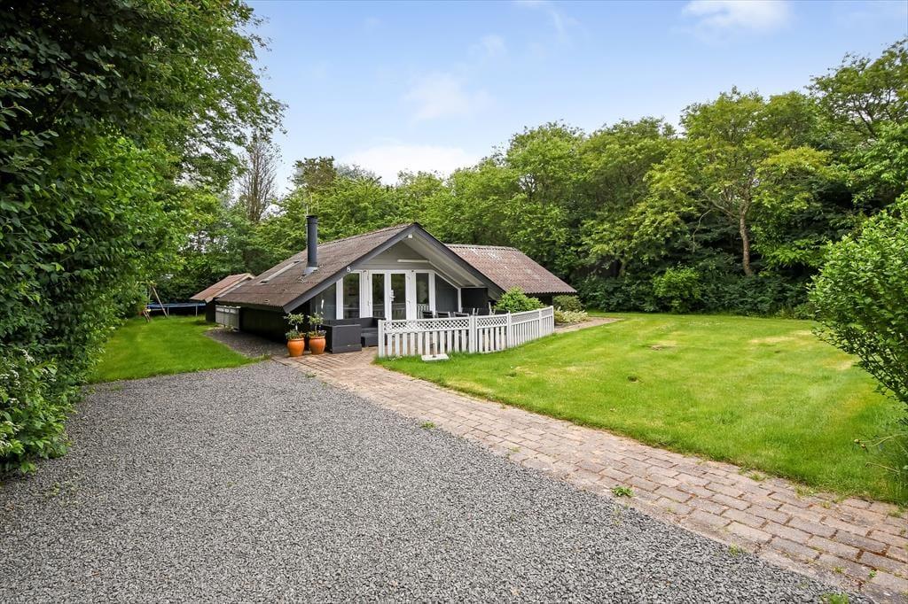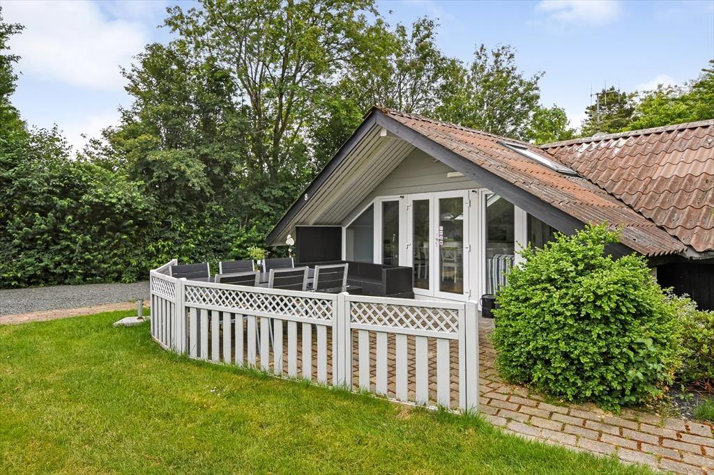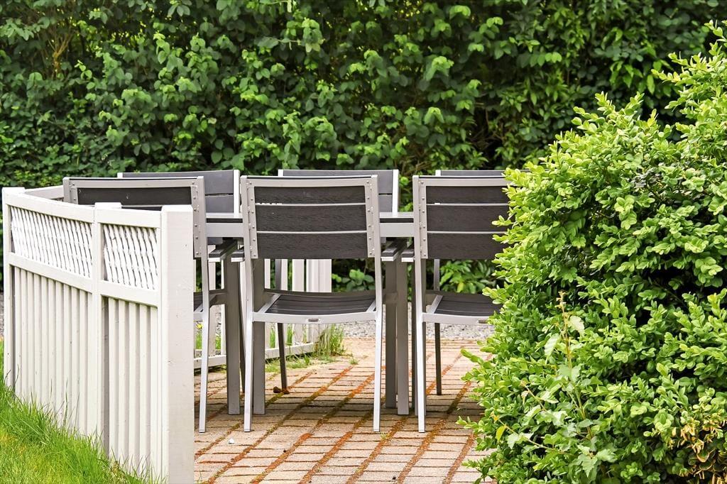 Fra stuen kan I træde direkte ud på en dejlig, delvist overdækket fliseterrasse, der er orienteret mod sydvest. Trænger I til skygge, kan I finde parasollen frem, inden I sætter jer godt til rette i havemøblerne eller tager en middagslur i liggestolene. Bagerst i haven, der afskærmes af frodig randbeplantning, finder I et godt legehjørne med trampolin og gyngestativ, så der er også tænkt på underholdning til de yngste feriegæster.