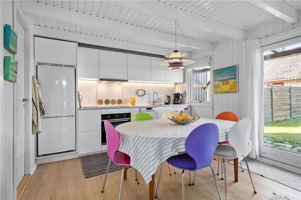 Fjordudsigten kan I også nyde inden døre, for førstesalens stue er nemlig udstyret med et stort, vestvendt vinduesparti. En brændeovn er med til at skrue op for hyggestemningen i stuen. I stueplan er der kommet moderne forbedringer til, for køkken-alrummets køkkenelementer og hvidevarer er nye, og der er også lagt nyt gulv i stueetagen og på første sal. Et badeværelse og tre små soveværelser med i alt seks sengepladser - to dobbeltsenge og en køjeseng -hører for øvrigt med til stueetagens praktiske planløsning.