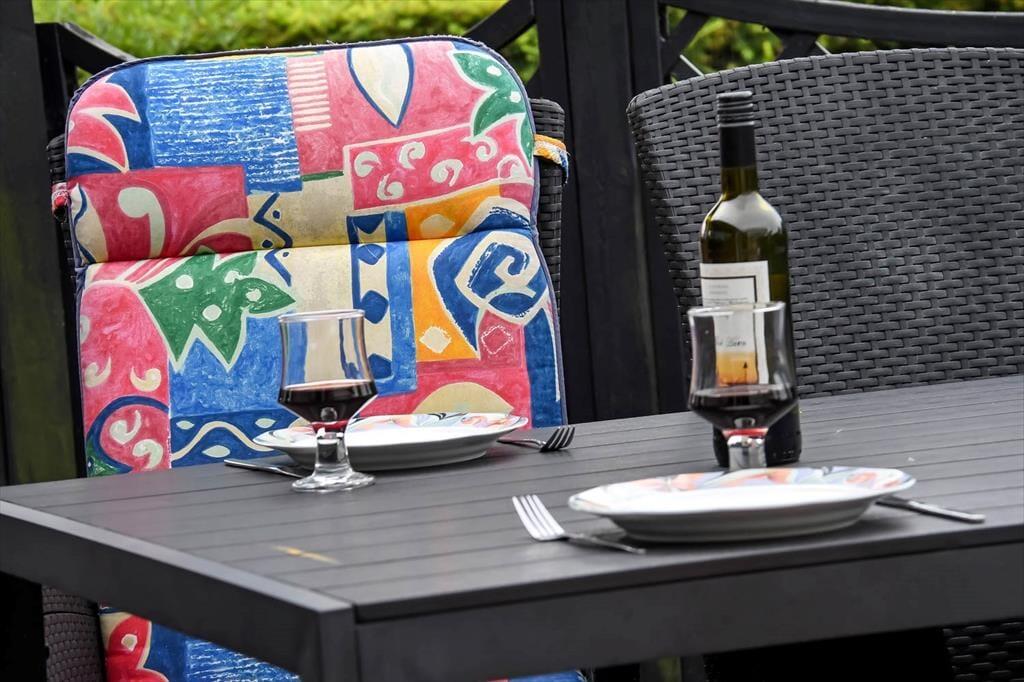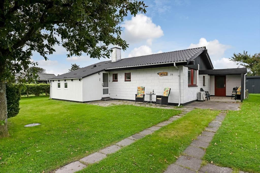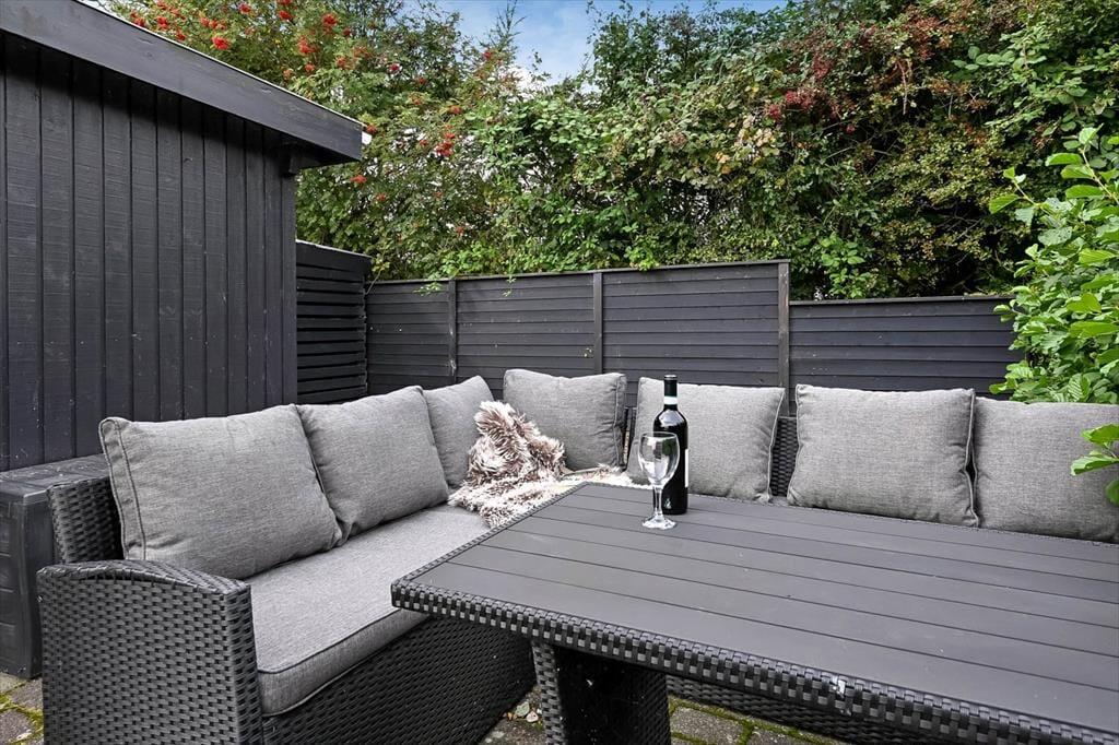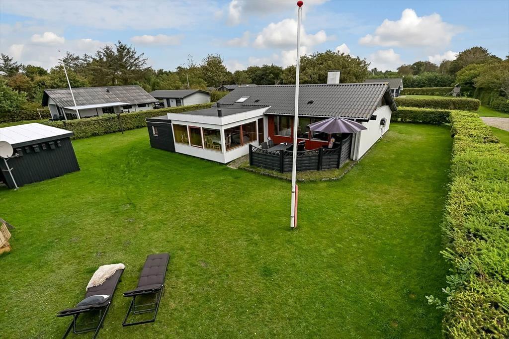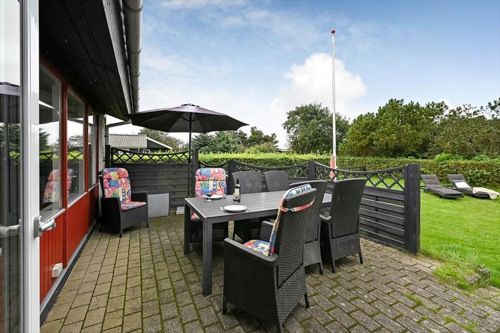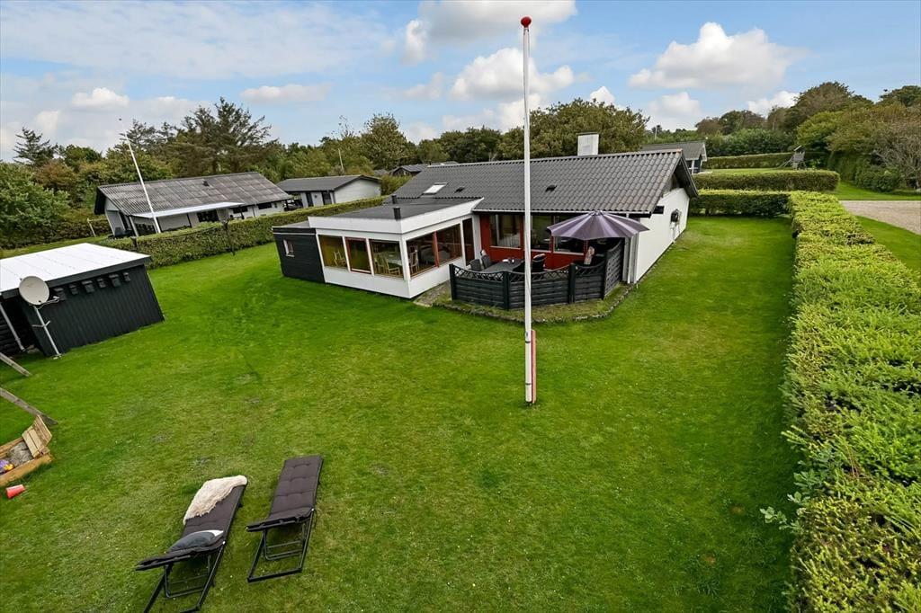 På den 800 m² store grund er der flere terrasser og hyggelige solkroge at vælge imellem, når I trænger til en tilbagelænet stund i en havestol. Den største terrasse vender mod sydvest og skærmes af læhegn, men I kan for eksempel også finde en dejlig solplet på græsplænen i læ af udhuset og den grønne randbeplantning. Har I cykler med, kan de nemt parkeres i carporten, og hvis I har små børn med på ferie, kan de få glæde af sandkassen. Desuden findes der hegn, som man kan indhegne noget af grunden med.