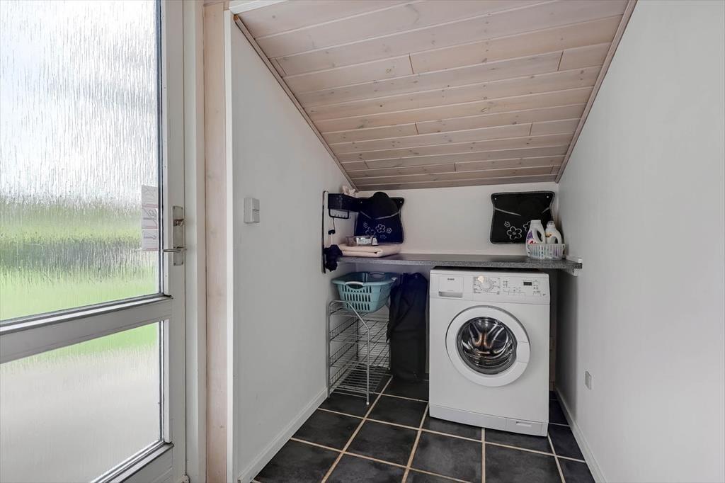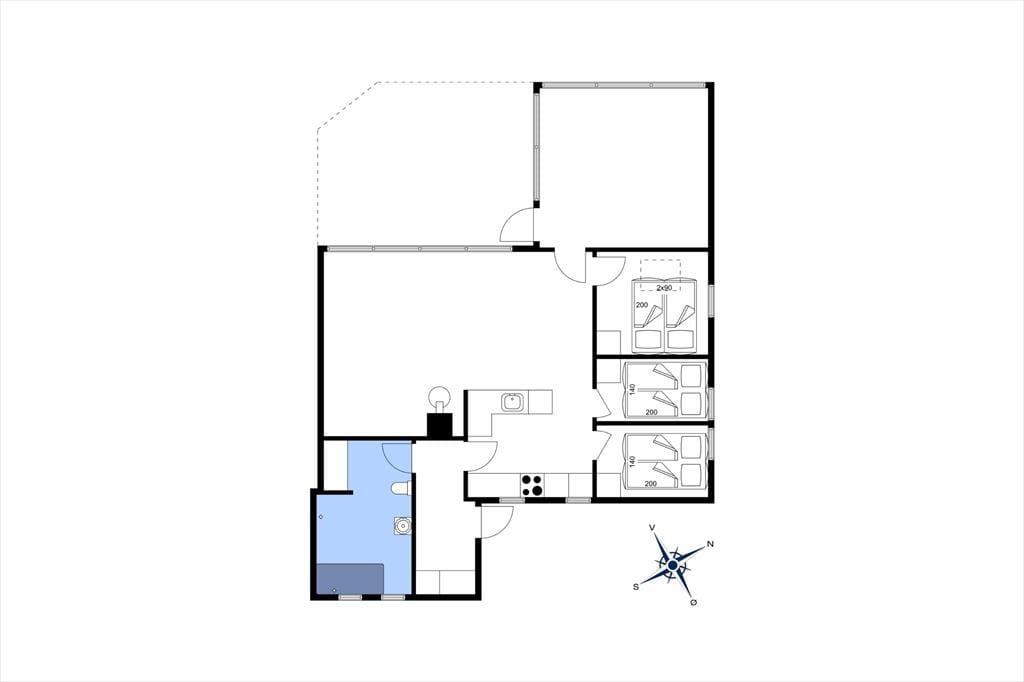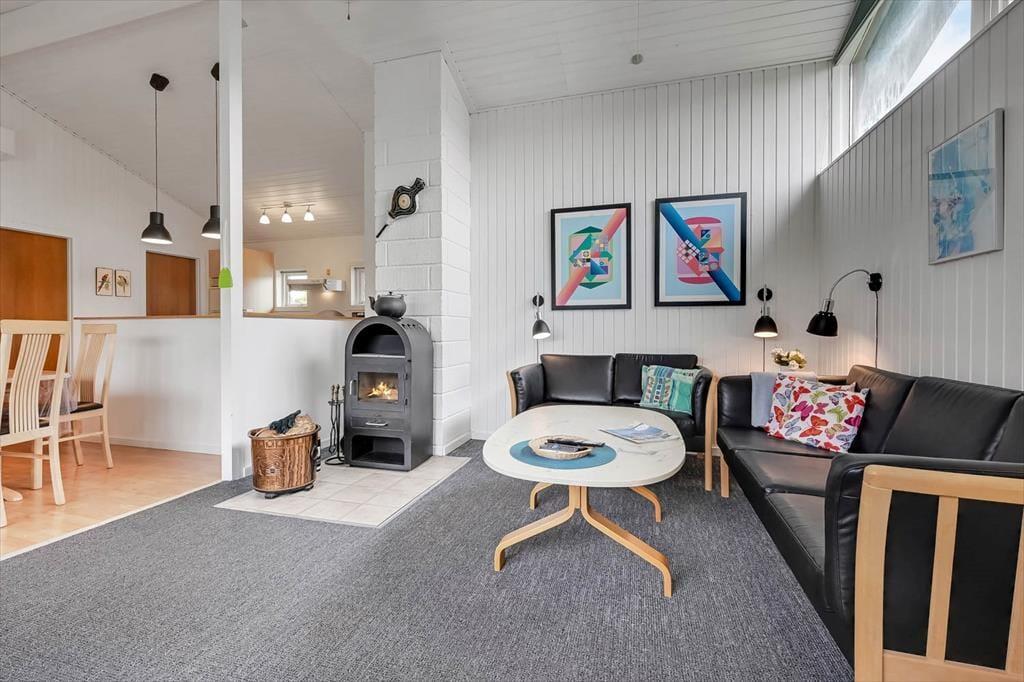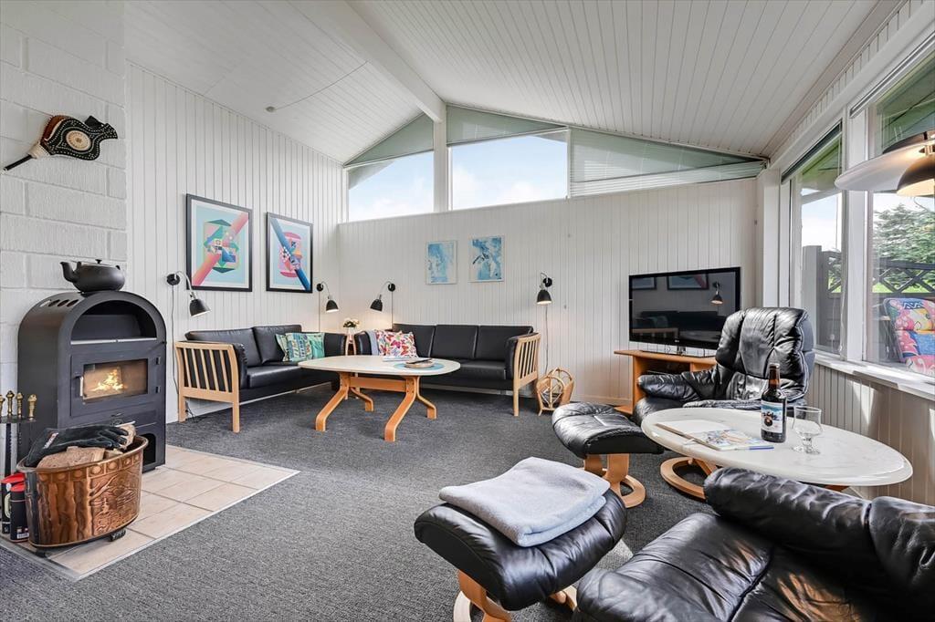 Et spabad, en brændeovn og en udestue hører alt sammen med til de gode detaljer, der forsøder ferielivet i huset. Spabadet er ikke overraskende placeret på badeværelset, mens brændeovnen er del af interiøret i det store opholdsrum, hvor køkkenet og stuen er forenet. Udestuen ligger i forlængelse af opholdsrummet, så det er nemt at flytte eftermiddagskaffen eller aftensmaden herud, hvis I får lyst til at sidde her og nyde solskinsvejret og udsigten til den grønne have. En entré med vaskemaskine og tre soveværelser med i alt seks sengepladser hører endelig også med til planløsningen.