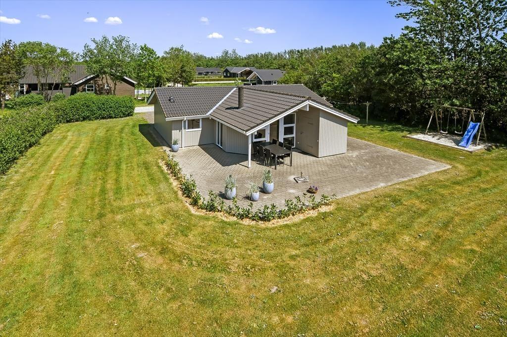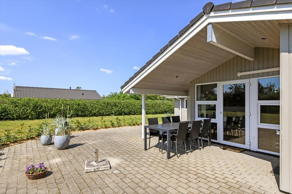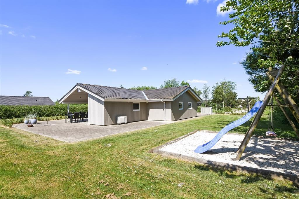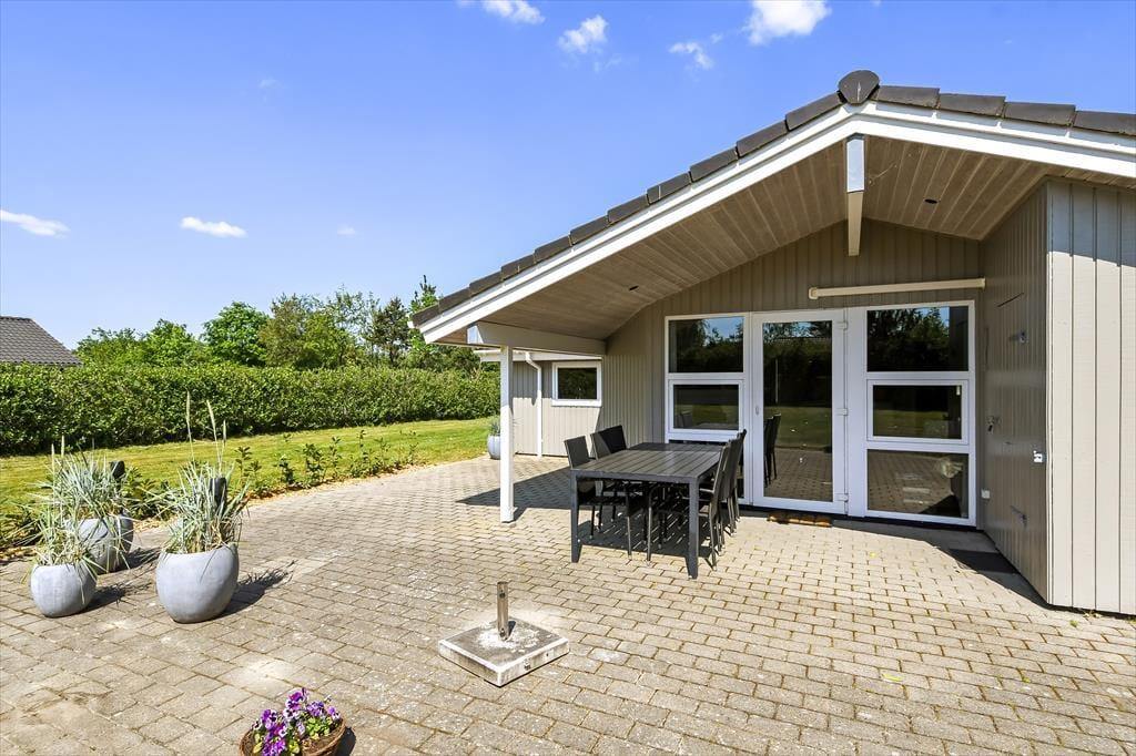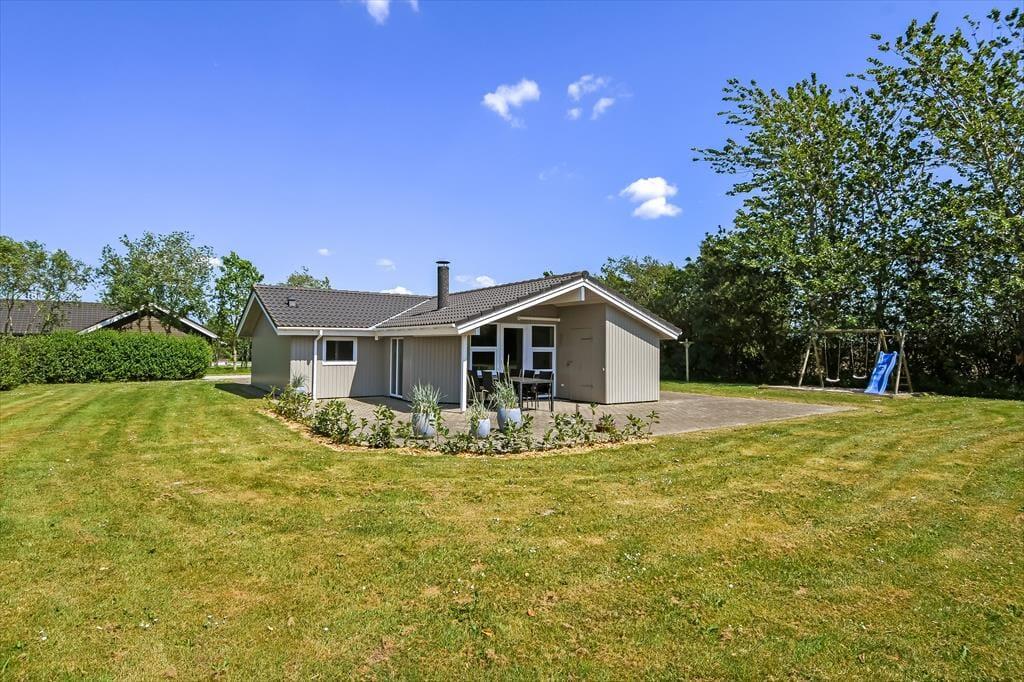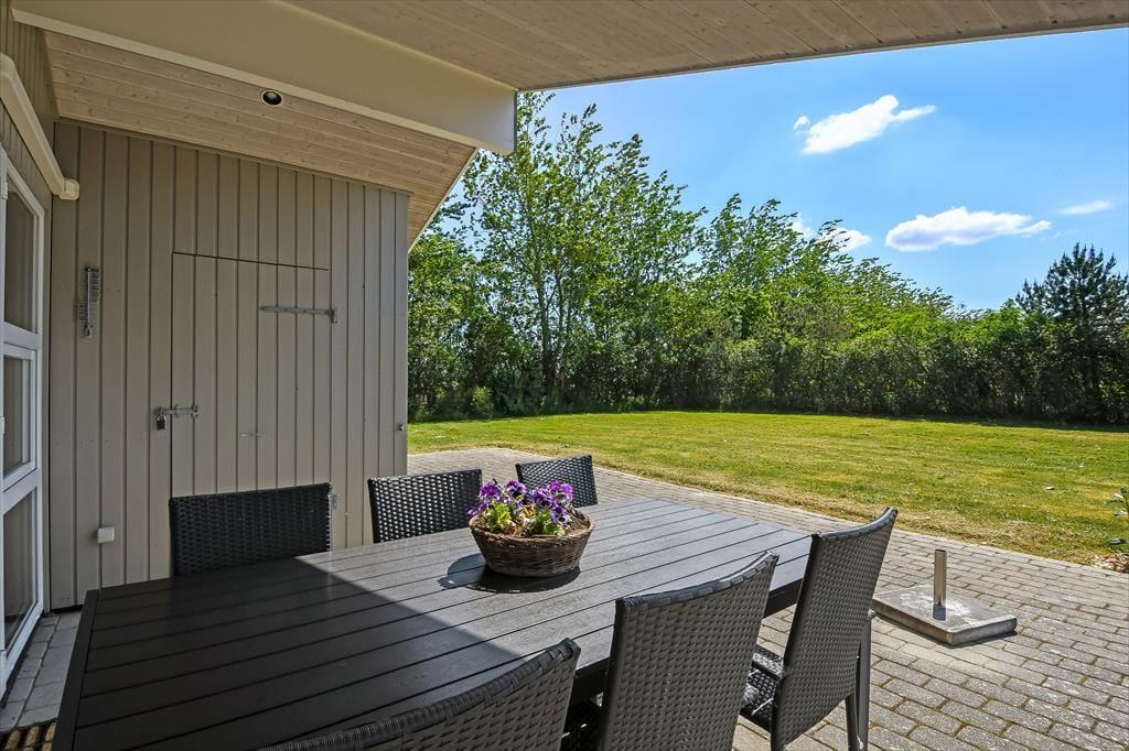 Rundt om sommerhuset breder en stor terrasse sig mod tre verdenshjørner. En del af terrassen er overdækket, og et læhegn sørger for afskærmning, så det er nemt at finde en solrig krog med læ. På grusarealet foran sommerhuset er der god plads til parkering, mens græsplænen indbyder til leg og boldspil – og så er der ovenikøbet sandkasse og legestativ til de alleryngste feriegæster.