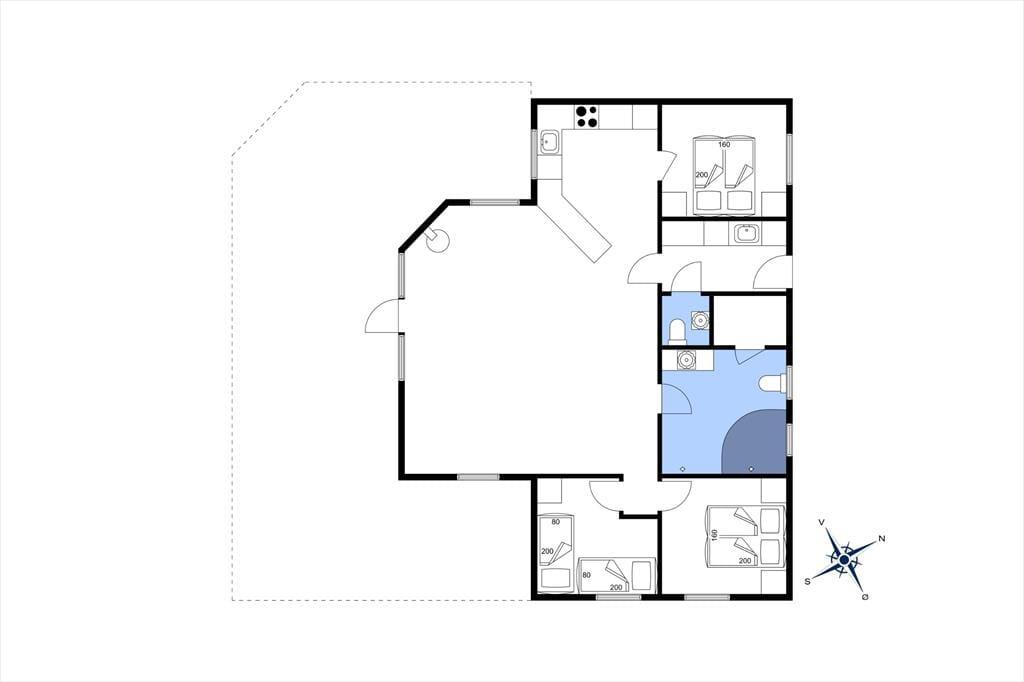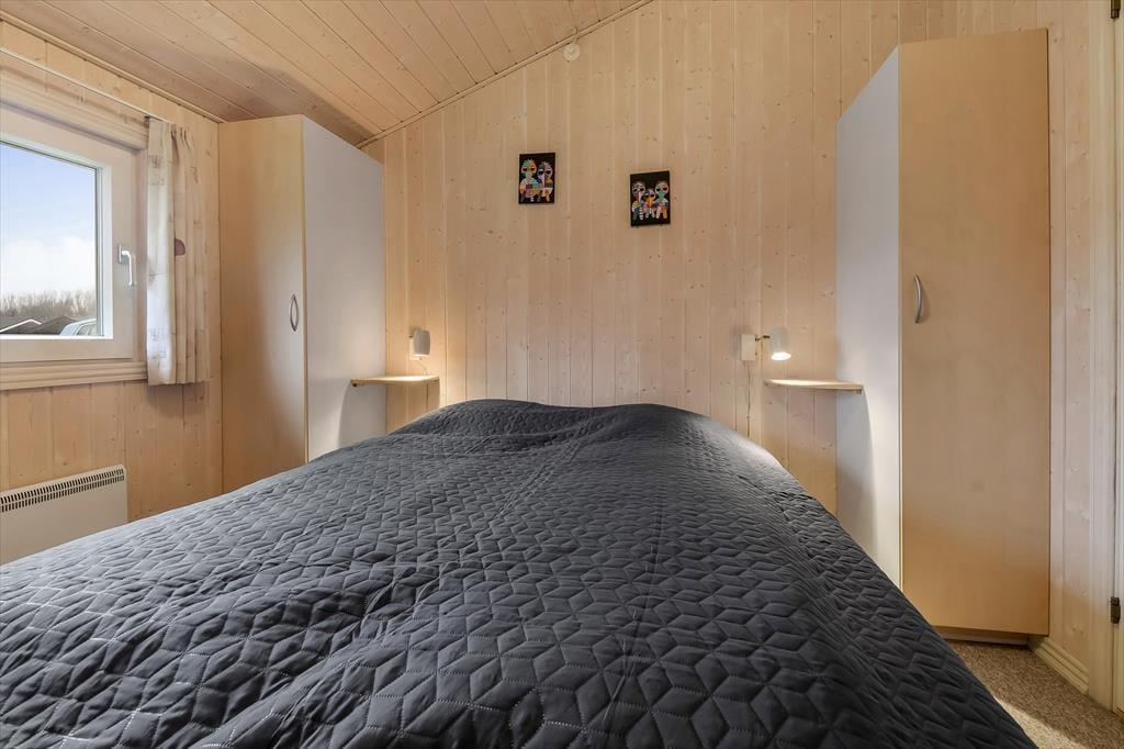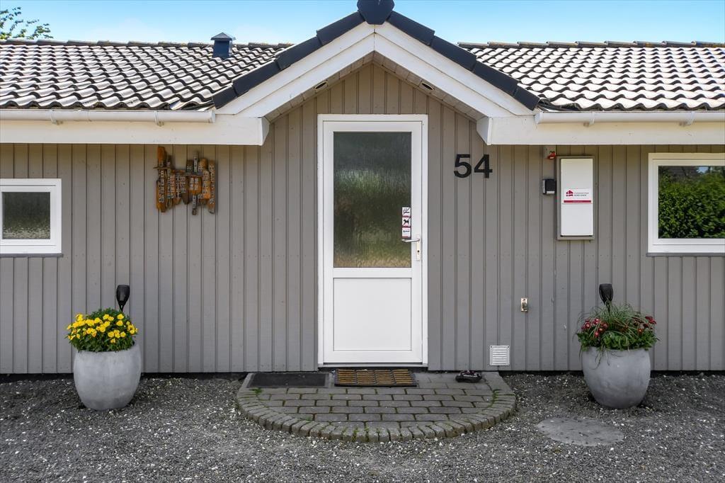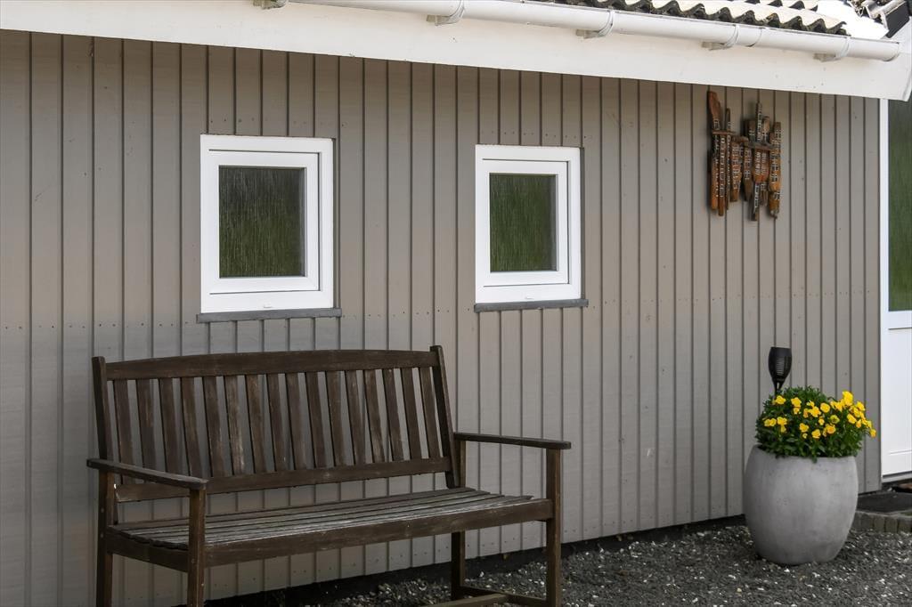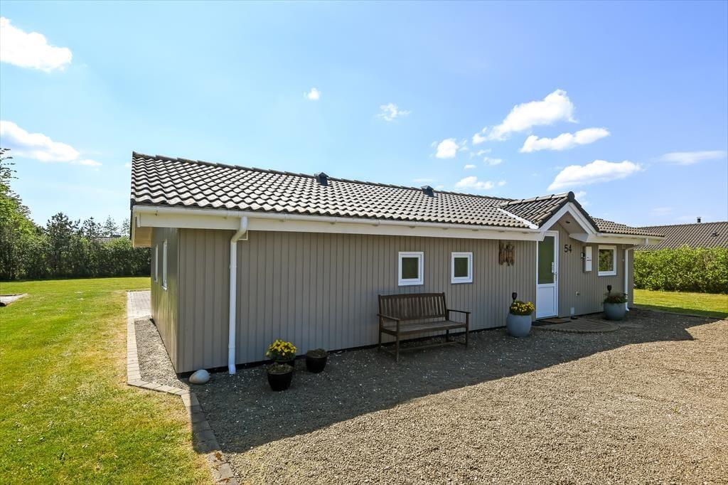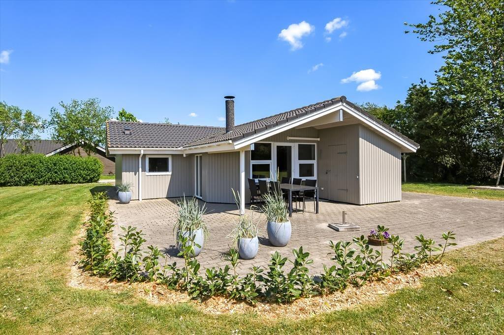 Rundt om sommerhuset breder en stor terrasse sig mod tre verdenshjørner. En del af terrassen er overdækket, og et læhegn sørger for afskærmning, så det er nemt at finde en solrig krog med læ. På grusarealet foran sommerhuset er der god plads til parkering, mens græsplænen indbyder til leg og boldspil – og så er der ovenikøbet sandkasse og legestativ til de alleryngste feriegæster.