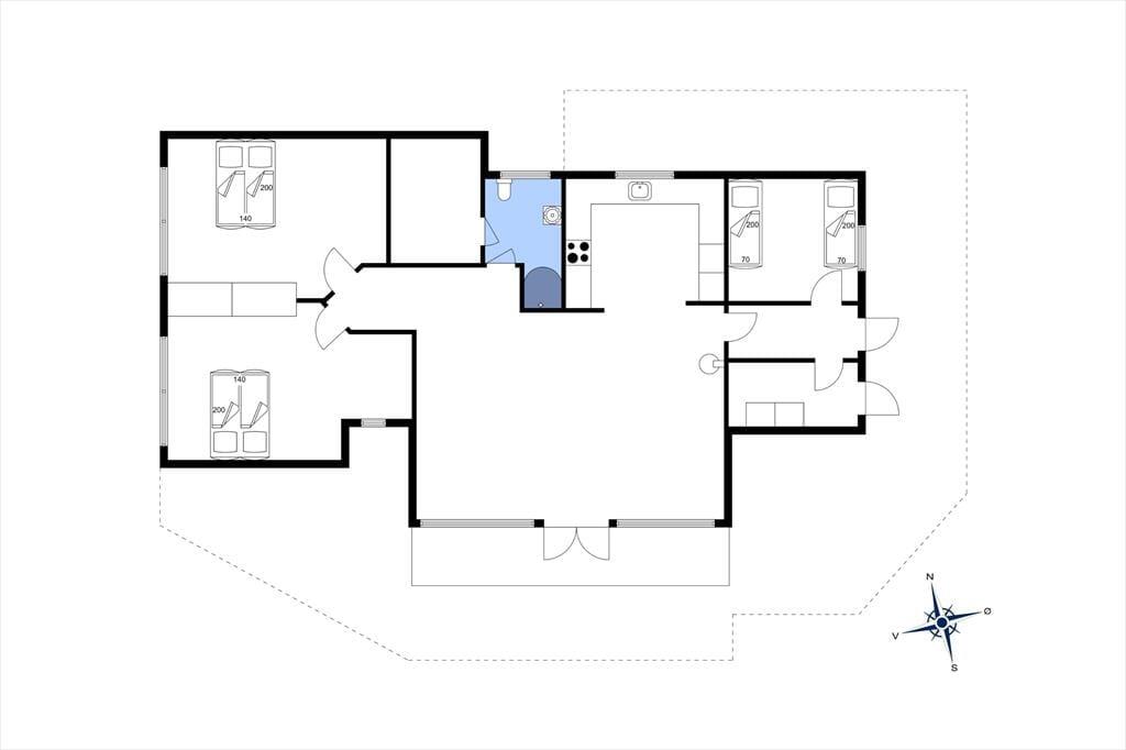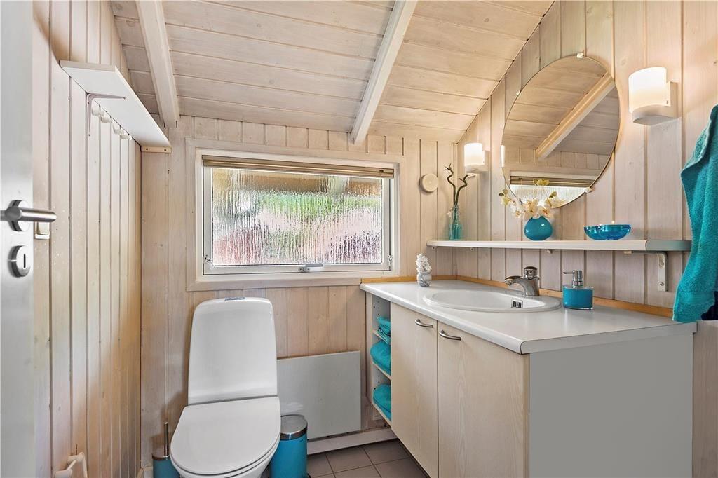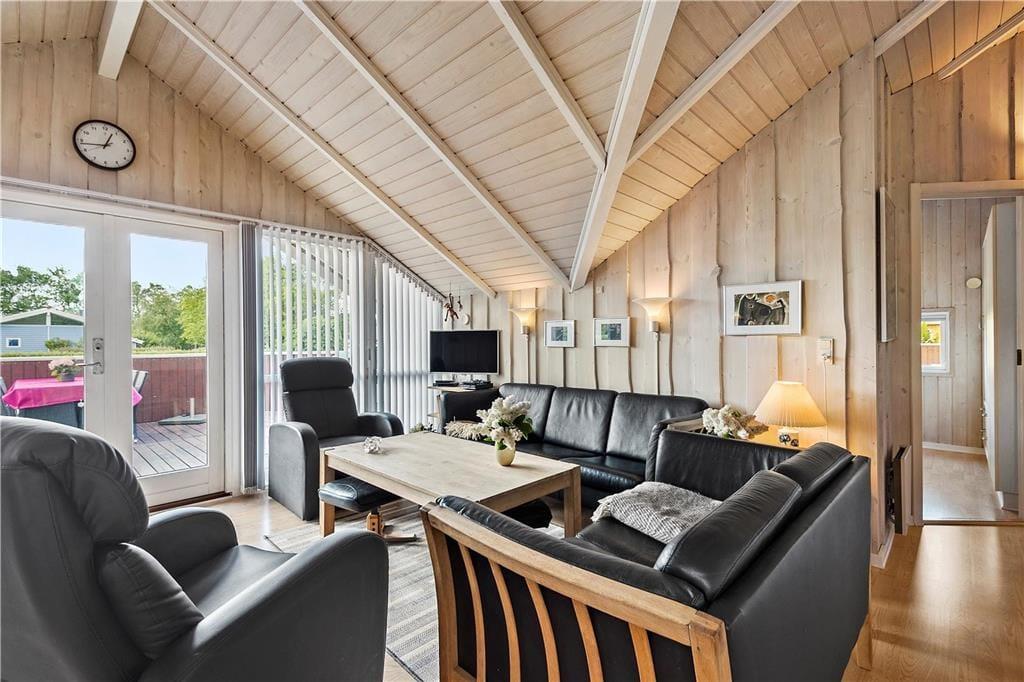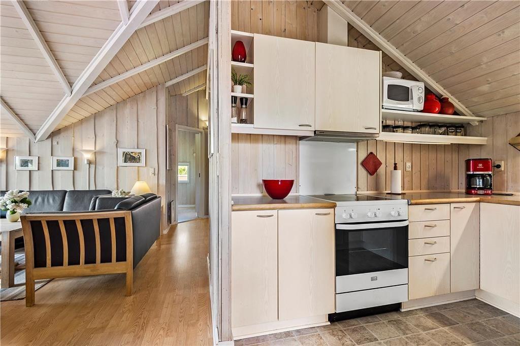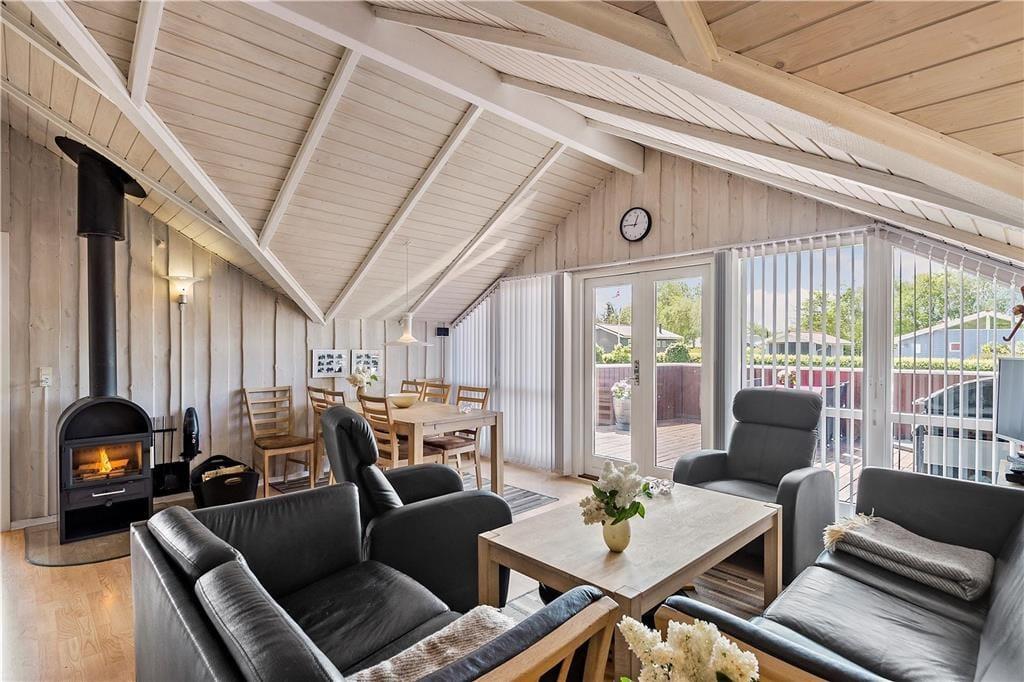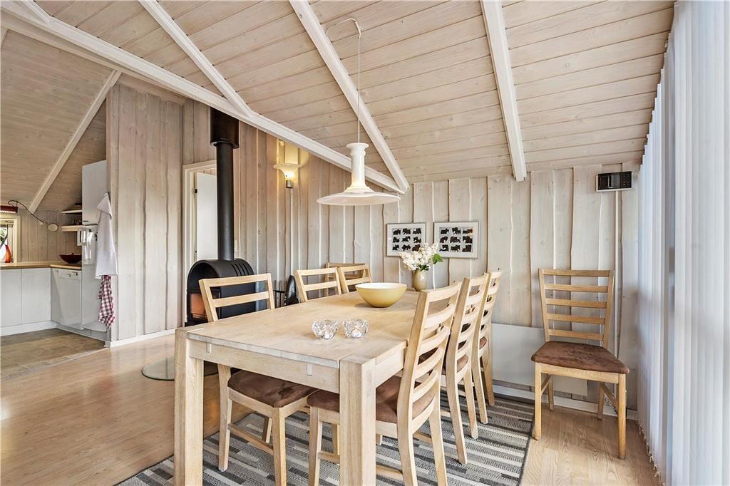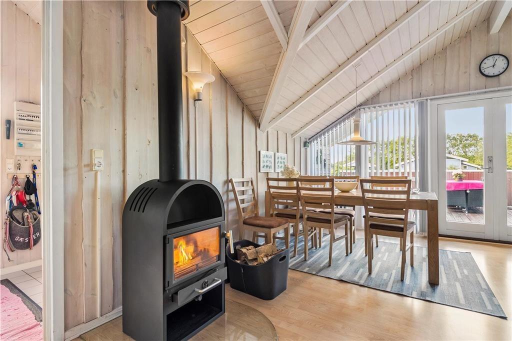 Foruden den gode adresse er sommerhusets mange kvaliteter med til at forsøde ferielivet. Det er nemlig en både lys, hyggelig og funktionelt indrettet feriebolig, der fremstår pænt og velholdt takket være løbende vedligehold. De 76 m2 er fordelt på gennemtænkt vis, så de tre soveværelser er placeret i begge ender af sommerhuset. En entré med vaskemaskine og tørretumbler samt et badeværelse med gulvvarme og sauna hører også med til planløsningen, mens det centrale samlingspunkt er en dejlig stue med integreret køkkenafdeling. Her i opholdsrummet er der god plads til hygge og afslapning, og en effektiv brændeovn er endda med til at skrue op for den gode stemning på eventuelle kølige dage.