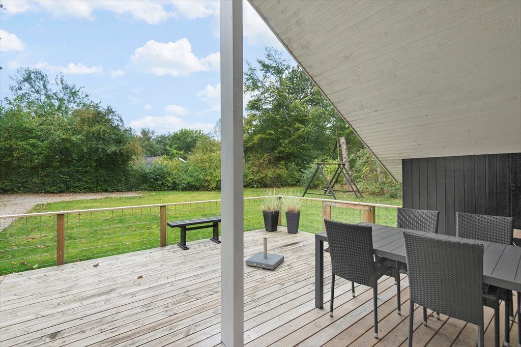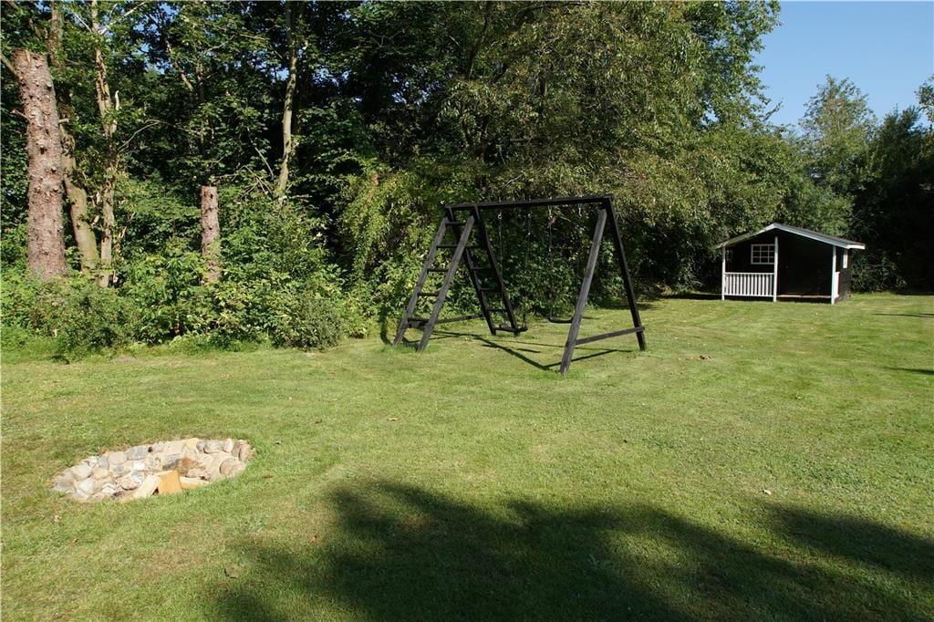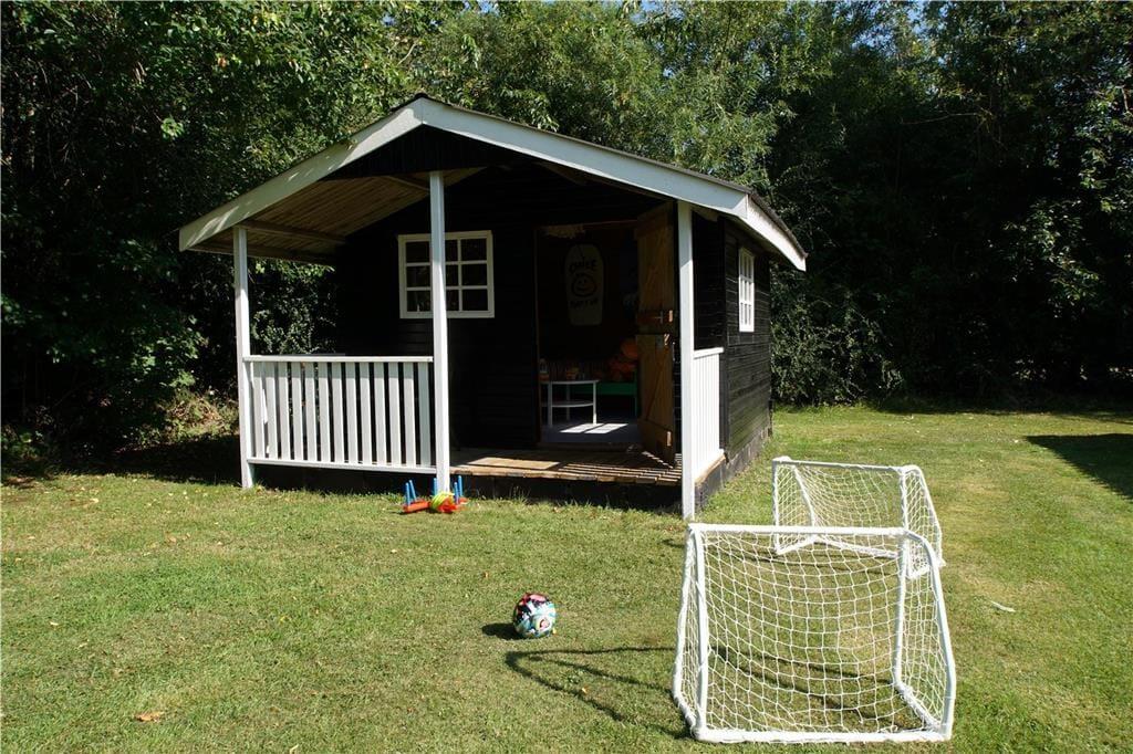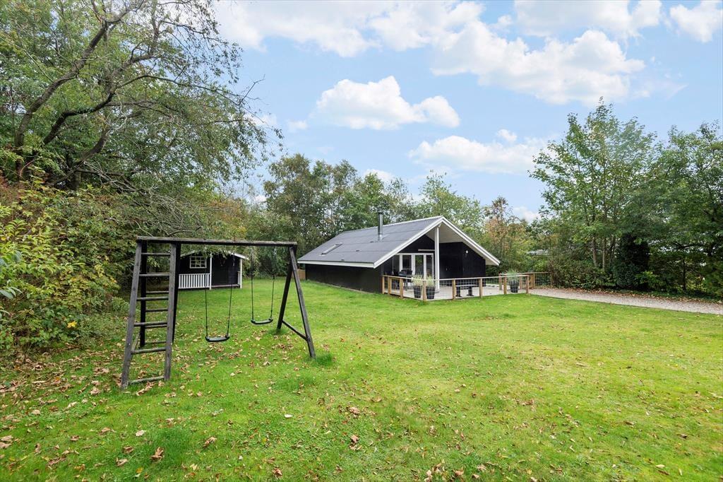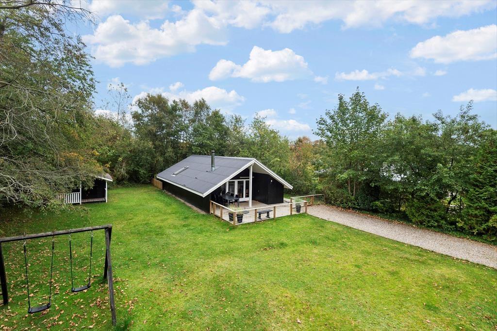 Ude på den store, ugenerede grund kan I slå jer ned på den delvist overdækkede, sydvendte træterrasse, når I vil nyde livet i en liggestol eller spise sommerfrokost i solen. Grillen kan I tænde op i forud for aftensmaden – med mindre menuen står på snobrød og anden bålmad, som I tilbereder ved bålstedet. De yngste familiemedlemmer kan gynge, boltre sig på græsplænen og hygge sig med saftevand på deres egen terrasse ved legehuset. Hundehegnet rundt omkring sommerhuset muliggør, at hunden nemt kan luftes.