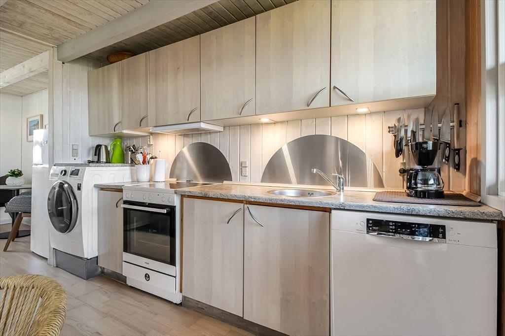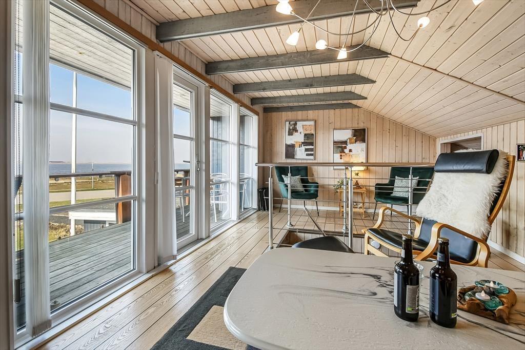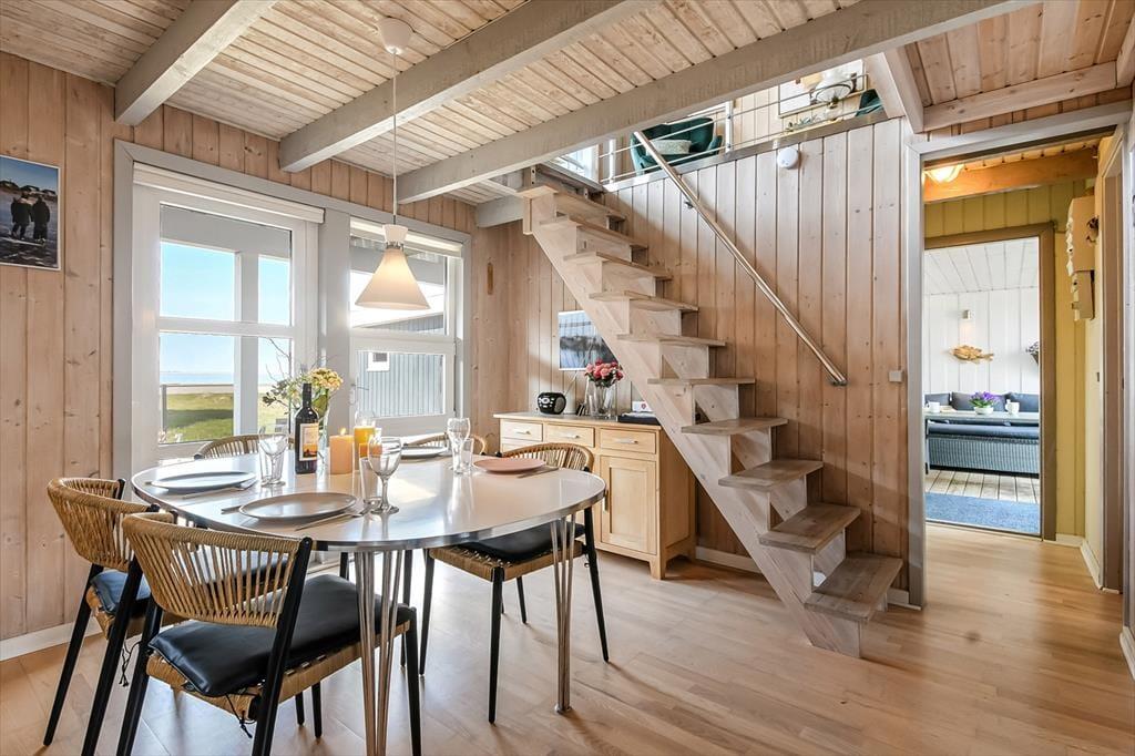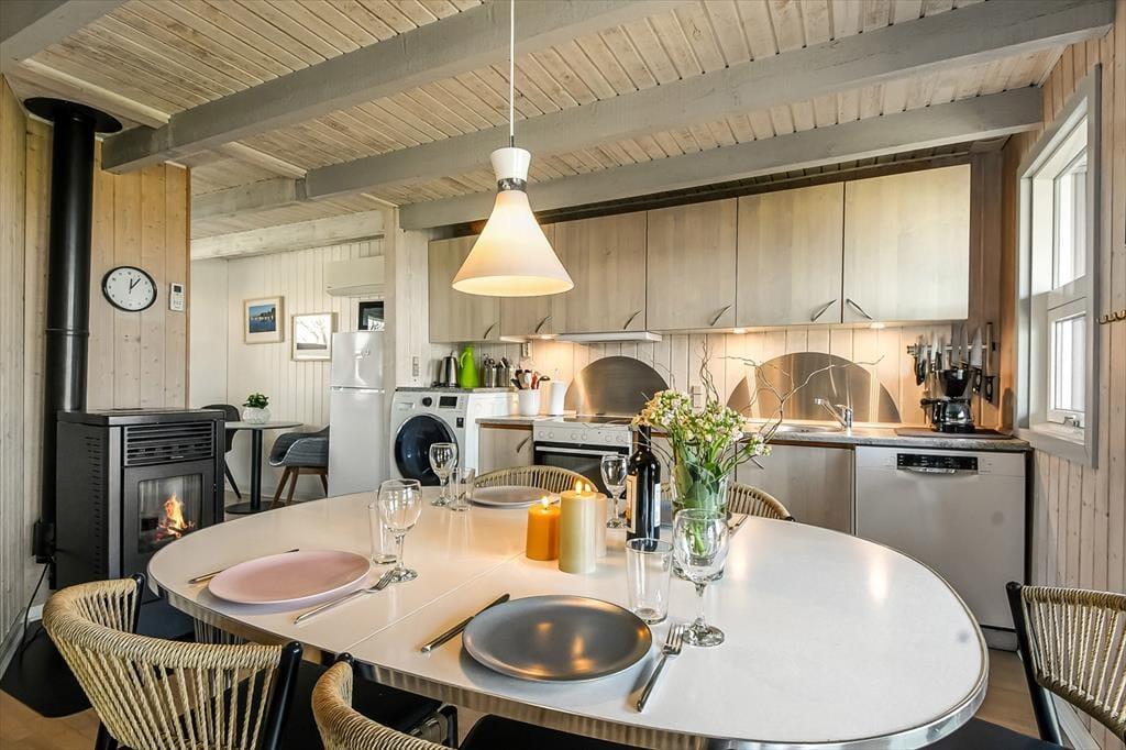 Efter en grundig renovering i 2010 fremstår sommerhuset lyst og indbydende. Kvadratmeterne er godt udnyttede, og der er tænkt over planløsningen, så stuen er placeret på førstesalen, hvor fjordudsigten er mest imponerende. Gennem det vestvendte vinduesparti kan I beundre det naturskønne vue og følge med i surfernes sejlads, mens I selv sidder og hygger jer i den komfortable sofaafdeling. Er I ved at være sultne, kan I gå nedenunder og begynde på aftensmaden i stueplanets køkken-alrum, der blandt andet er indrettet med et effektivt pillefyr. På etagen finder I desuden et badeværelse og tre soveværelser, hvoraf to er indrettet med dobbeltseng og det tredje med en dobbelt sovesofa på 120 cm. I alt er der plads til seks feriegæster i huset – og her skal det nævnes, at der også er mulighed for at rede op i førstesalens alkove, så der er flere fordelingsmuligheder, når det er sengetid.