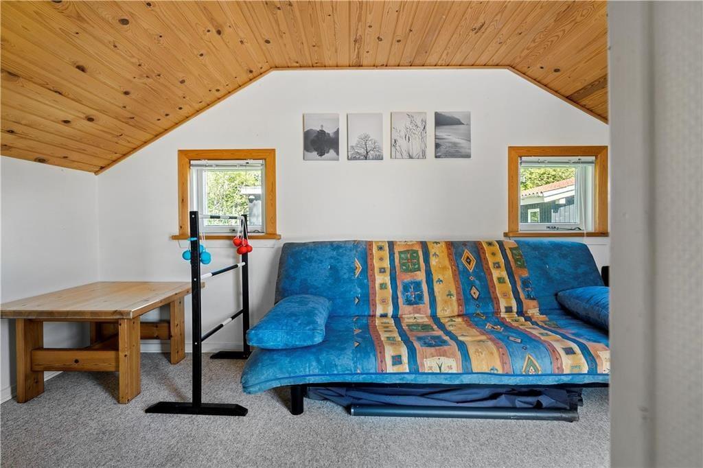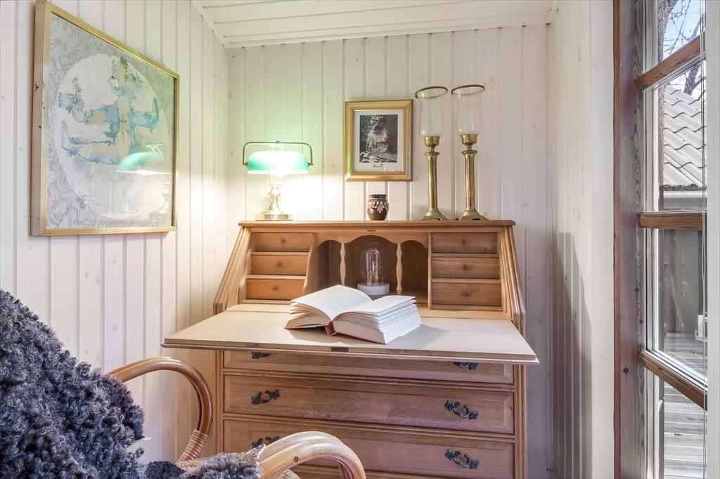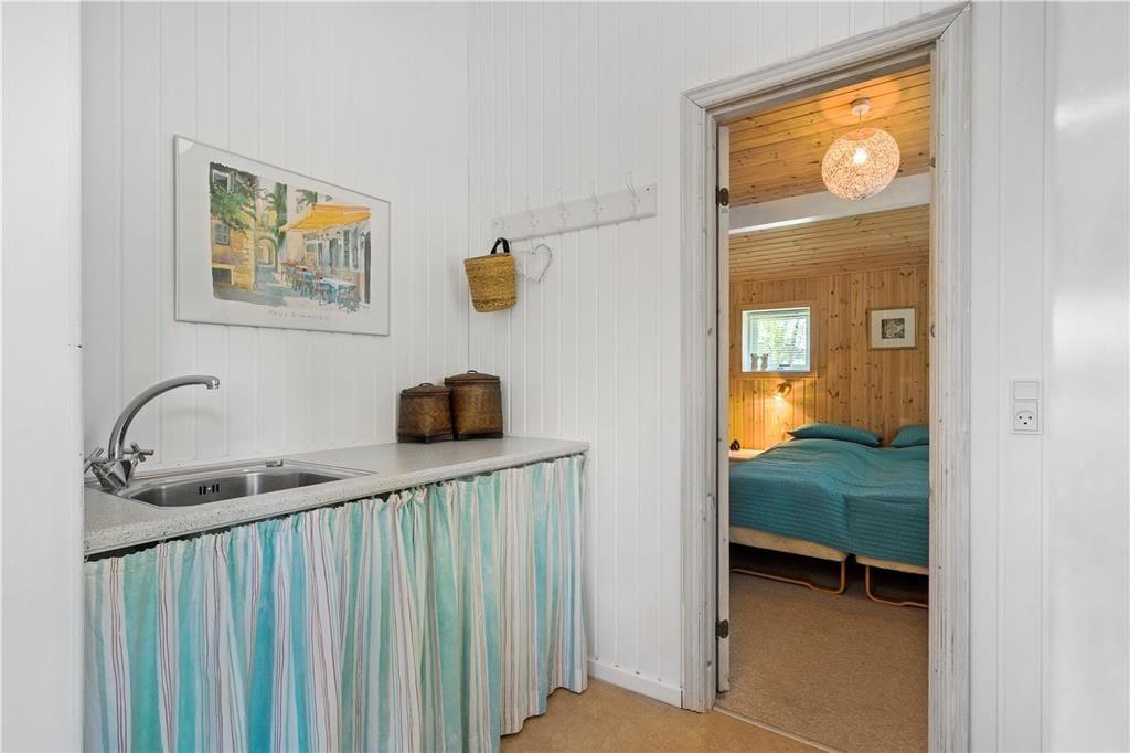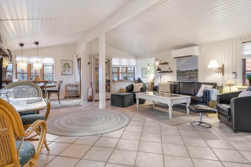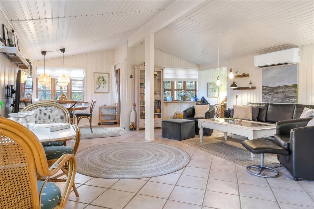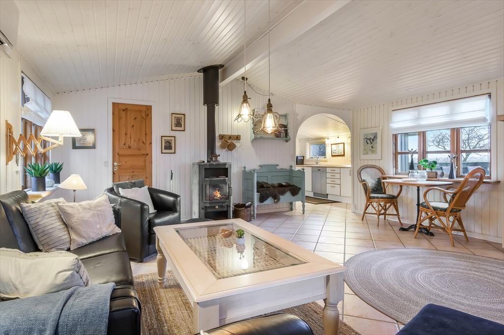 Udover at ligge smukt og fredeligt placeret på en lukket vej er der mange andre kvaliteter ved huset. Det er nemlig både rummeligt og stemningsfuldt, og det hyggeskabende møblement bidrager til den gode atmosfære. I den store stue er der gennemstrømmende lysindfald, brændeovn samt TV med både danske og tyske kanaler, og på velfungerende vis er der åben forbindelse til en veludstyret køkkenafdeling. Et pænt badeværelse og et bryggers med vaskemaskine er også del af planløsningen, og når det er ved at være sengetid, kan I se frem til en god nats søvn på de to soveværelser. Er der ikke sengepladser nok på værelserne, kan I rede op i annekset, som I kan gå tørskoet hen til via terrassen.