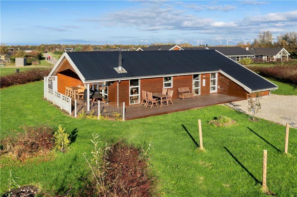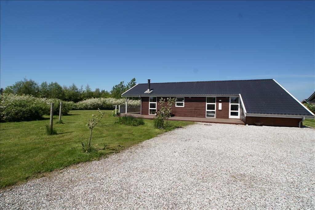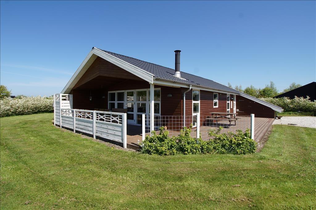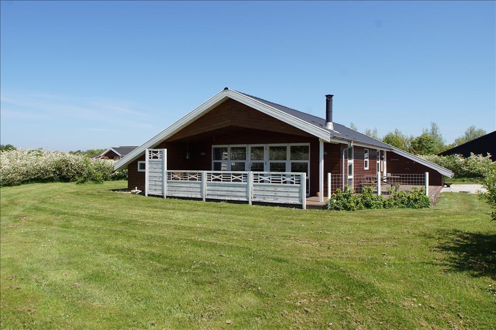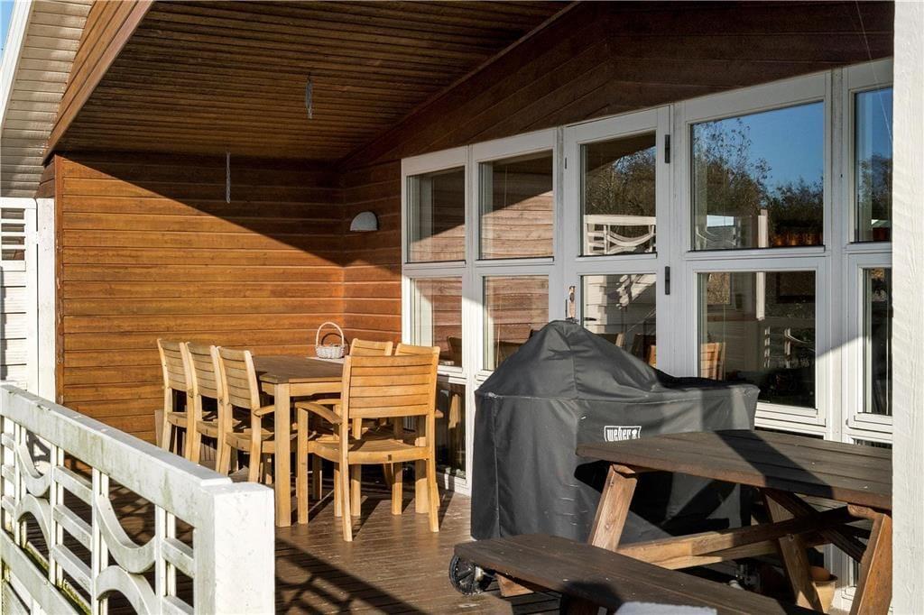 Ferieforholdene er tilsvarende glimrende ude i det fri på den 1300 m2 store grund. Her er der masser af plads til at løbe og lege på græsplænen – og hvis det alligevel ikke rækker, ligger sommerhuset stort set lige overfor en god legeplads med hoppepude, gynger og meget mere. Solbadning og grillmiddage kan foregå på den herlige, delvist overdækkede træterrasse, der breder sig på husets sydlige og vestlige sider.