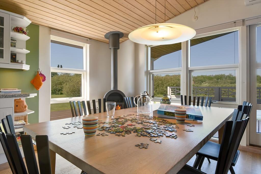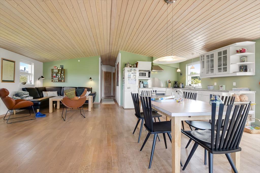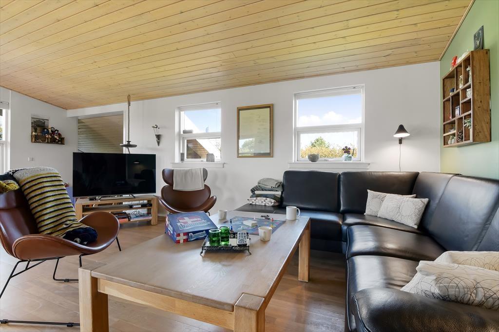 Dagslyset strømmer ind i sommerhusets flot indrettede rum – ikke mindst i den store opholdsafdeling, som er udstyret med panoramavinduer. Både her og i de øvrige rum, der inkluderer tre soveværelser, et badeværelse og et bryggers med vaskesøjle, er det tydeligt at se, at der er lagt vægt på at skabe en både hyggelig og funktionel feriebolig: På badeværelset og i bryggerset er der gulvvarme, og alle soveværelser er indrettet med komfortable dobbeltsenge, og der er for øvrigt både barneseng, høj stol og legetøj til de mindste feriegæster. En alkove i stuen kan bruges som en ekstra topersoners sengeplads ved nattetid, og i løbet af dagen fungerer den som en dejlig legekrog til børnene. Stuens komfortable møbler, TV og brændeovn lægger op til tilbagelænet afslapning og ren nydelse, og takket være den åbne forbindelse til det veludstyrede køkken kan madlavningen også nemt blive et fælles hyggeprojekt.