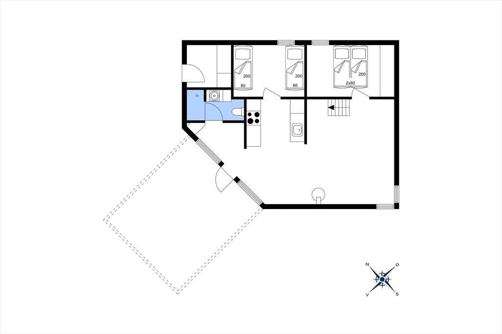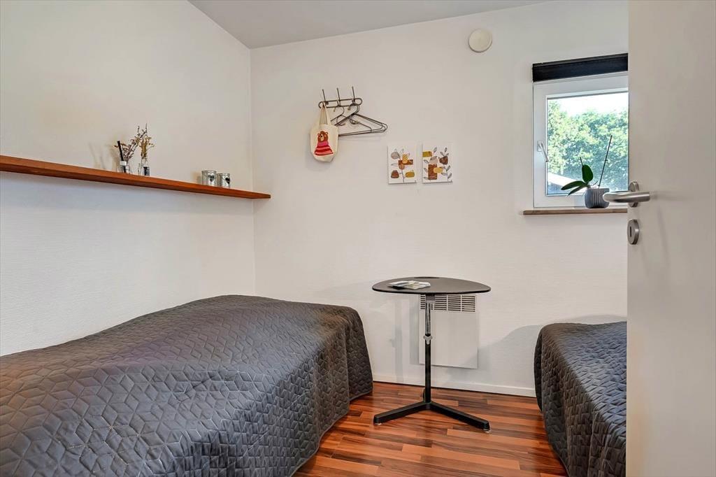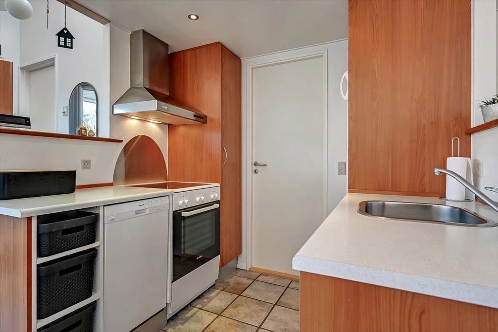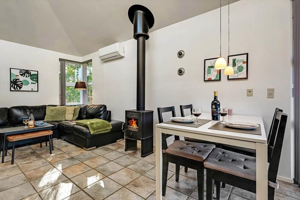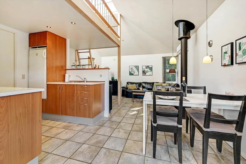Feriehuset fra 2003 fremstår stadig morderne, det takket være grundig pleje og ordentligt vedligehold. Stilfuld indretning præger alle rum – også badeværelset og de to soveværelser, der er indrettet med henholdsvis en dobbeltseng og to enkeltsenge. Det mest bemærkelsesværdige rum er dog stuen, for den byder på en original indretning med åben køkkenafdeling, hems og skrå lofter, der går op til et rytterlys helt i toppen. Takket være den åbne planløsning får I glæde af ovenlyset, når I sidder i stuen nær brændeovnen, og hvis I lægger jer i hemsens niche med madrasser om aftenen, har I fri udsigt til stjernehimlen. Blandt de mere praktiske detaljer har I desuden adgang til et lille bryggers med vaskemaskine samt ekstra fryser og køleskab.