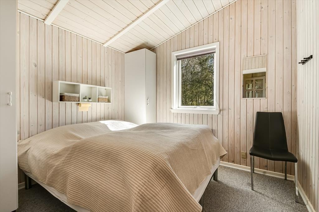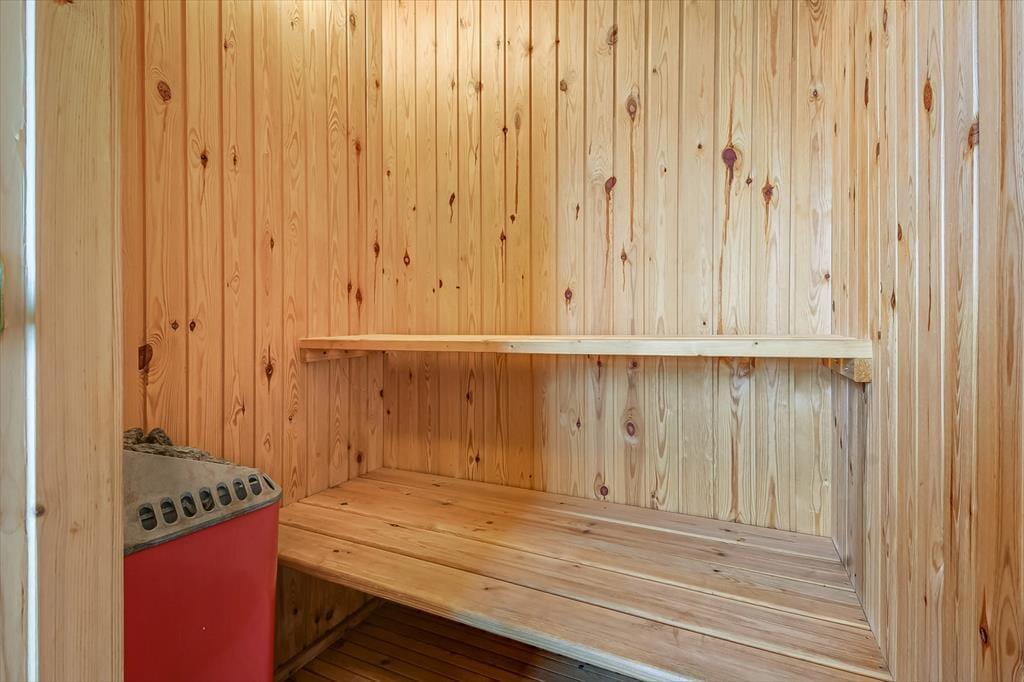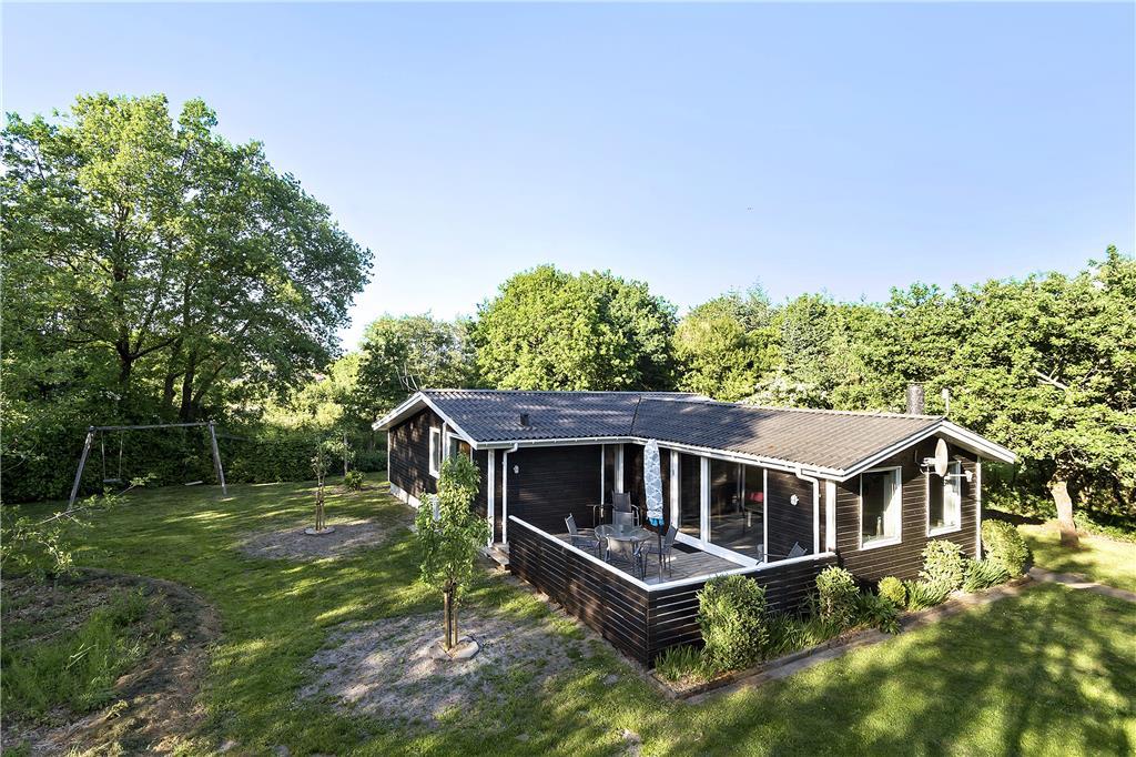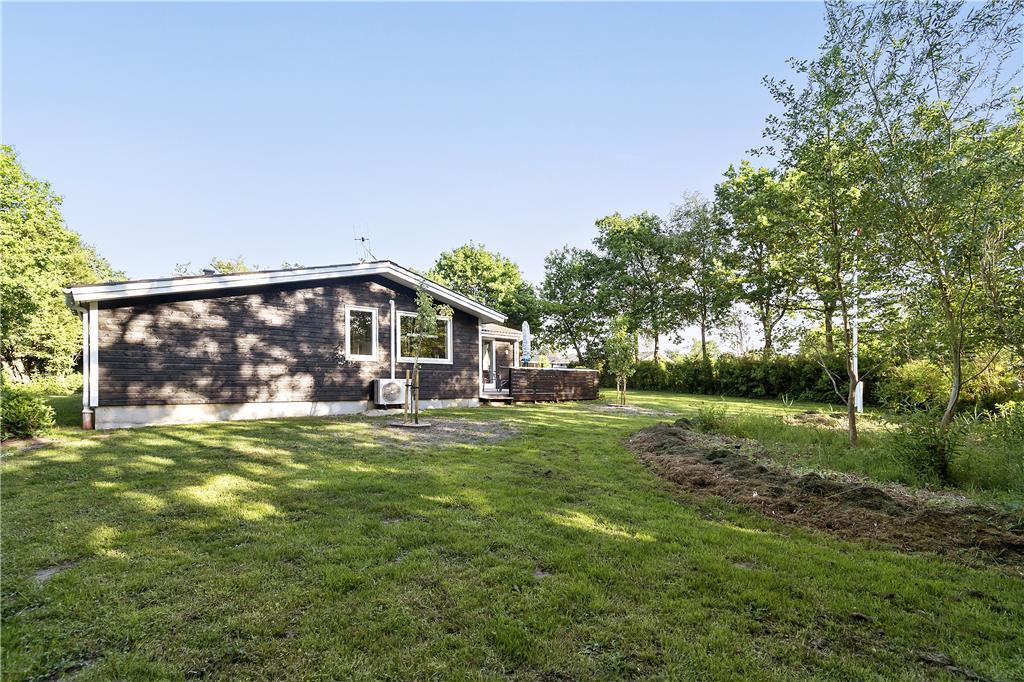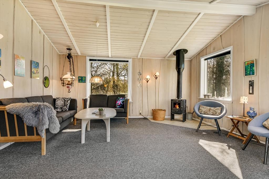 Det klassiske træsommerhus er senest blevet renoveret i 2018, så det præsenterer sig på pæn og velholdt vis. Inden døre er der lyse trælister på væggene og loft til kip, og lysindfaldet er godt – ikke mindst i stuen, hvor der er vinduer vendt mod både øst, syd og vest. Det betyder også, at I kan nyde udsigten til havens flotte løvtræer, når I slapper af i sofaen, hvilket er en dejlig påmindelse om, at I holder ferie i naturskønne og fredelige omgivelser. I stuen er der som før nævnt brændeovn, og i det åbne køkken-alrum er der varmepumpe, der både kan køle og varme alt efter behov. Badeværelsets sauna kan I tage i brug, hvis I trænger til at komme helt ned i tempo og langt væk fra hverdagen, mens tre soveværelser står klar, når det er sengetid.